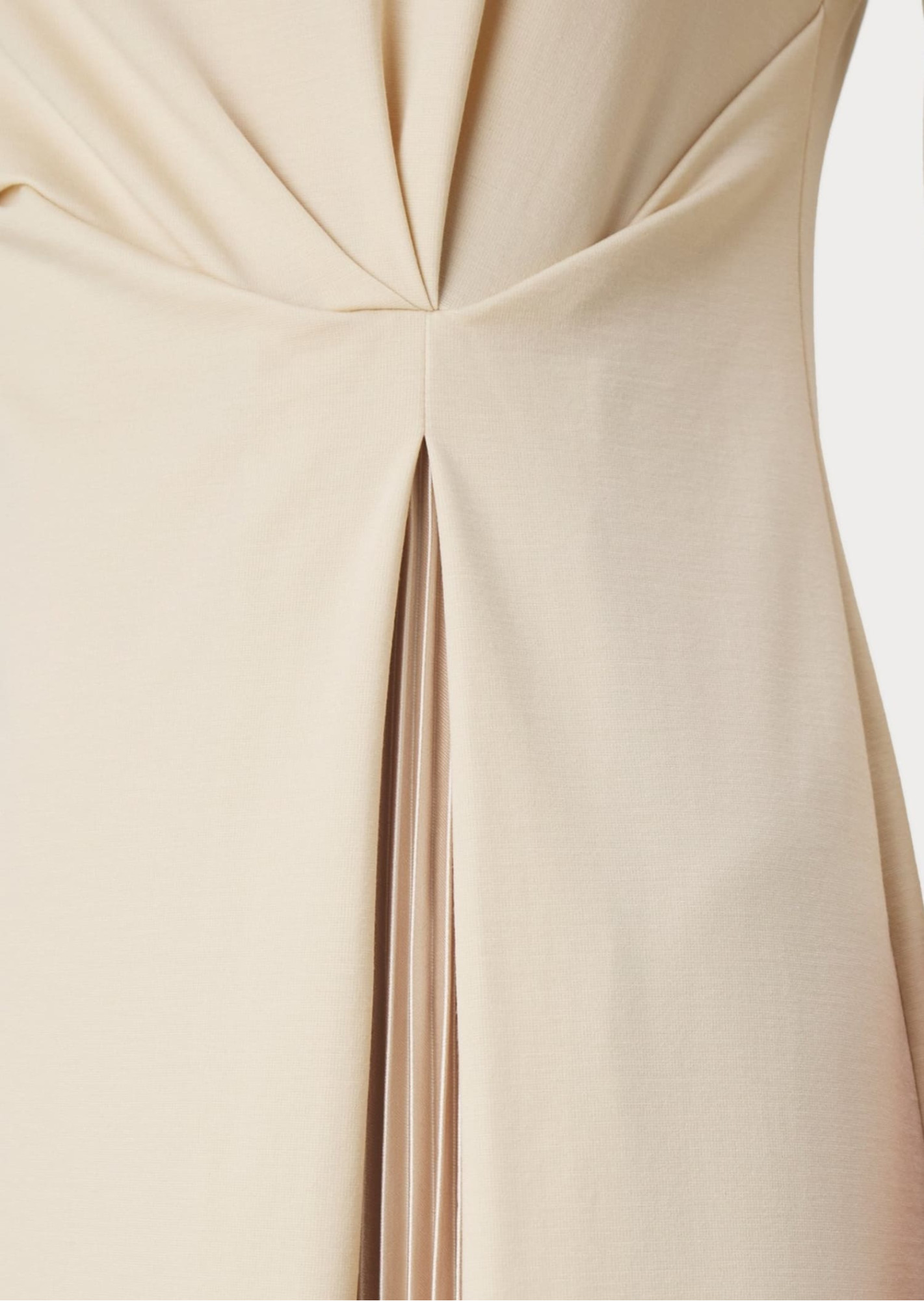 Довга сукня з круглим вирізом із м’якого трикотажу з ліоцелю має легку посадку та кльош. Лінія талії підкреслена асиметричними складками під грудьми та атласною виворітною складкою, яка надає спідниці невеликий об’єм. Має рукави 3/4.