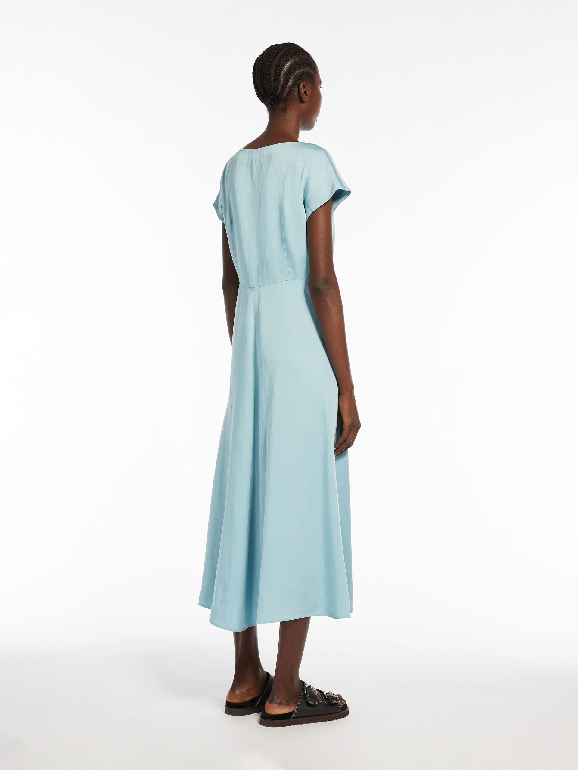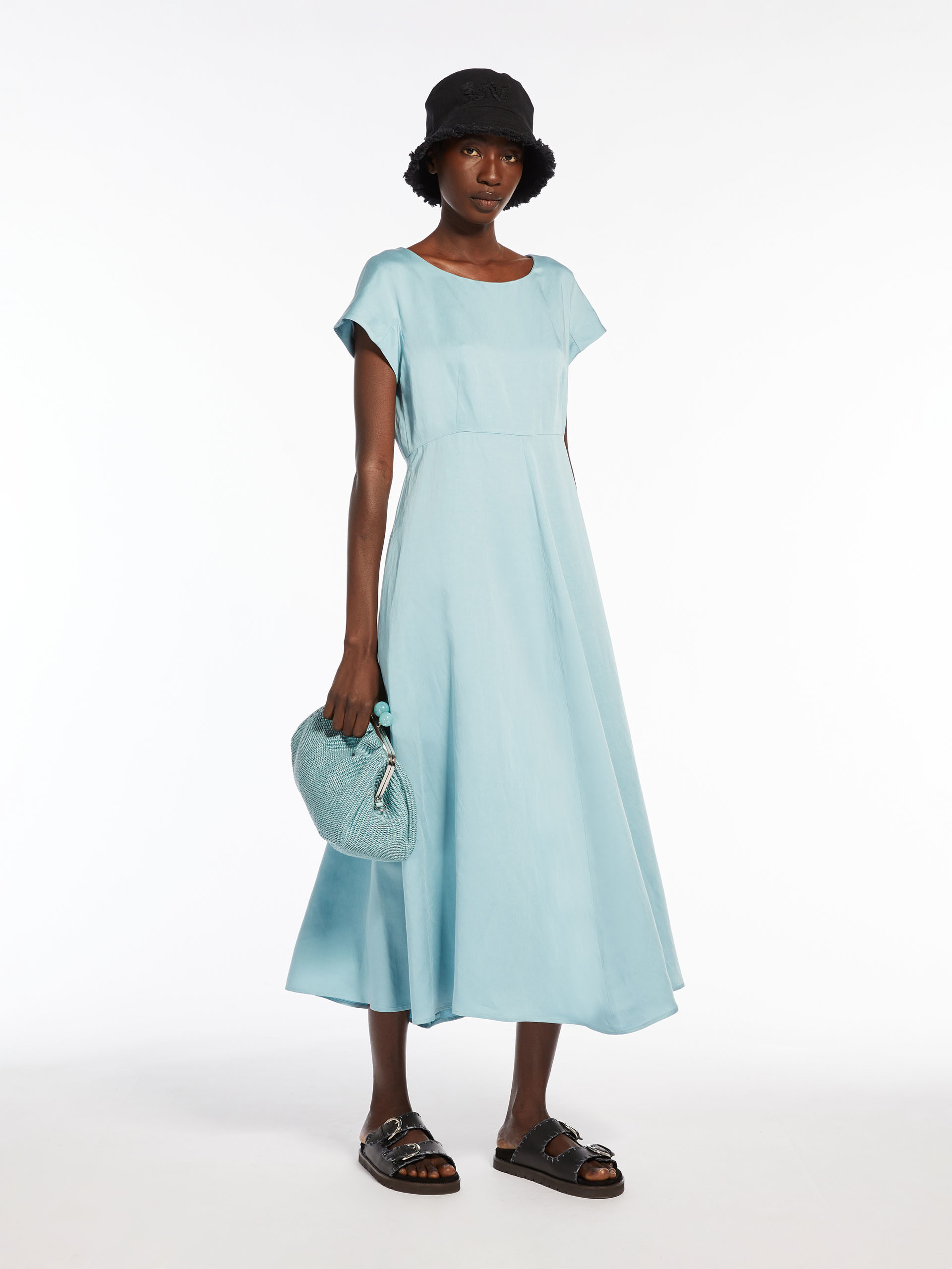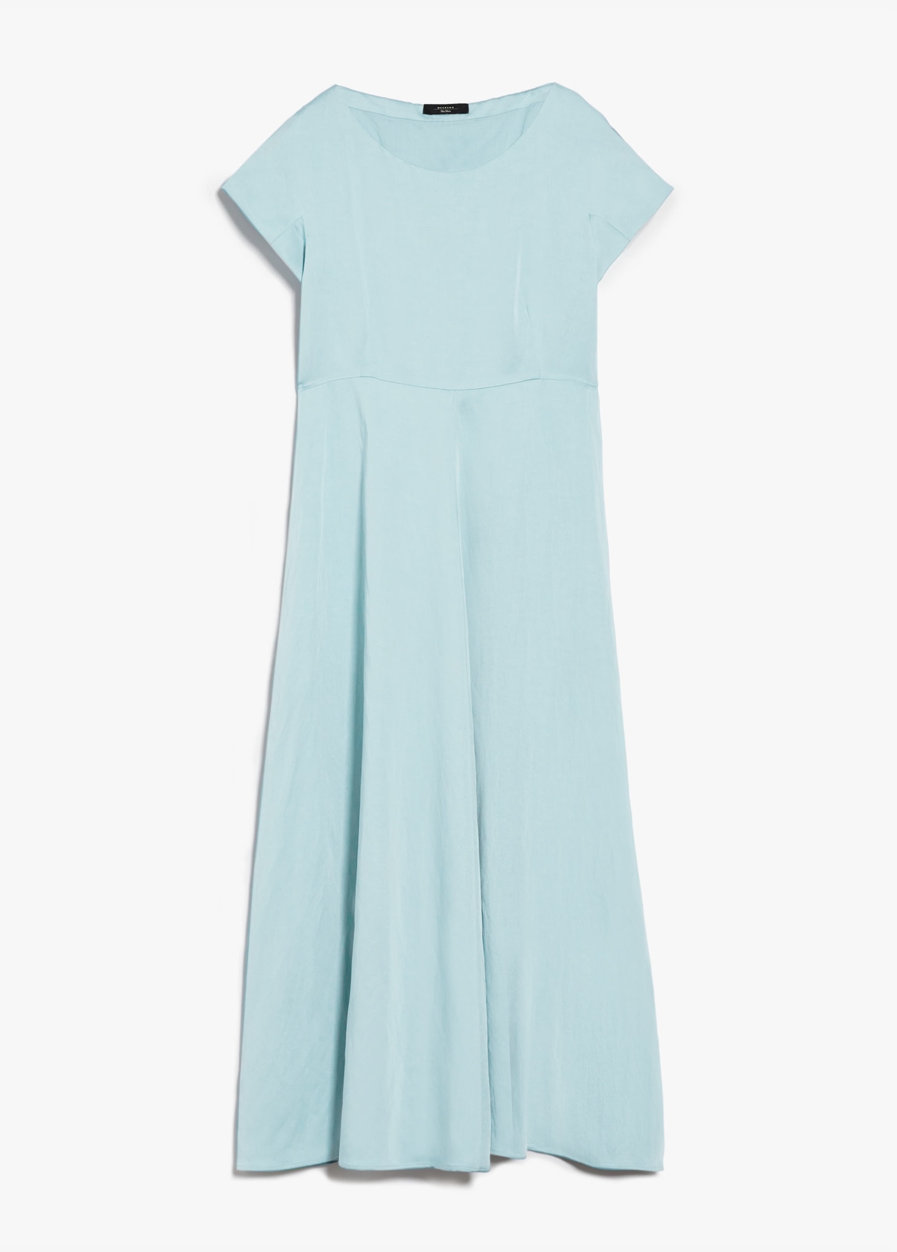 Сукня з вирізом-човником із віскози та льняного атласу, короткими рукавами-кімоно, бічними кишенями у швах і пишною спідницею. Вільна посадка, яка підкреслює вигнуту талію.