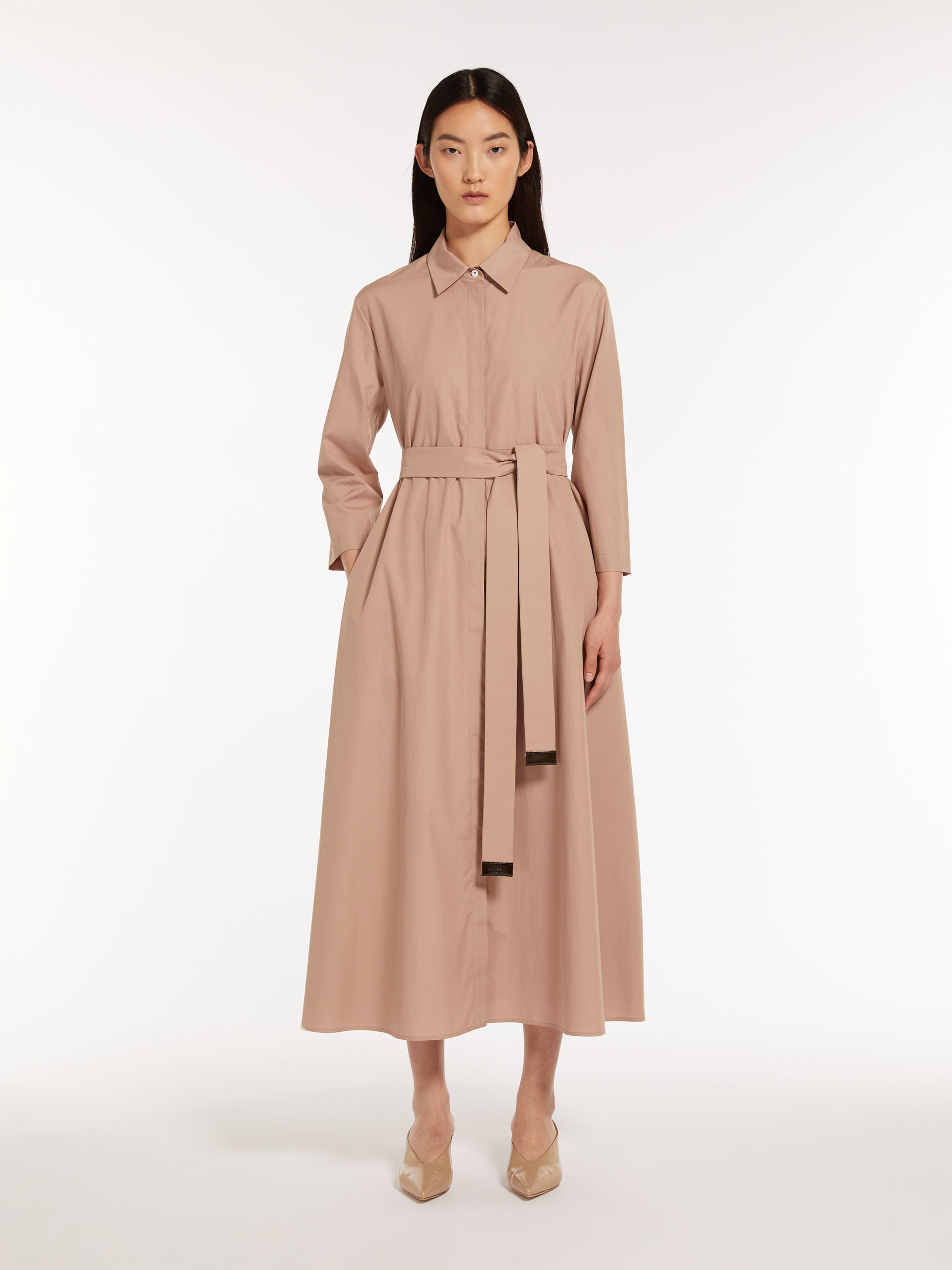 Сукня-сорочка міді з чистого бавовняного попліну класичного силуету з сорочковим коміром, розкльошеною спідницею та вставними бічними кишенями. Ремінь в тон із шкіряними наконечниками дозволяє підкреслити талію. Потайна застібка на гудзики спереду.