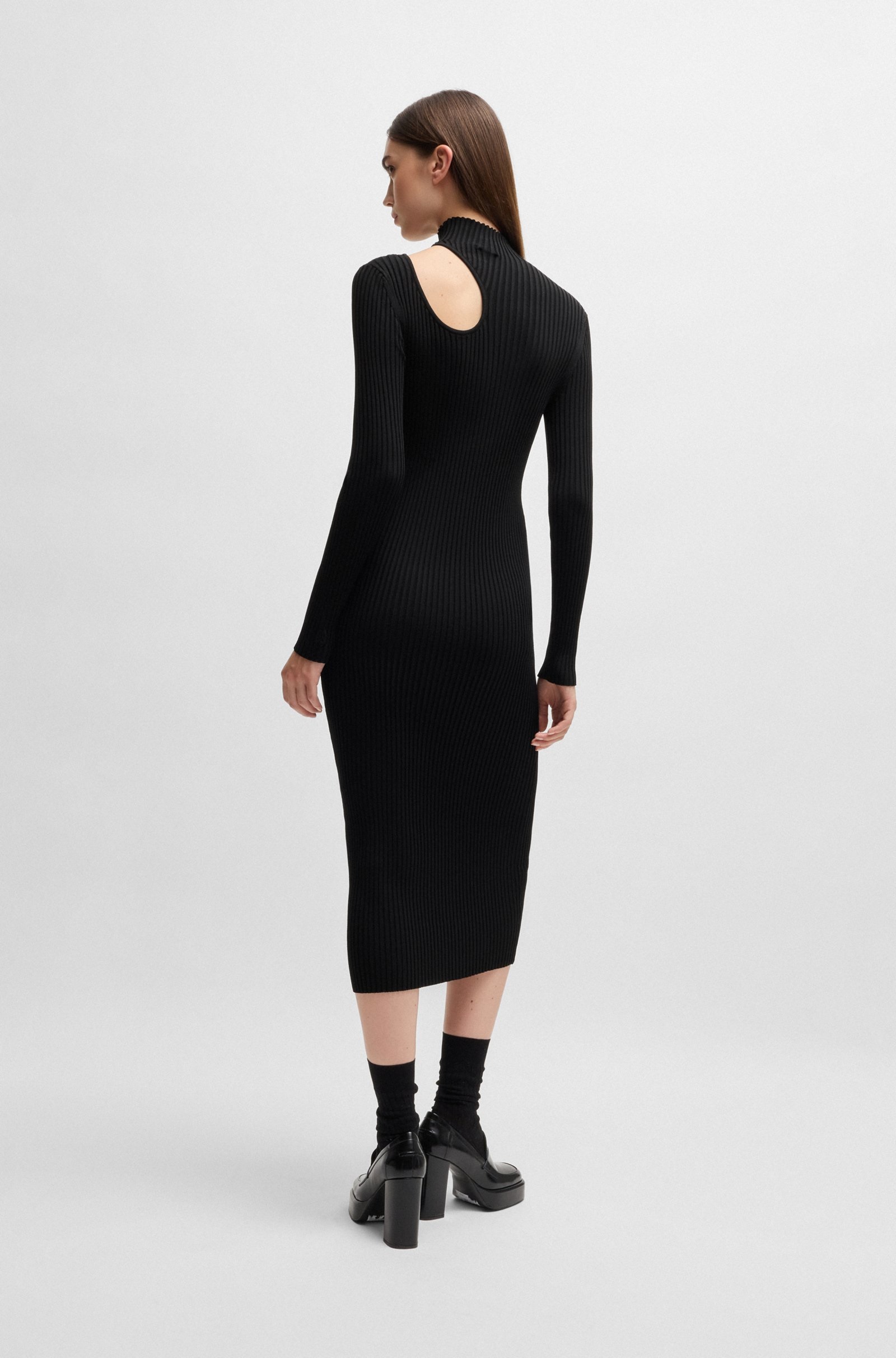 Сукня-труба з довгими рукавами від Hugo - ваш вибір для шикарного вечірнього виходу. Має гладкий комір-стійку, виріз на плечі та ребристу крепову тканину. Довжина міді.