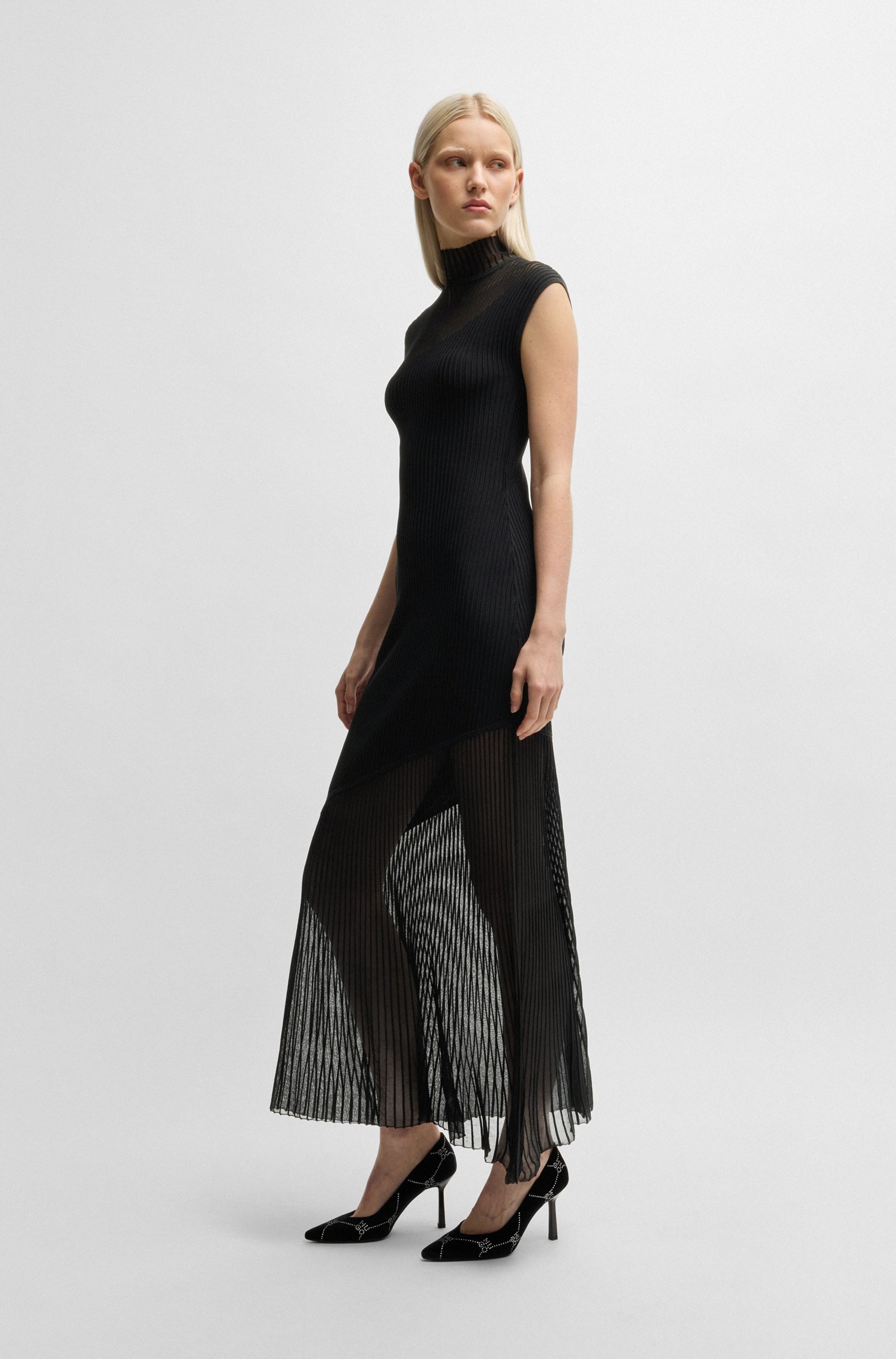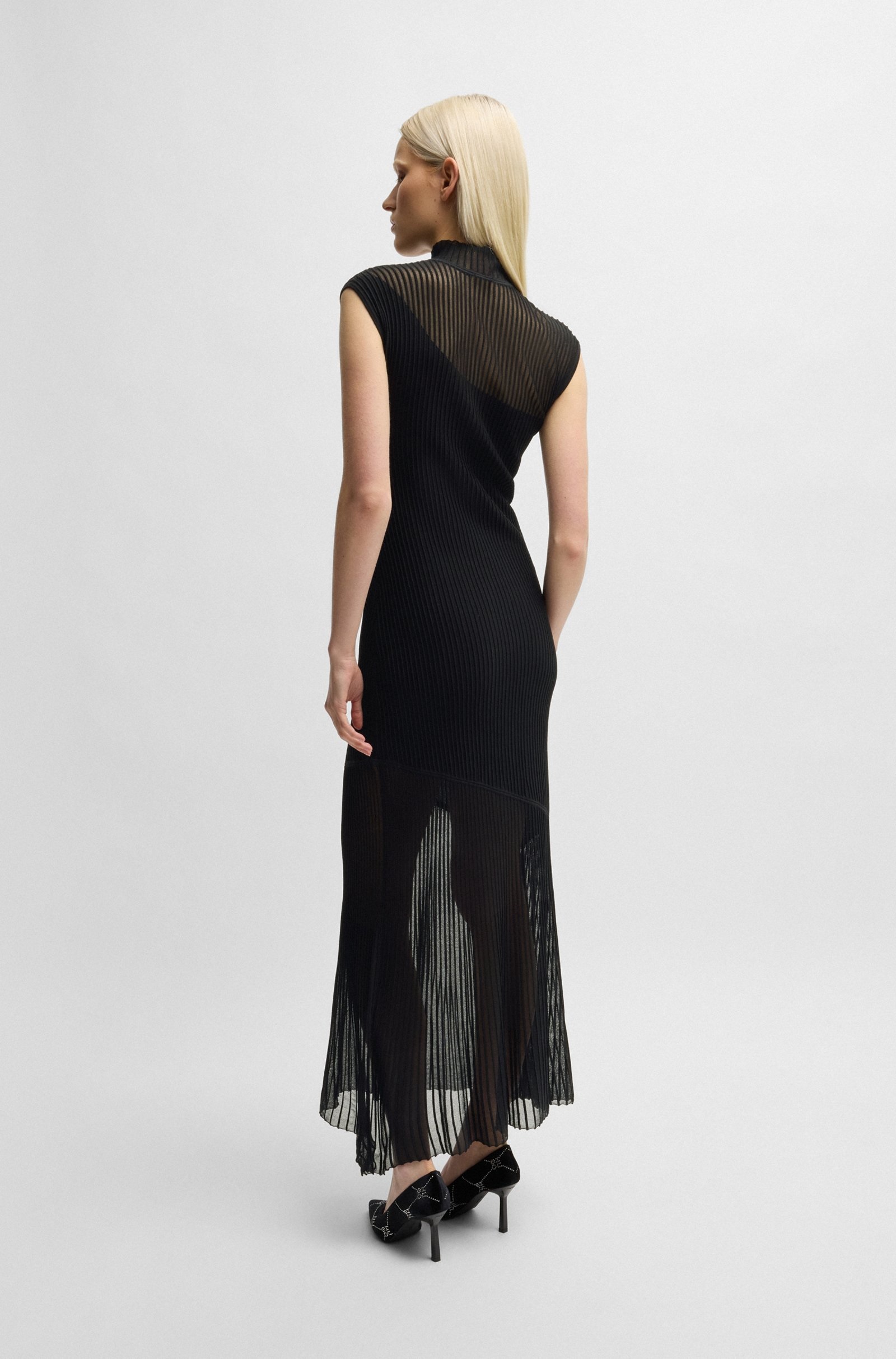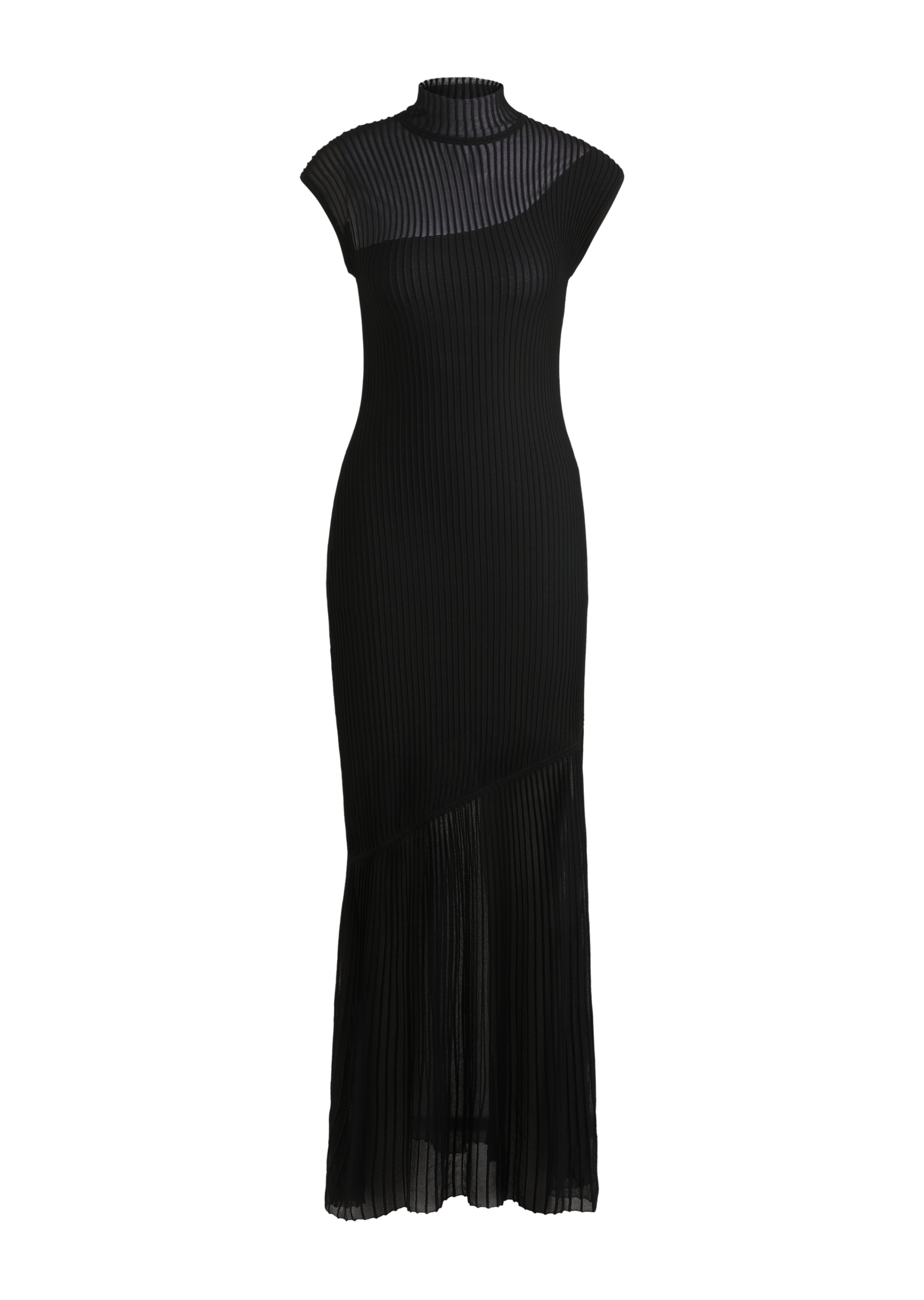 Довга сукня з крепу в рубчик і з прозорими деталями. Ребриста структура додає особливого шарму, а облягаючий крій підкреслює жіночність. Ідеально підходить для вечірок.
