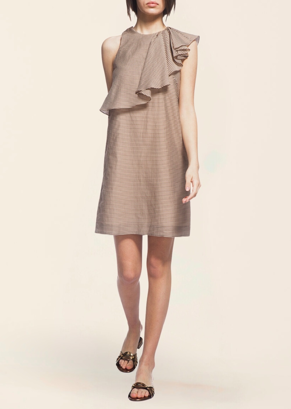 Сукня у коричневу клітинку з бавовняного сатину поєднує комфорт і стиль. А-силует і міді-довжина підкреслюють жіночність, а оригінальний асиметричний комір додає родзинки. Ця сукня чудово пасуватиме як для прогулянок, так і для особливих моментів.