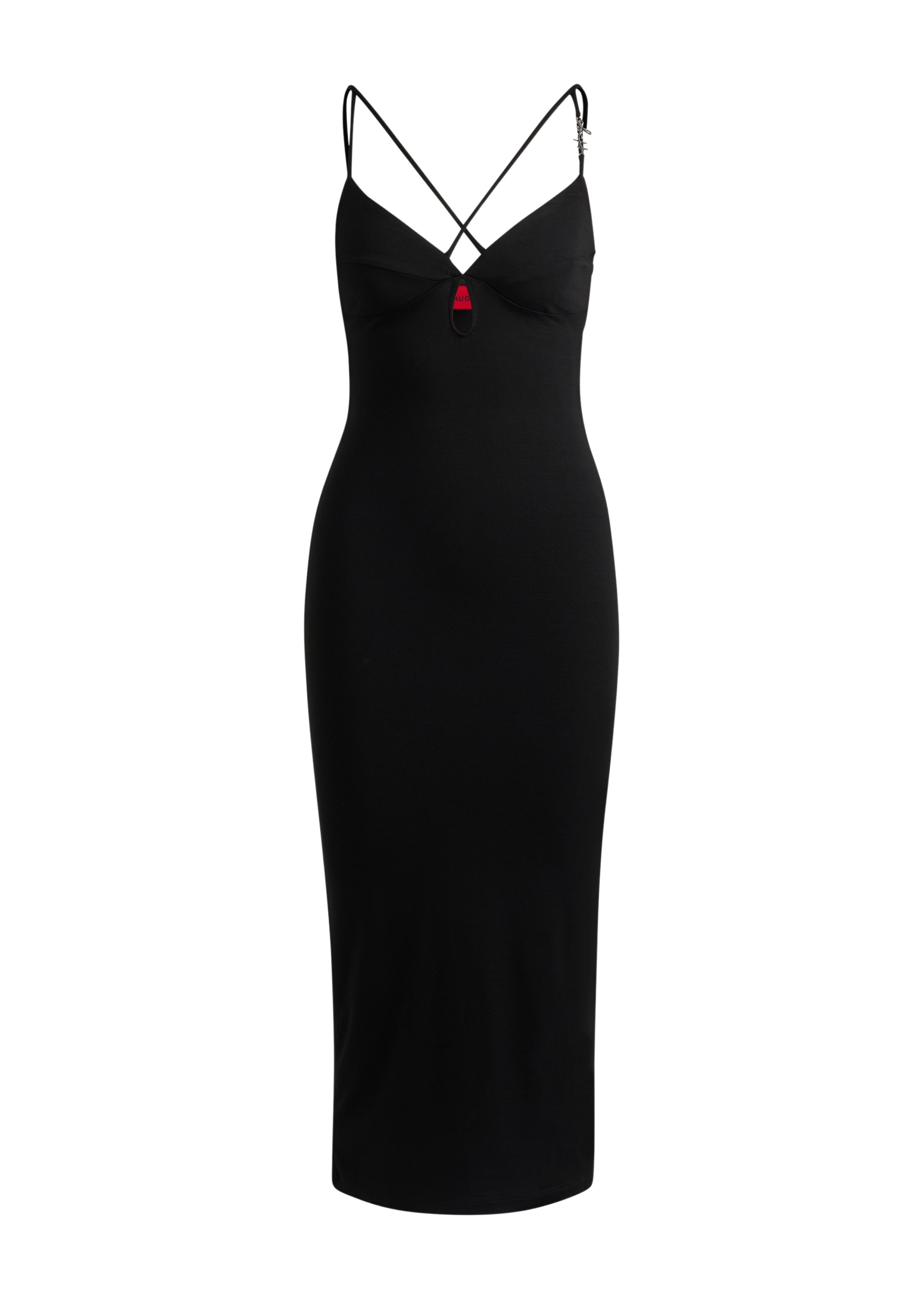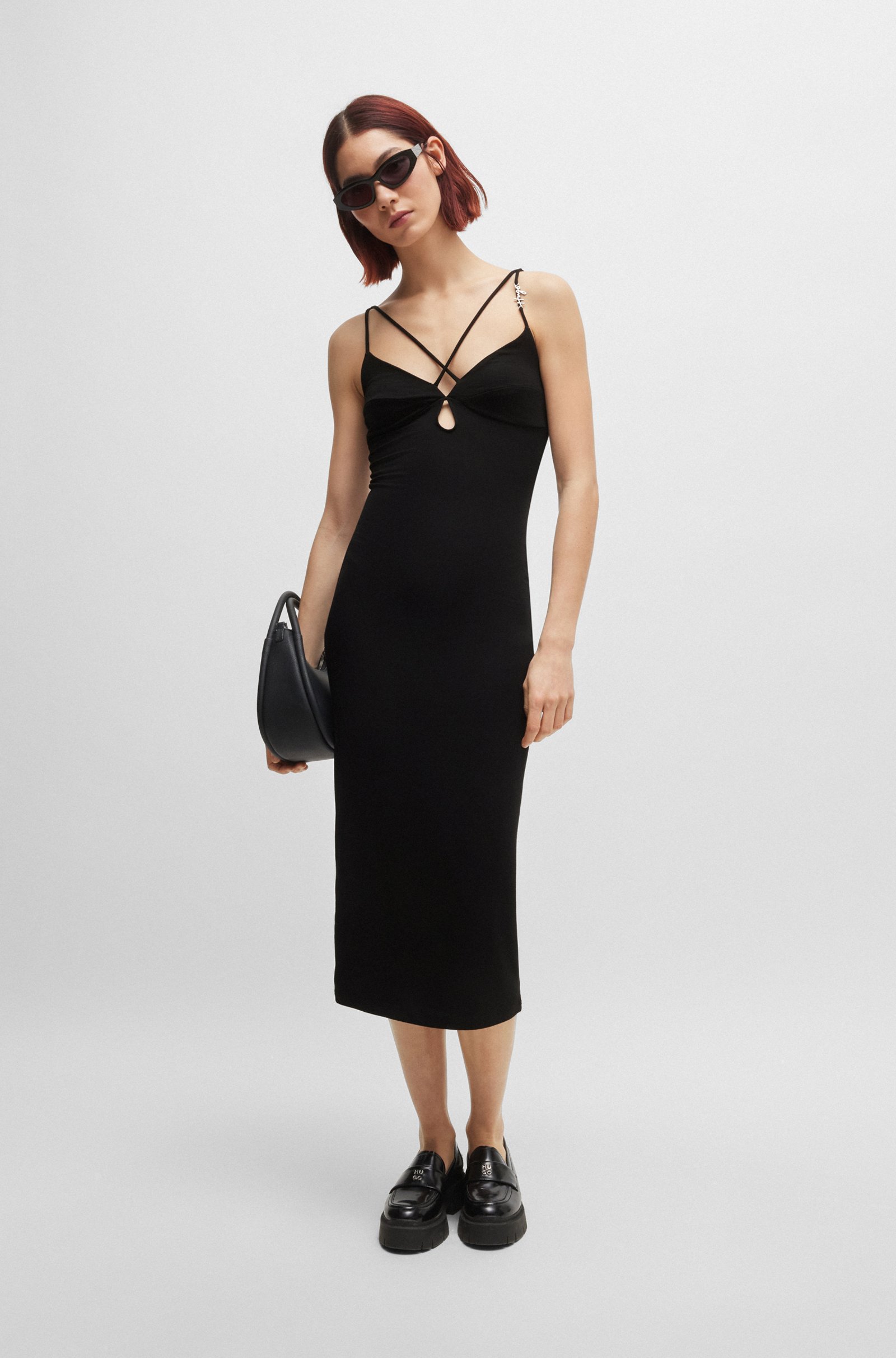 Сукня стандартного крою. Модель з еластичного трикотажу з металевим оздобленням логотипу доповнена унікальними подвійними бретелями.