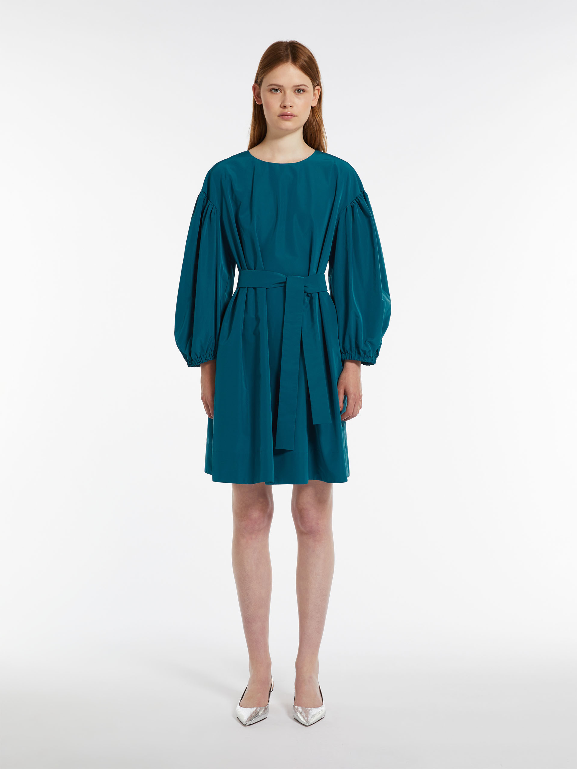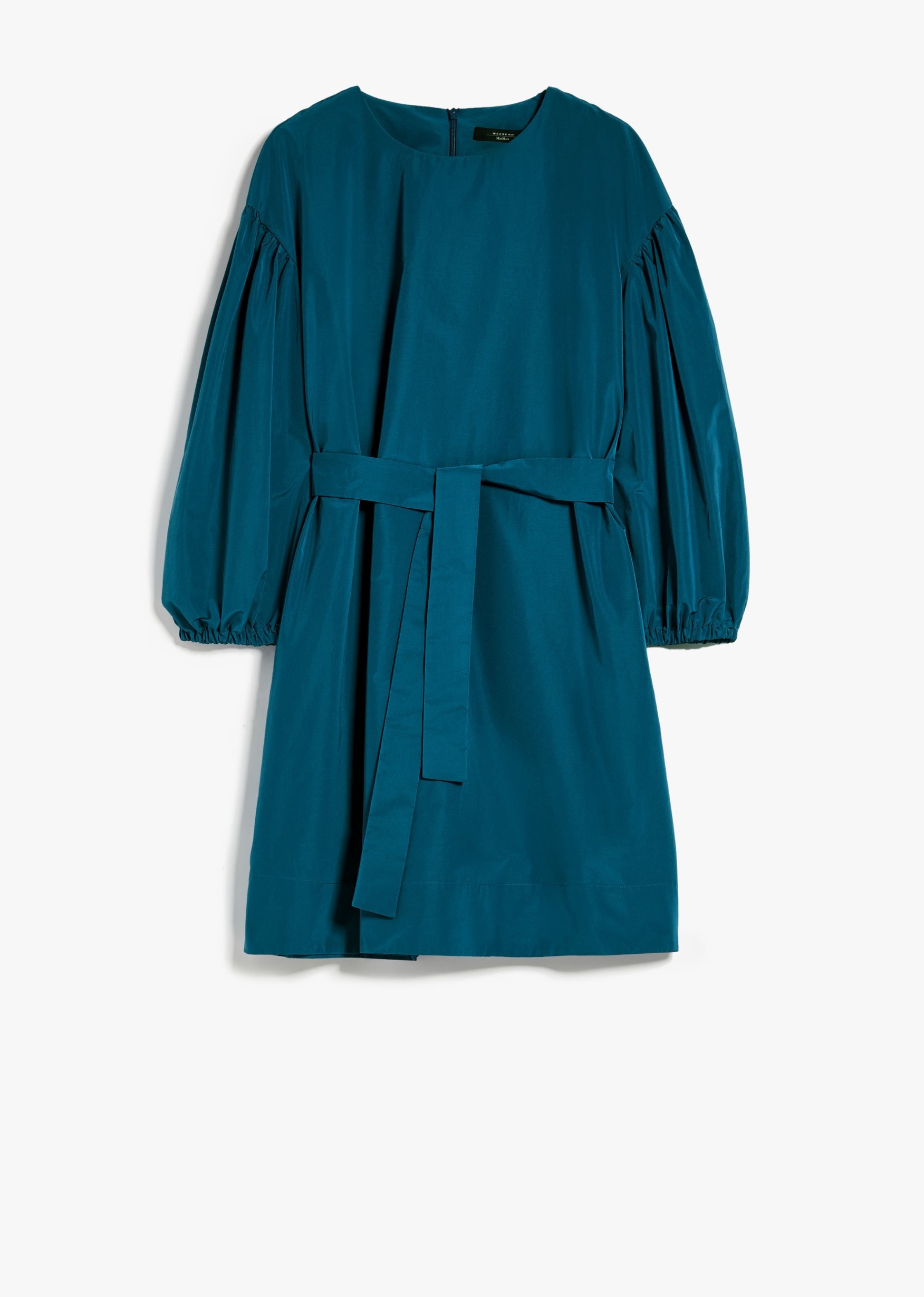 Сукня міді великого розміру з легкої бавовняної тафти. Модель має горловину човник, вшиті бічні кишені та широкі рукави 3/4 зі спущеними плечима та зібраними манжетами. Пояс у тон, що підкреслює лінію талії, створює м’які драпіровані деталі. Потайна блискавка ззаду.