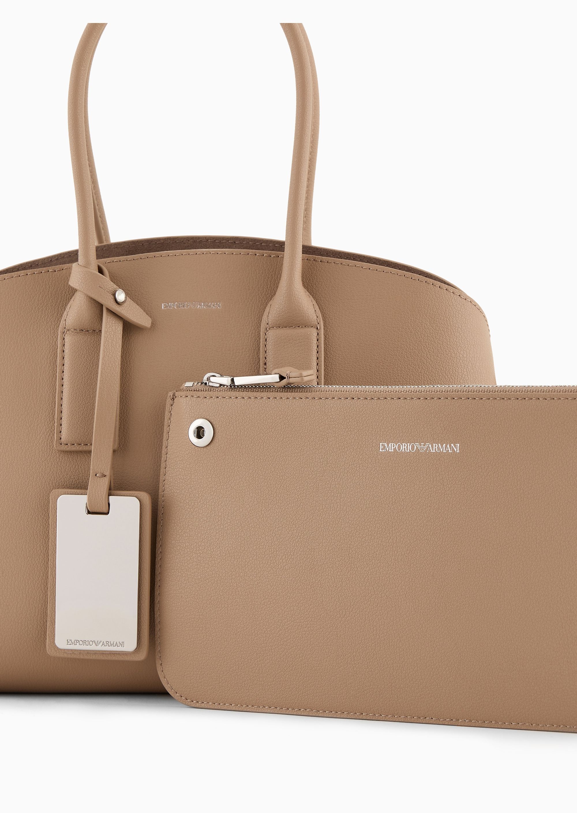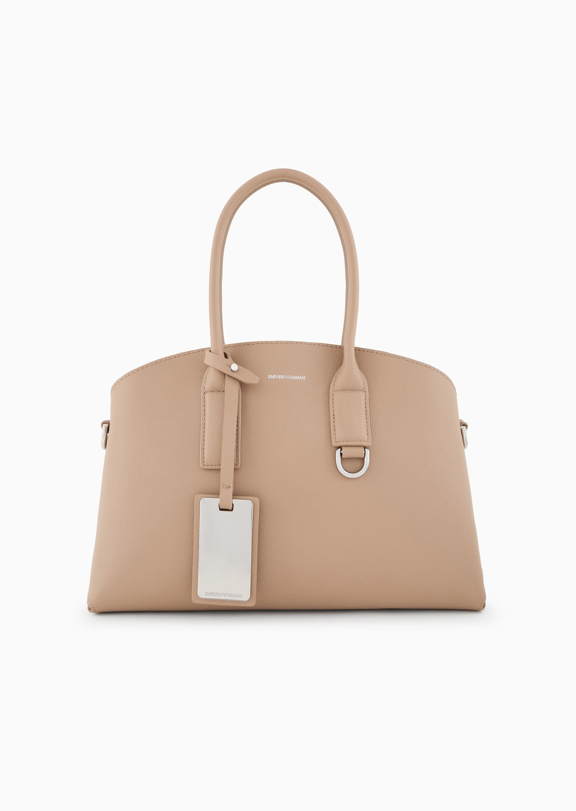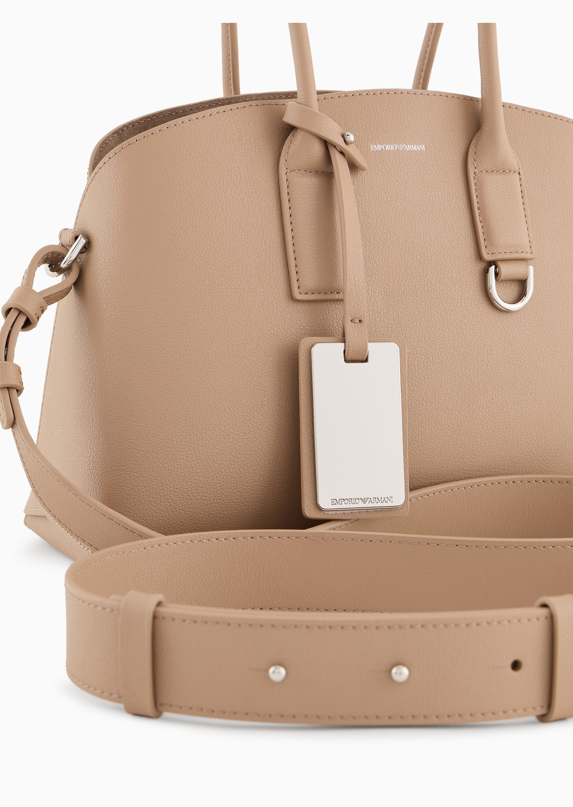 Середня сумка з регенерованої шкіри з плечовим ременем та подвійною ручкою, з трафаретним логотипом спереду. Кожен виріб із регенерованої шкіри є результатом екологічно стійкого процесу, який повторно використовує залишки шкіри, обробляється та збирається без використання будь-якого клею та дуже свідомо економить воду. Не витрачаючи ресурси, ця шкіра стає екологічно чистим матеріалом, але при цьому зберігає ті ж якості справжньої шкіри, як на вигляд, так і на дотик. Сумка містить зручний внутрішній знімний мішечок, який можна прикріпити або відєднати від сумки за бажанням. Цей аксесуар належить до капсульної колекції Icon: сутність Emporio Armani, що пропонує сучасну інтерпретацію ДНК бренду шляхом оновлення знакових форм та обсягів його минулого, спрямованого на утвердження класичної, вічнозеленої чарівності.