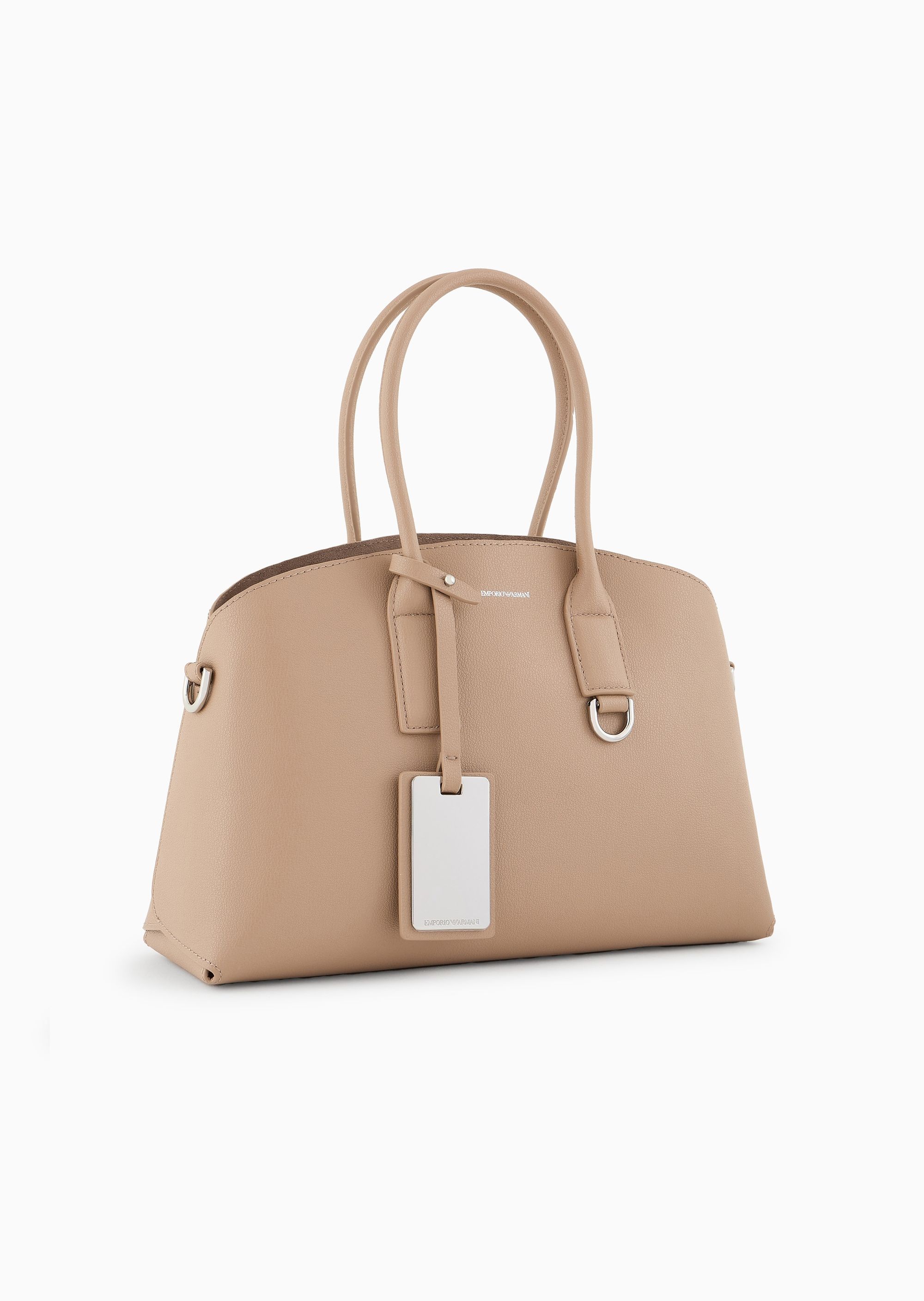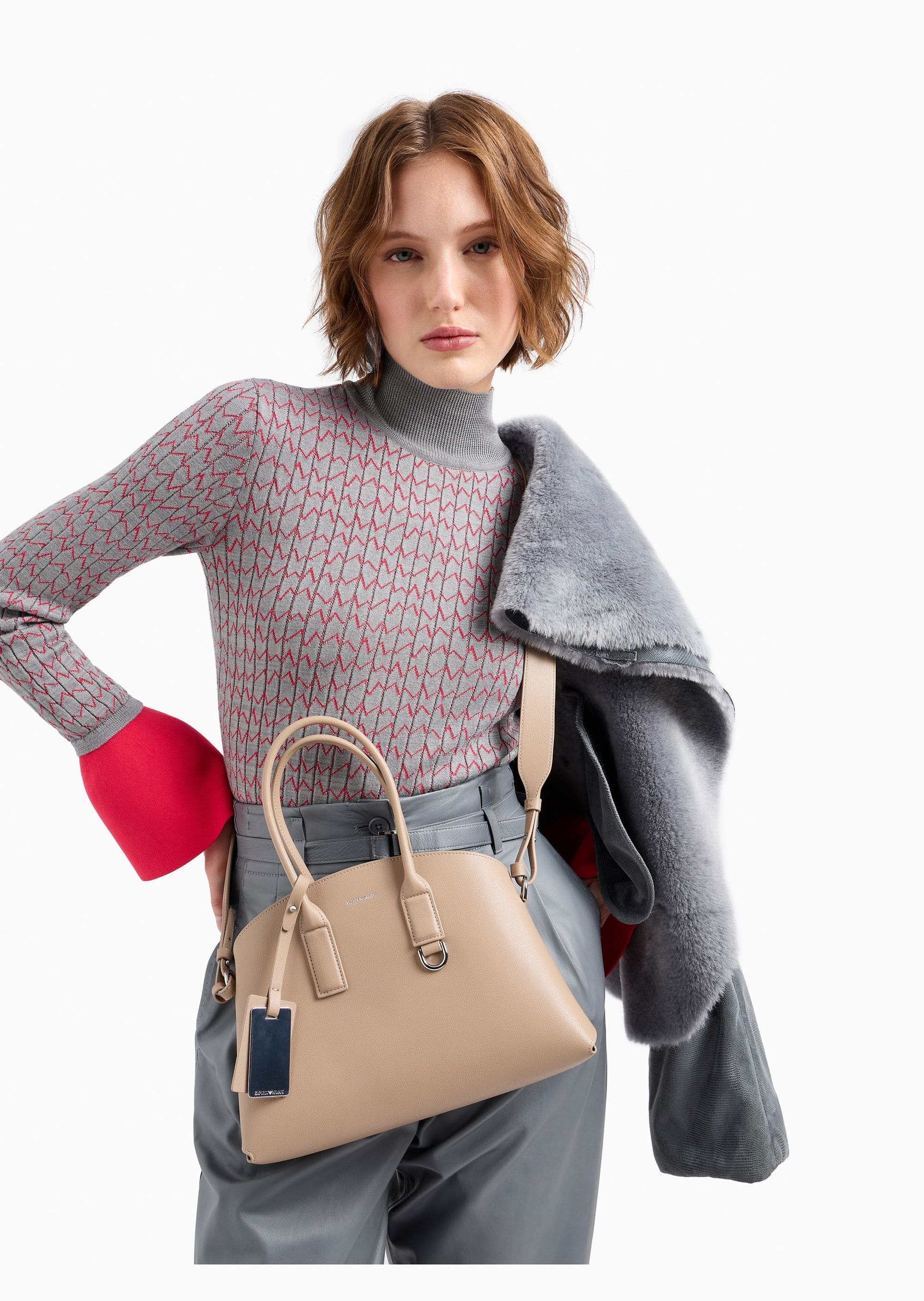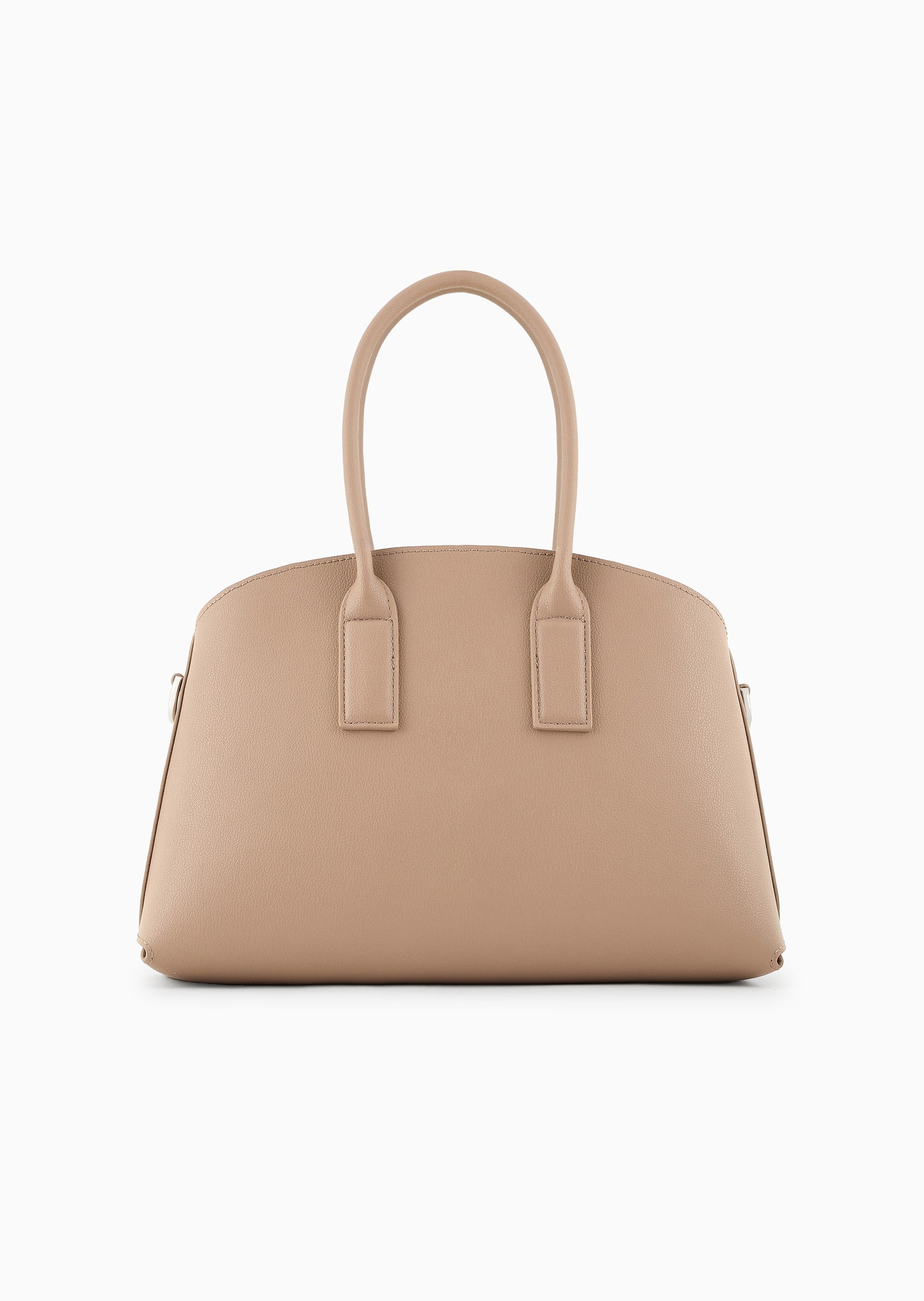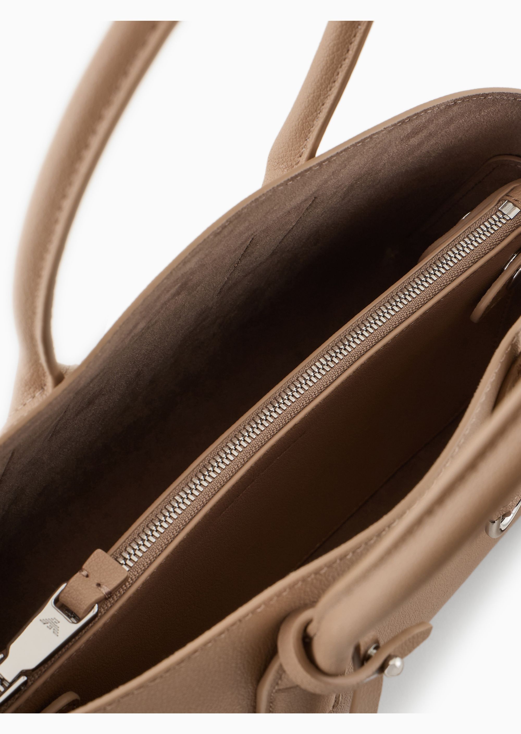 Середня сумка з регенерованої шкіри з плечовим ременем та подвійною ручкою, з трафаретним логотипом спереду. Кожен виріб із регенерованої шкіри є результатом екологічно стійкого процесу, який повторно використовує залишки шкіри, обробляється та збирається без використання будь-якого клею та дуже свідомо економить воду. Не витрачаючи ресурси, ця шкіра стає екологічно чистим матеріалом, але при цьому зберігає ті ж якості справжньої шкіри, як на вигляд, так і на дотик. Сумка містить зручний внутрішній знімний мішечок, який можна прикріпити або відєднати від сумки за бажанням. Цей аксесуар належить до капсульної колекції Icon: сутність Emporio Armani, що пропонує сучасну інтерпретацію ДНК бренду шляхом оновлення знакових форм та обсягів його минулого, спрямованого на утвердження класичної, вічнозеленої чарівності.
