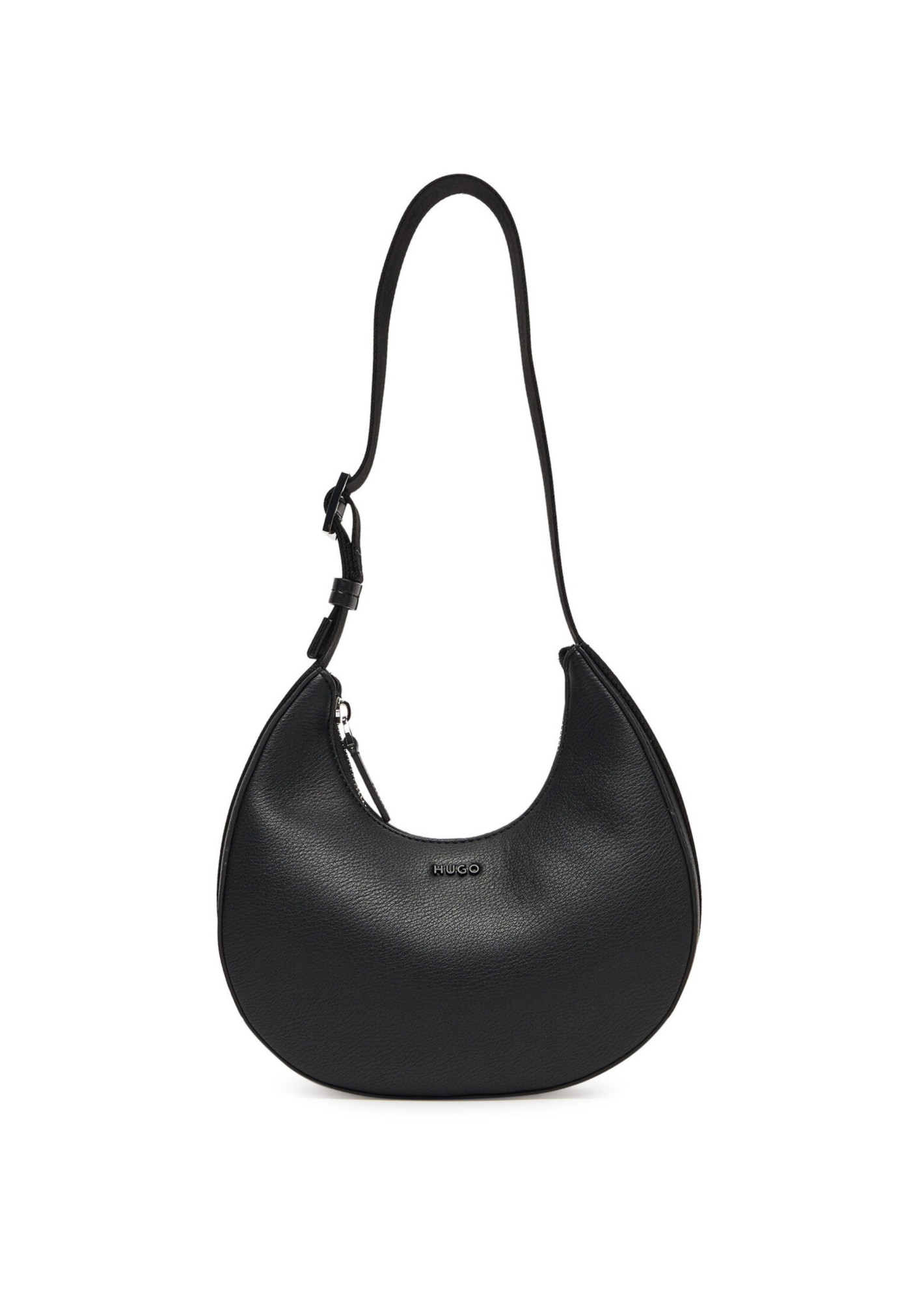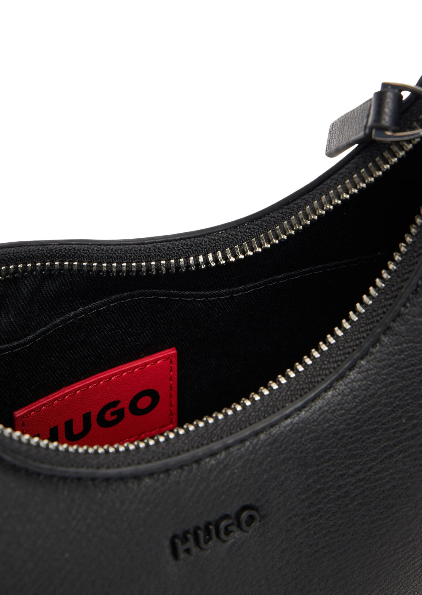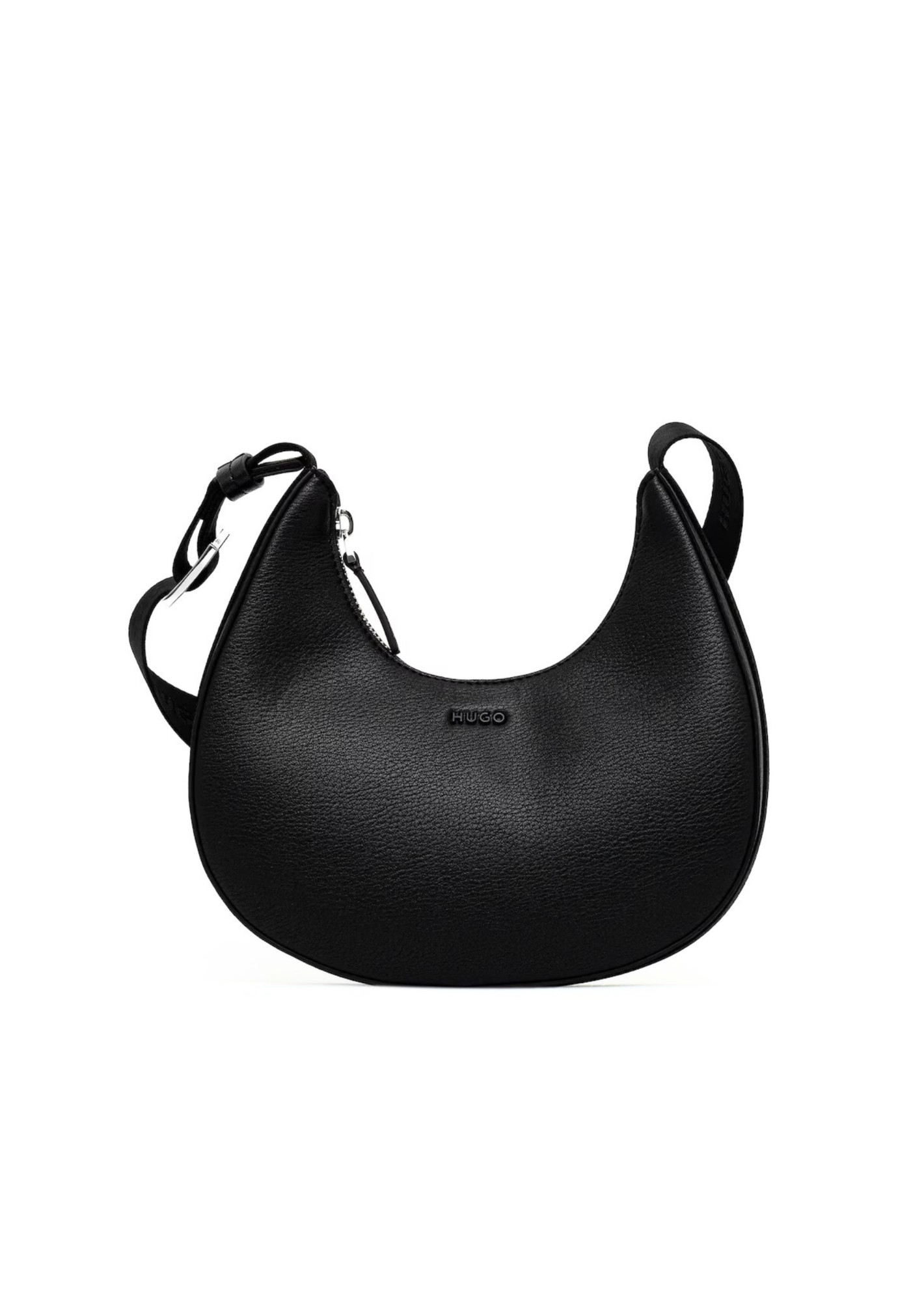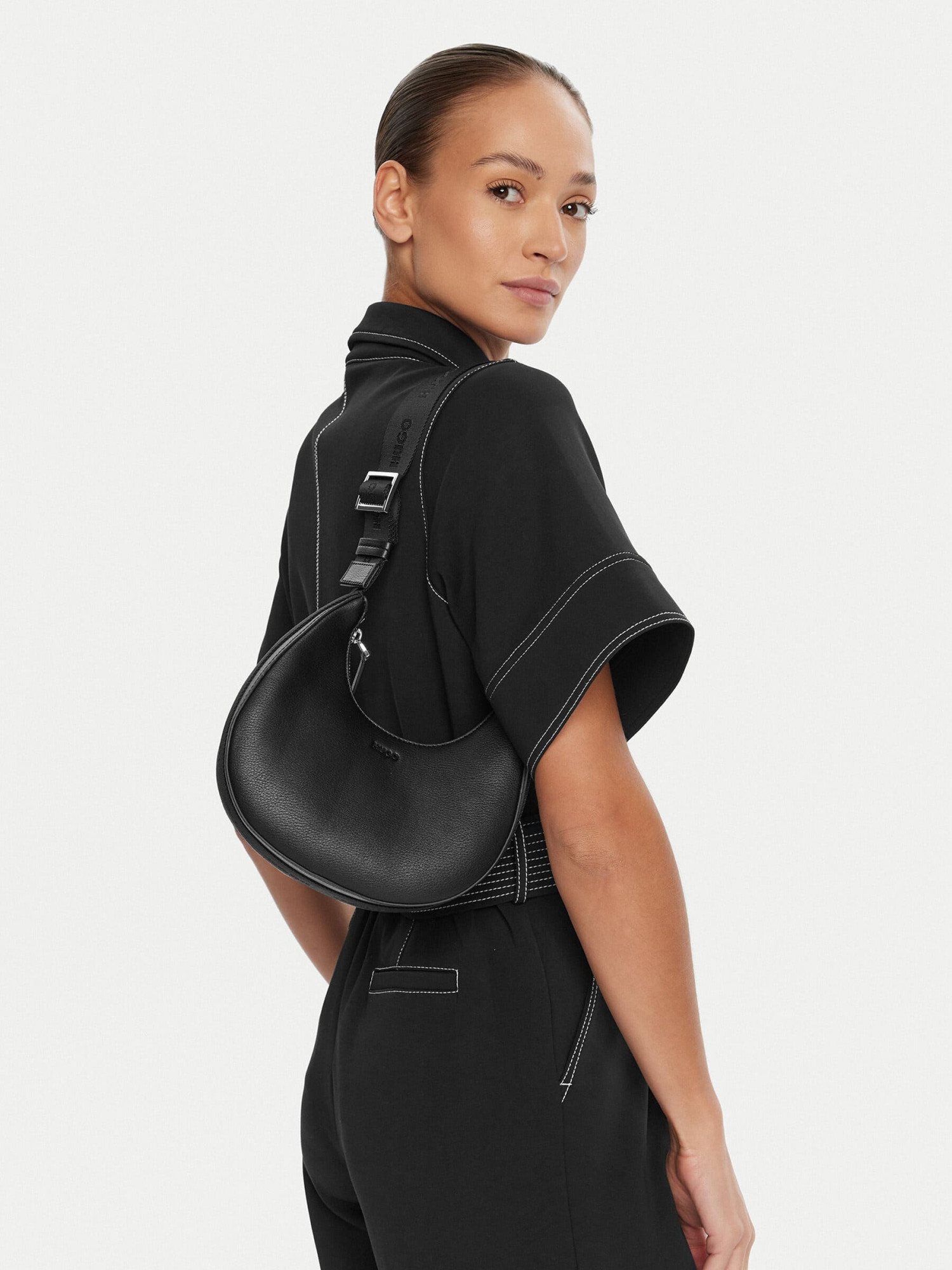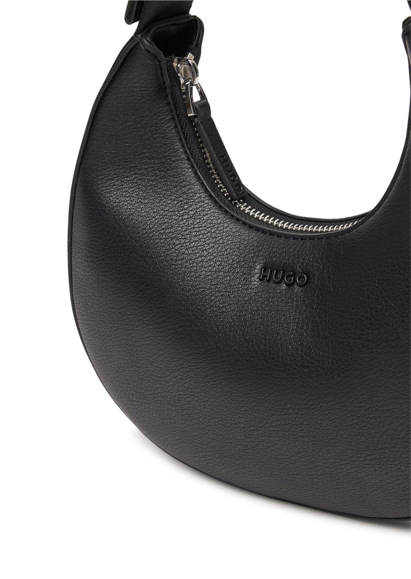 Сумка HUGO чорного кольору виготовлена з фактурного штучного матеріалу з матовим ефектом, що надає аксесуару вишукану щільність. Мінімалістична металева фурнітура з логотипом у ніжному сріблястому тоні підкреслює упізнаваний стиль бренду. Верхня блискавка та регульований ремінець забезпечують зручність і надійність у повсякденному користуванні. Компактні розміри та внутрішня кишеня дозволяють структуровано зберігати необхідні дрібниці без зайвої громіздкості. Сумка HUGO стає лаконічним акцентом образу, поєднуючи функціональність із екологічною естетикою.