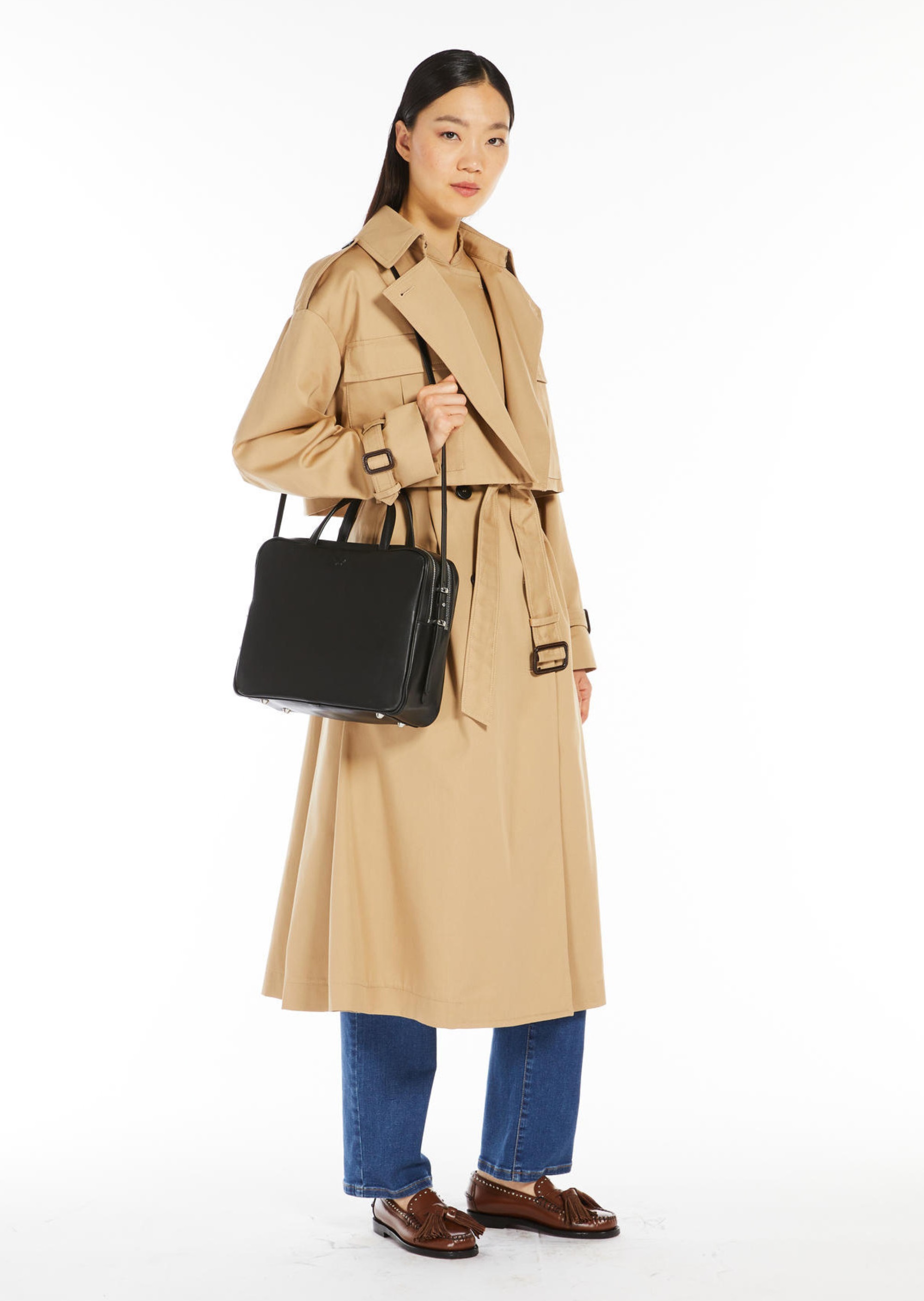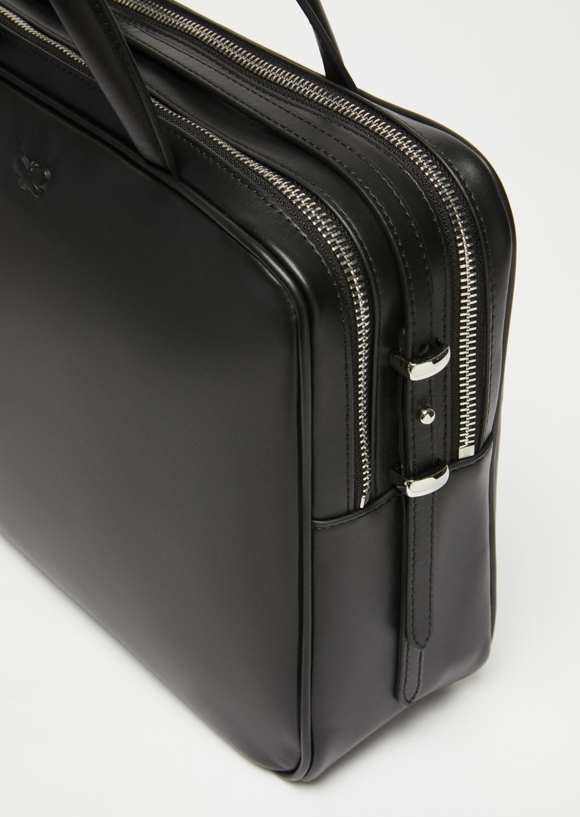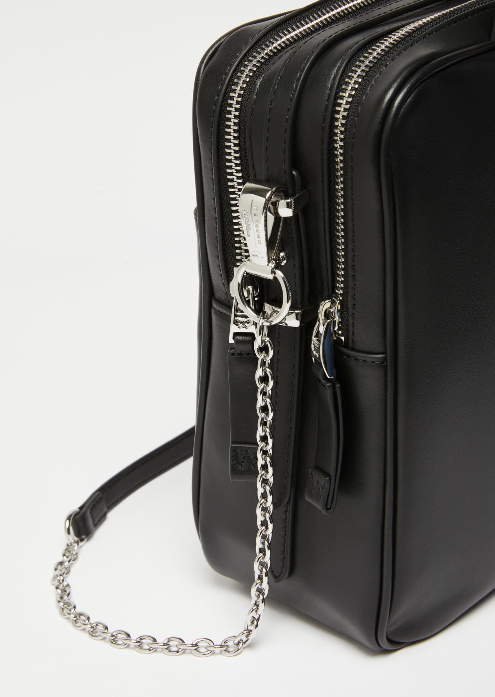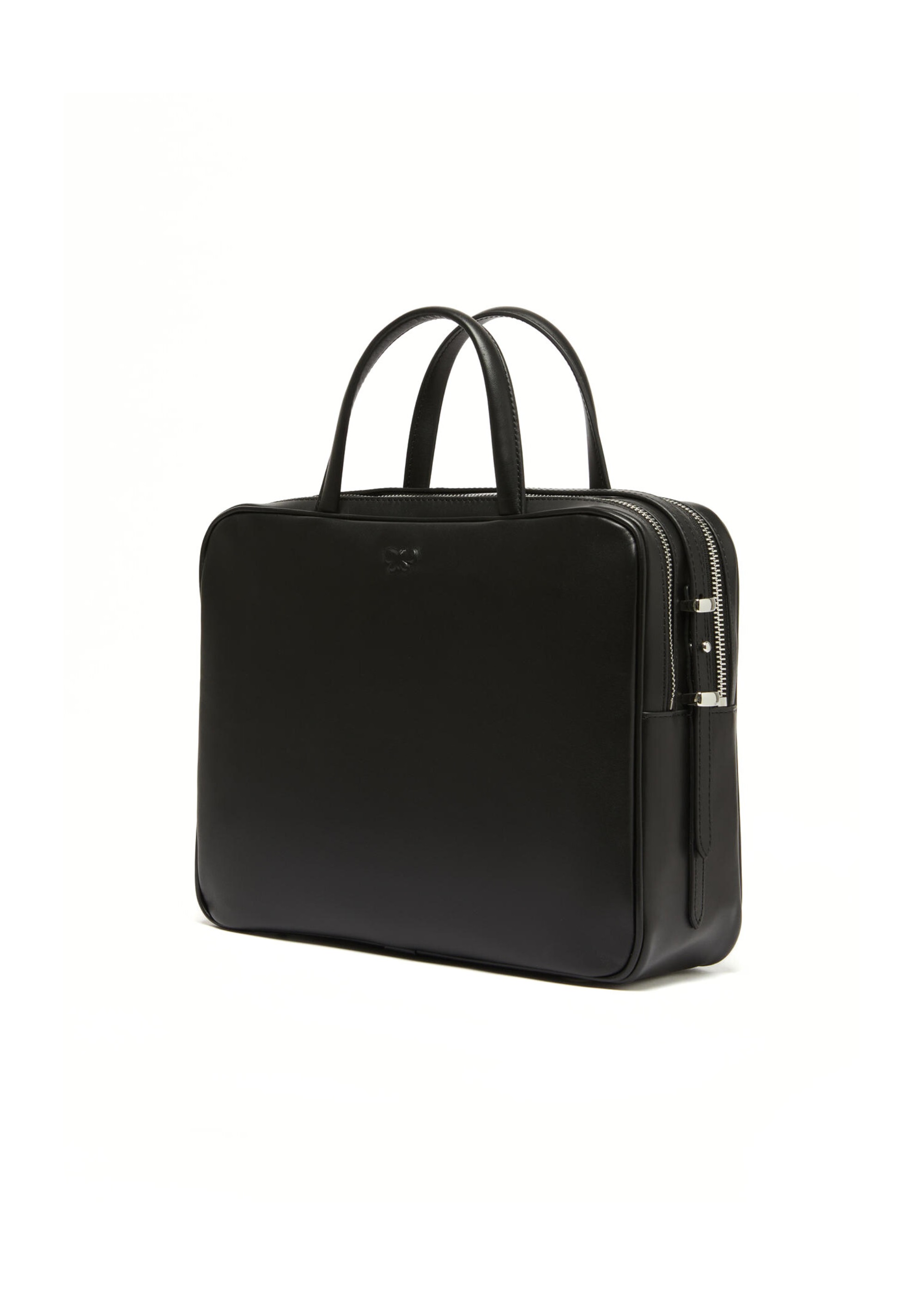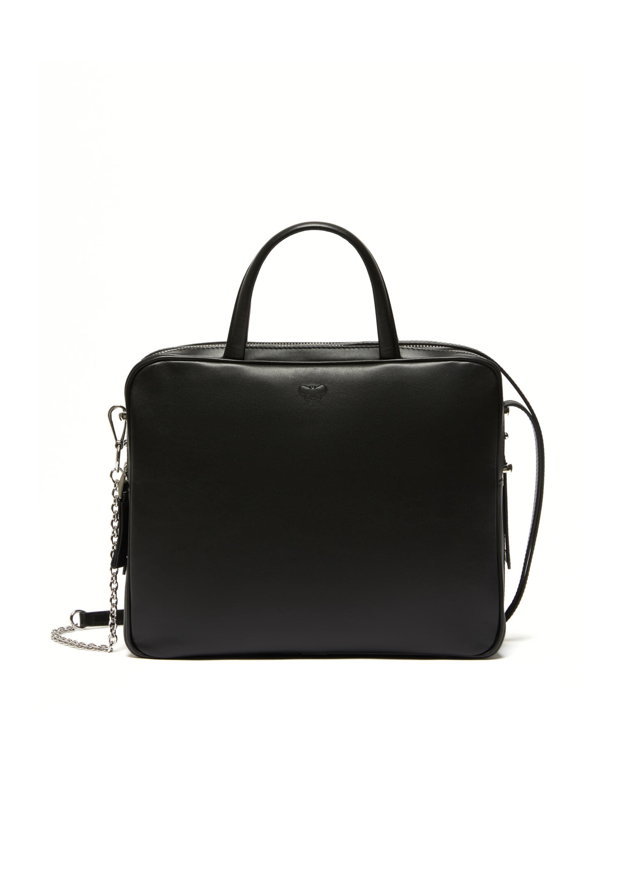 Середня сумка від Max Mara Weekend виготовлена зі шкіри чорного кольору. Універсальна модель оснащена двома бічними відділеннями на блискавці у верхній частині та подвійними ручками з гладкої шкіри. На внутрішній підкладці є кишеня з клапаном і кишеня на блискавці. Аксесуар прикрашений тисненим логотипом метелика спереду. Сумку можна носити на руці або як кросбоді. Зручна, базова модель завершить будь-який ообраз та додасть йому шарму.