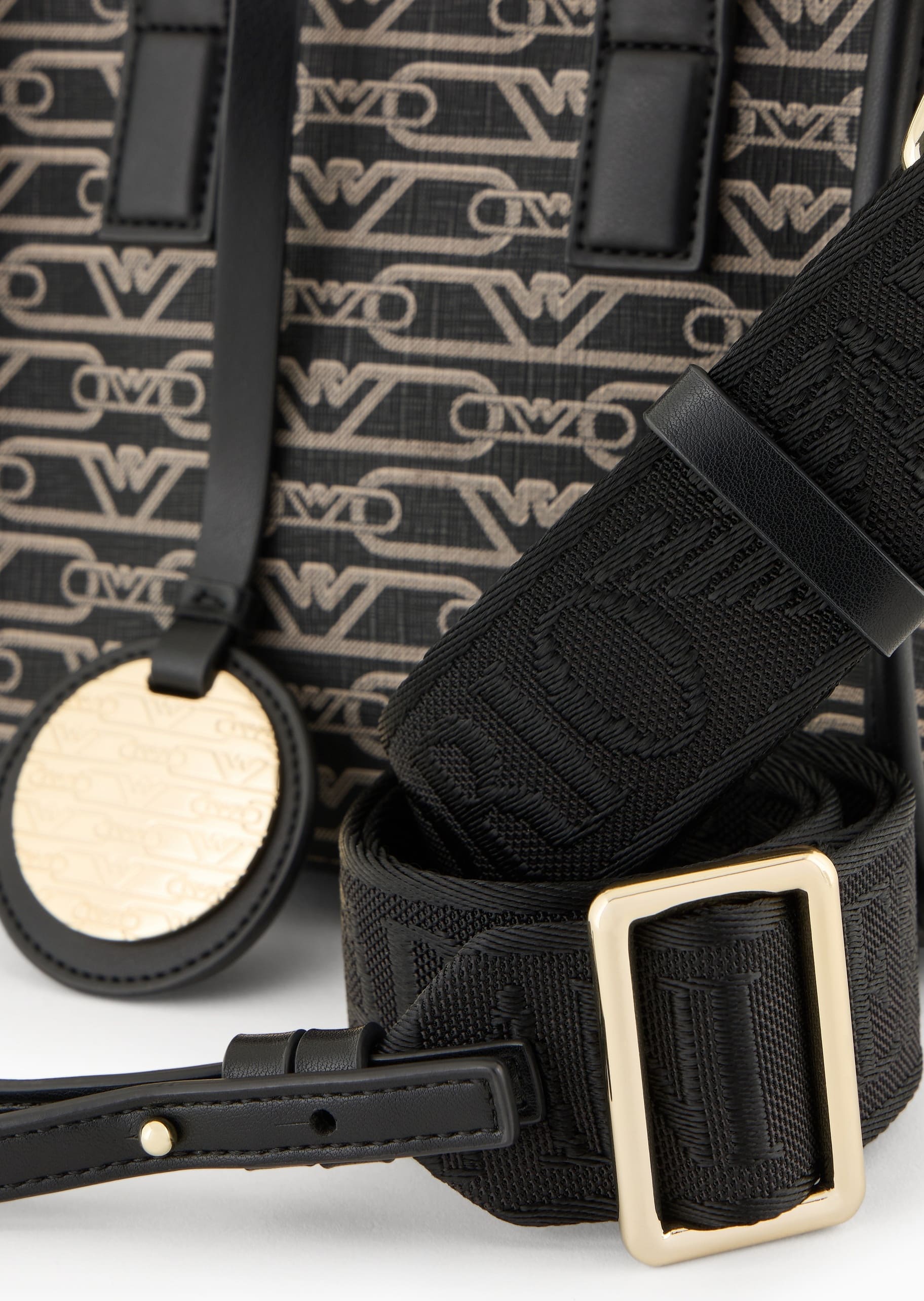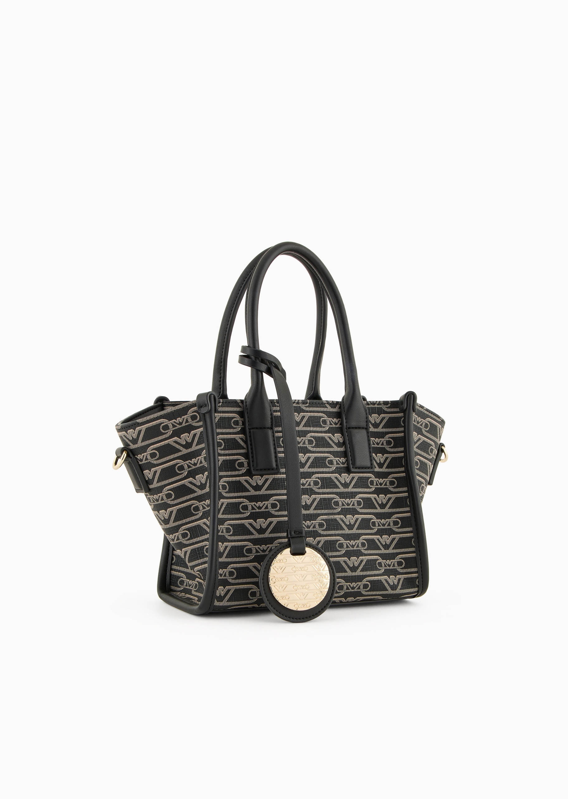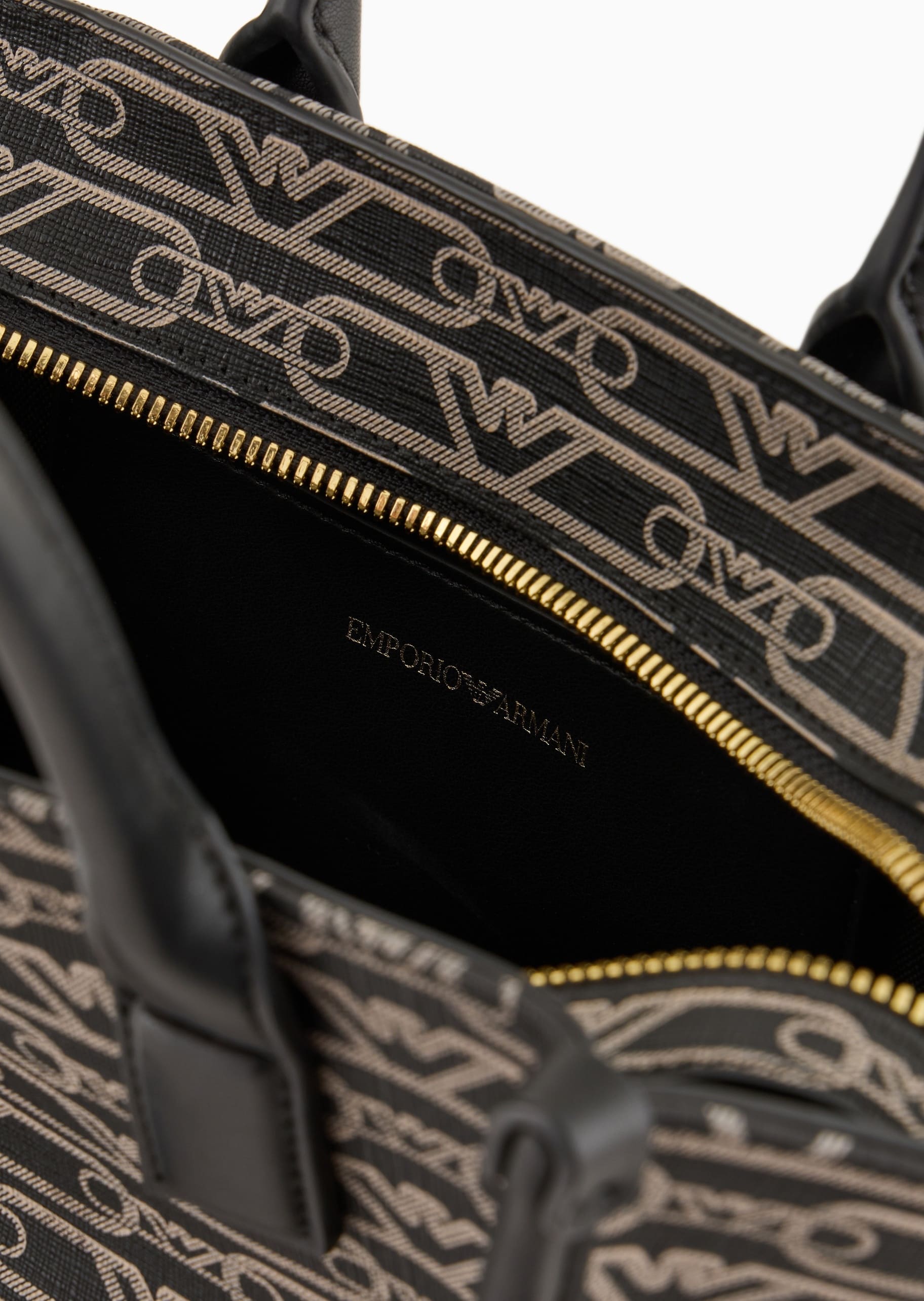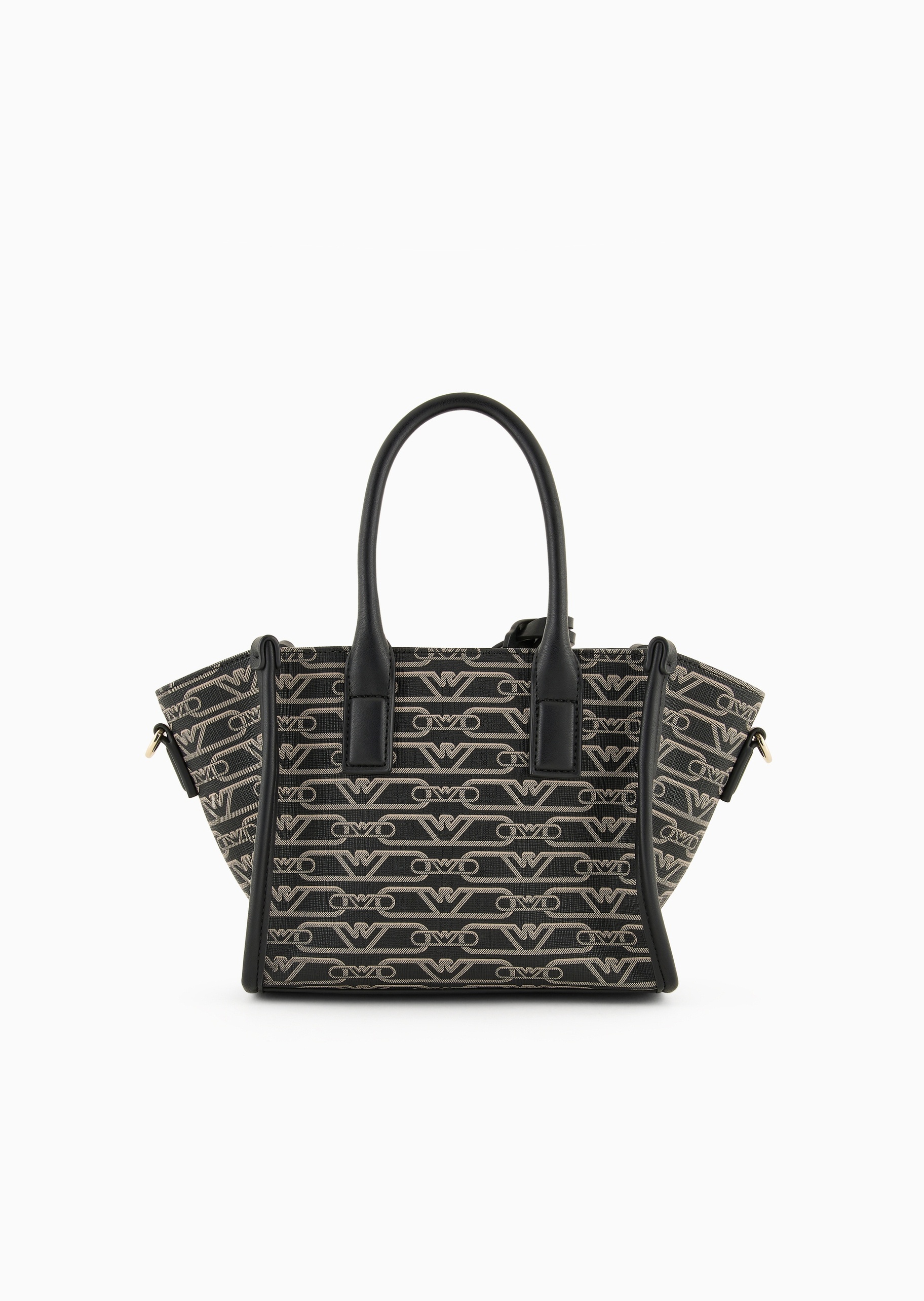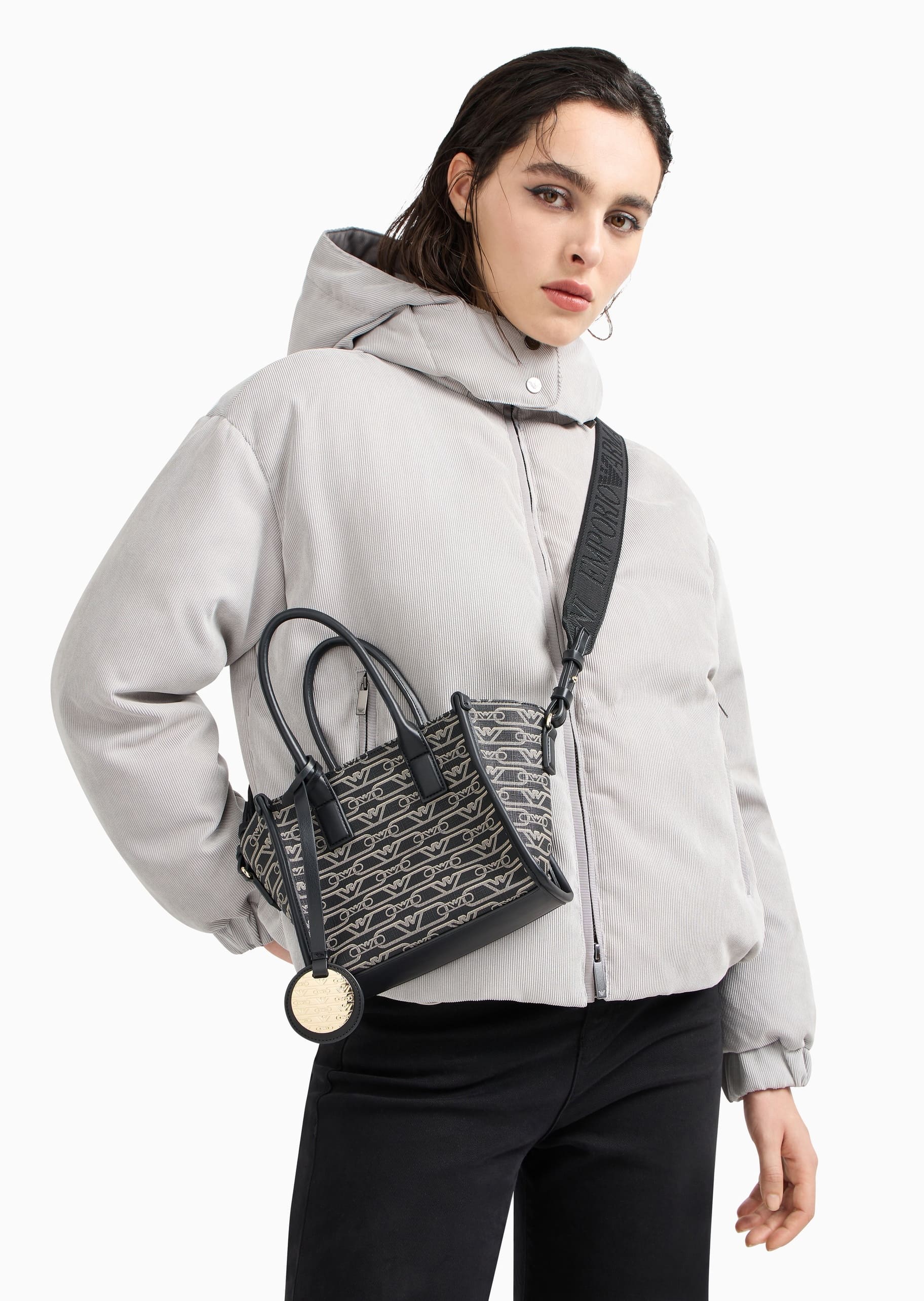 Маленька сумка-шоппер з подвійною ручкою, практичним плечовим ременем з логотипом і підвіскою-логотипом. Серія аксесуарів із щільним монограмним принтом по всій поверхні доступна у функціональних стилях, розроблених для жінки Emporio Armani, яка завжди в русі.