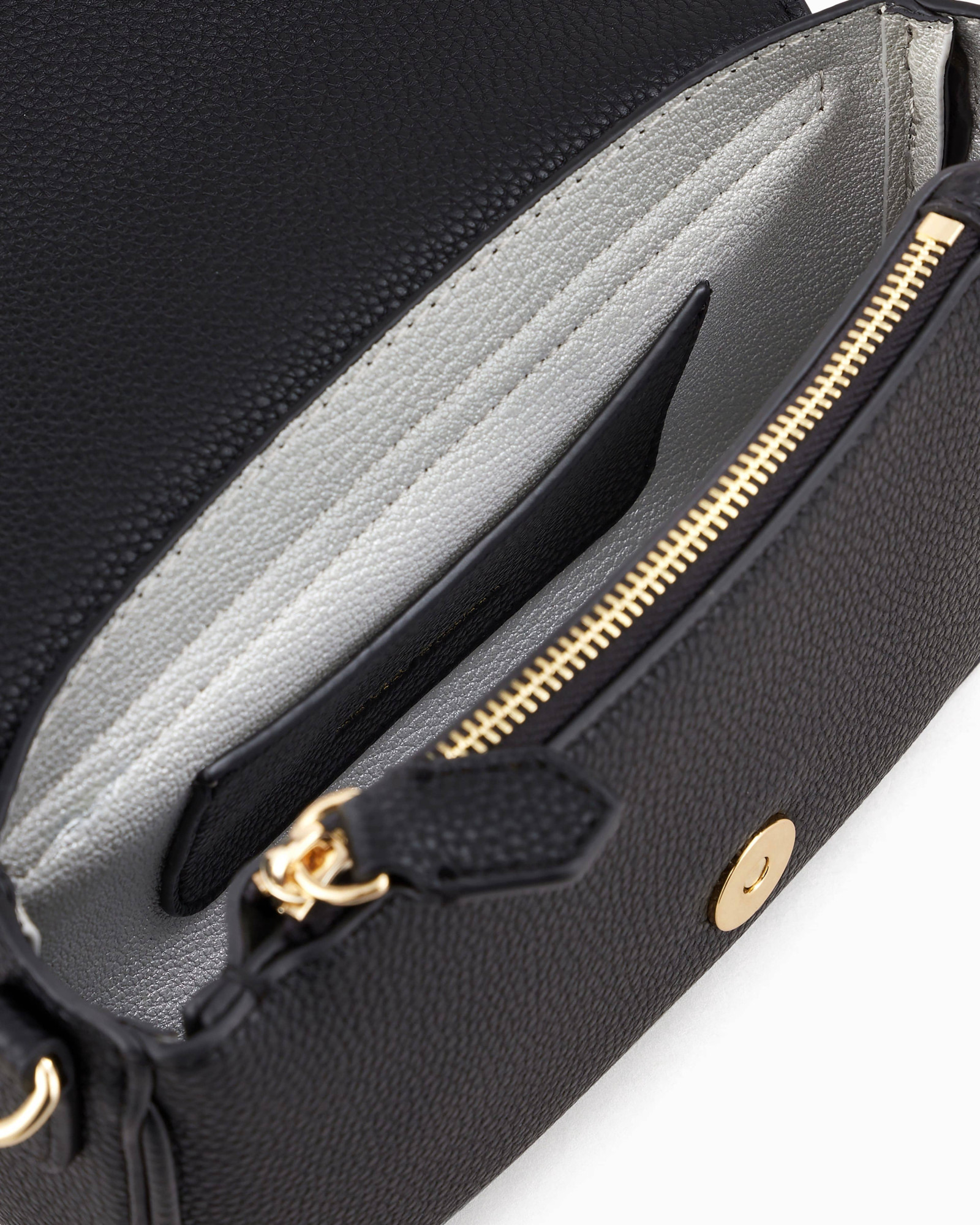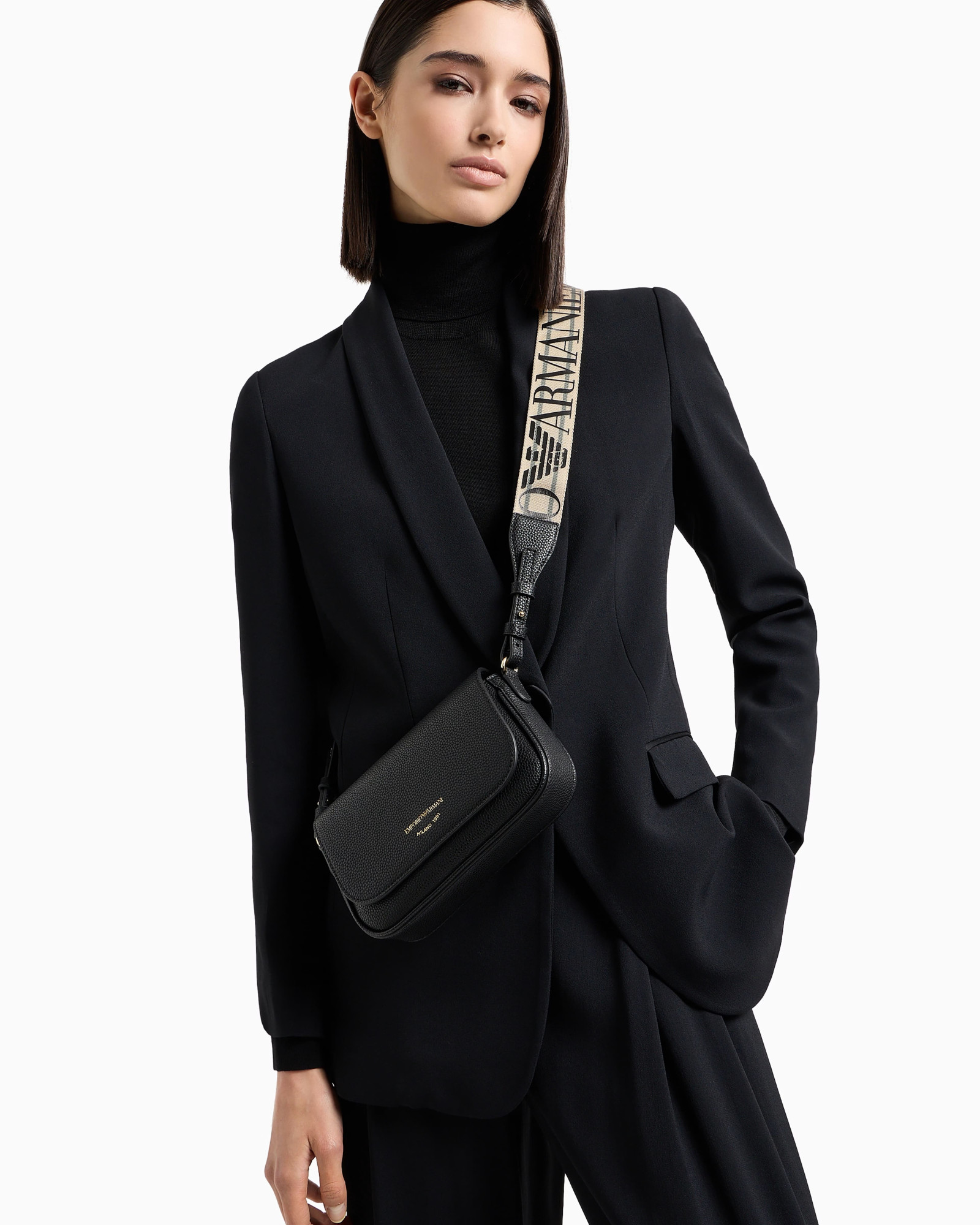 Мініатюрна сумка чорного кольору з фактурною обробкою під оленячу шкіру доповнена логотипом на ремені та шовкотрафаретним принтом спереду. Завдяки лаконічному формату 19,5×12,5×4,5 см виріб зберігає функціональність: всередині — кишеня на блискавці та слот для картки. Магнітна застібка забезпечує зручність у щоденному використанні, а відсутність підкладки робить конструкцію особливо легкою.