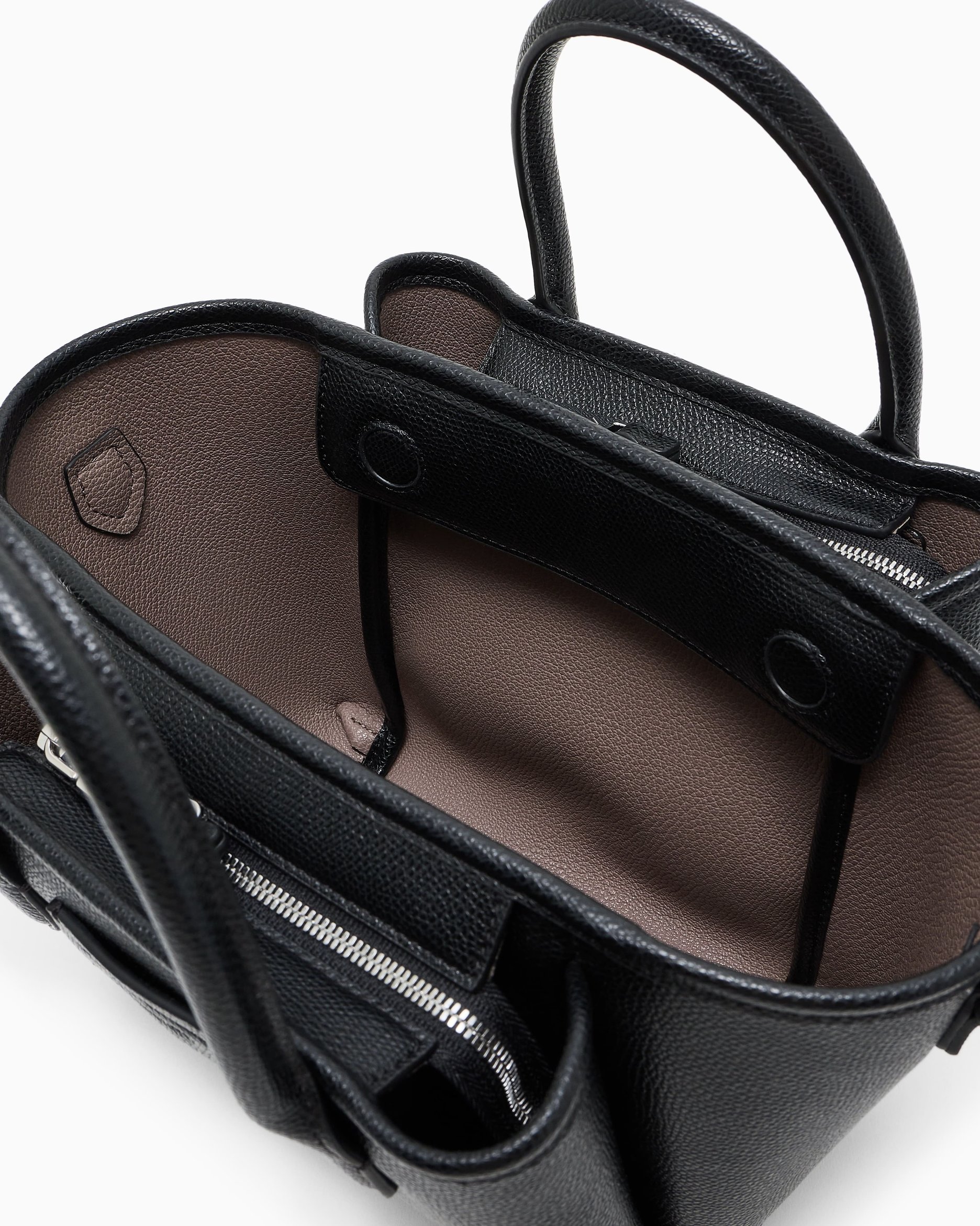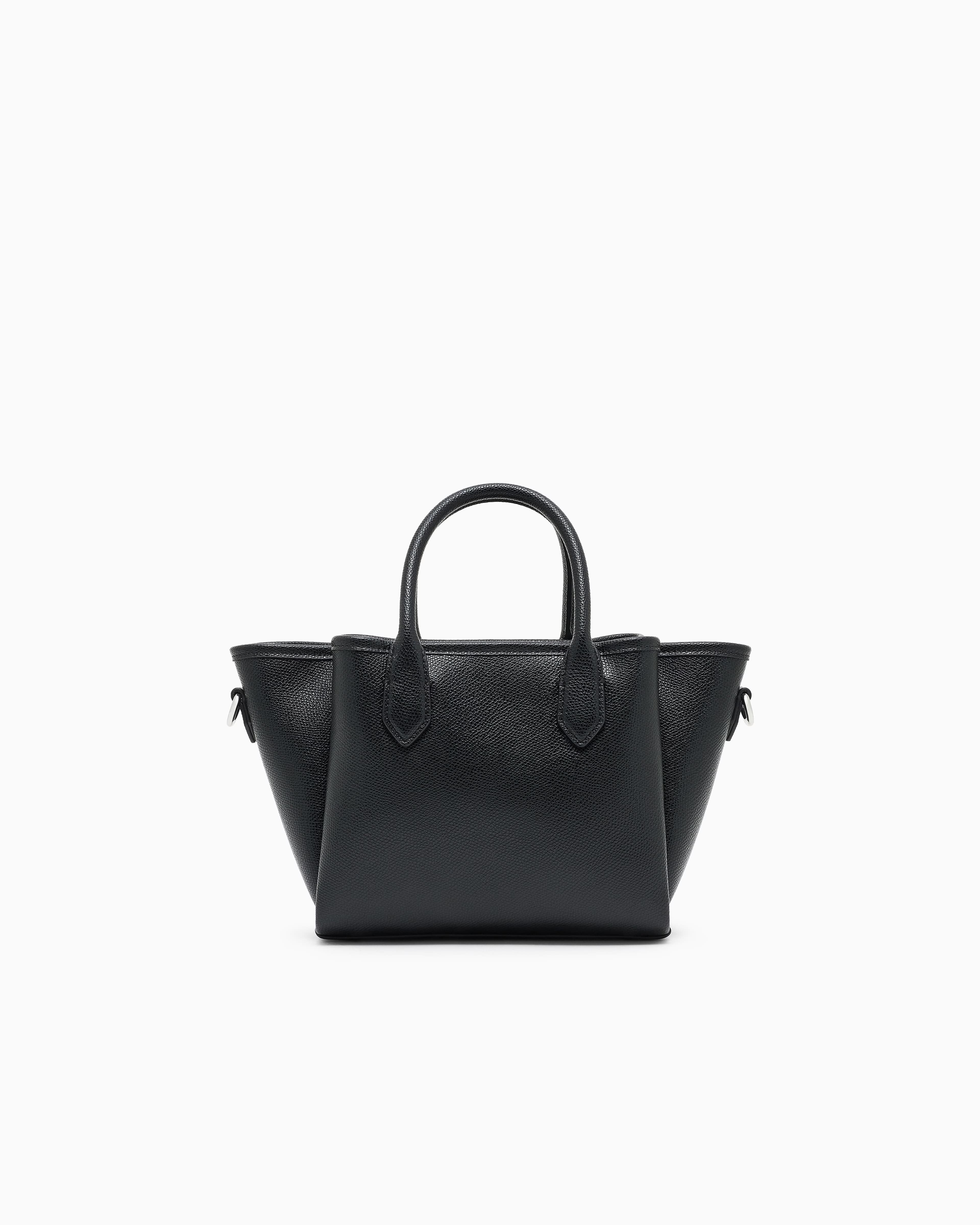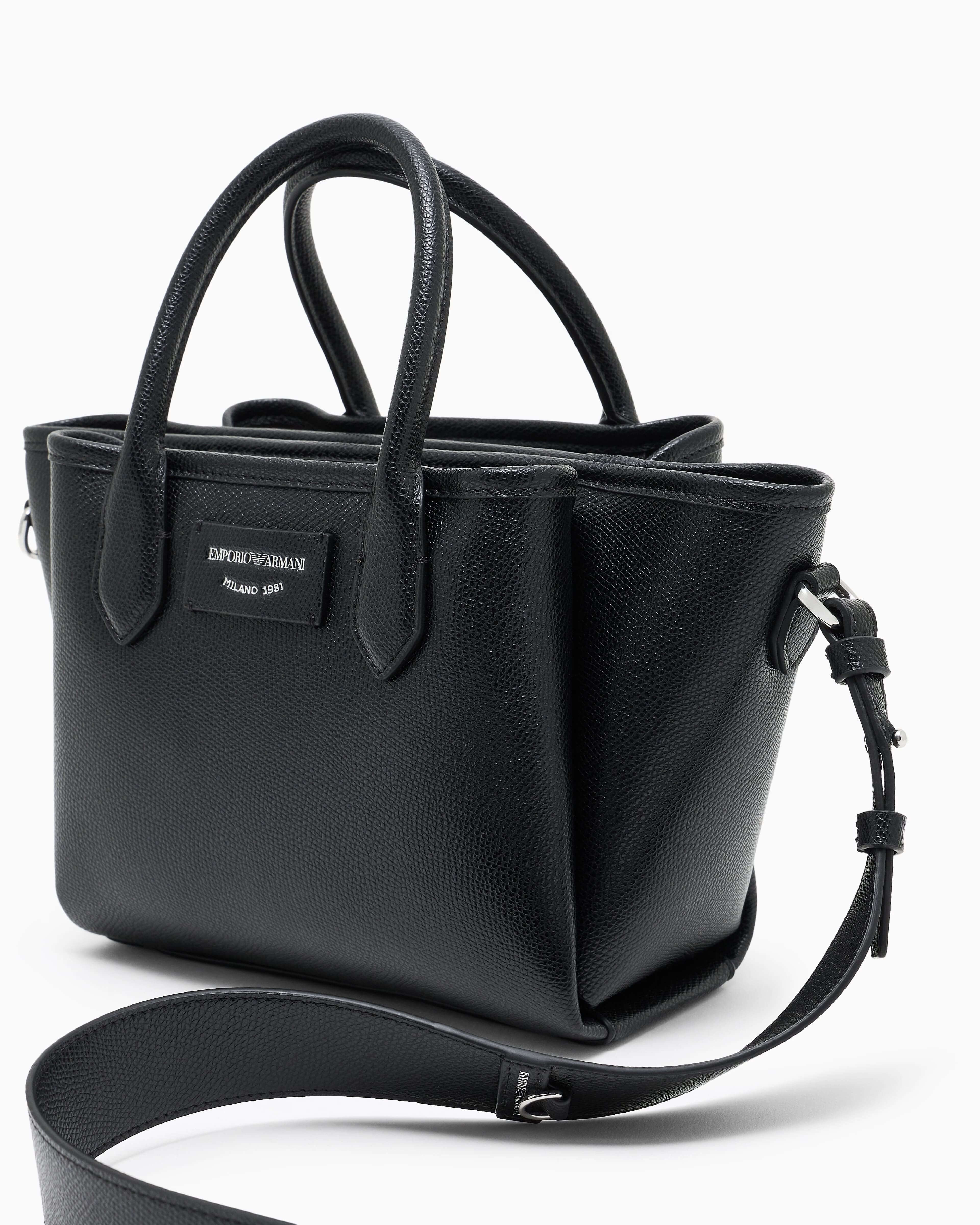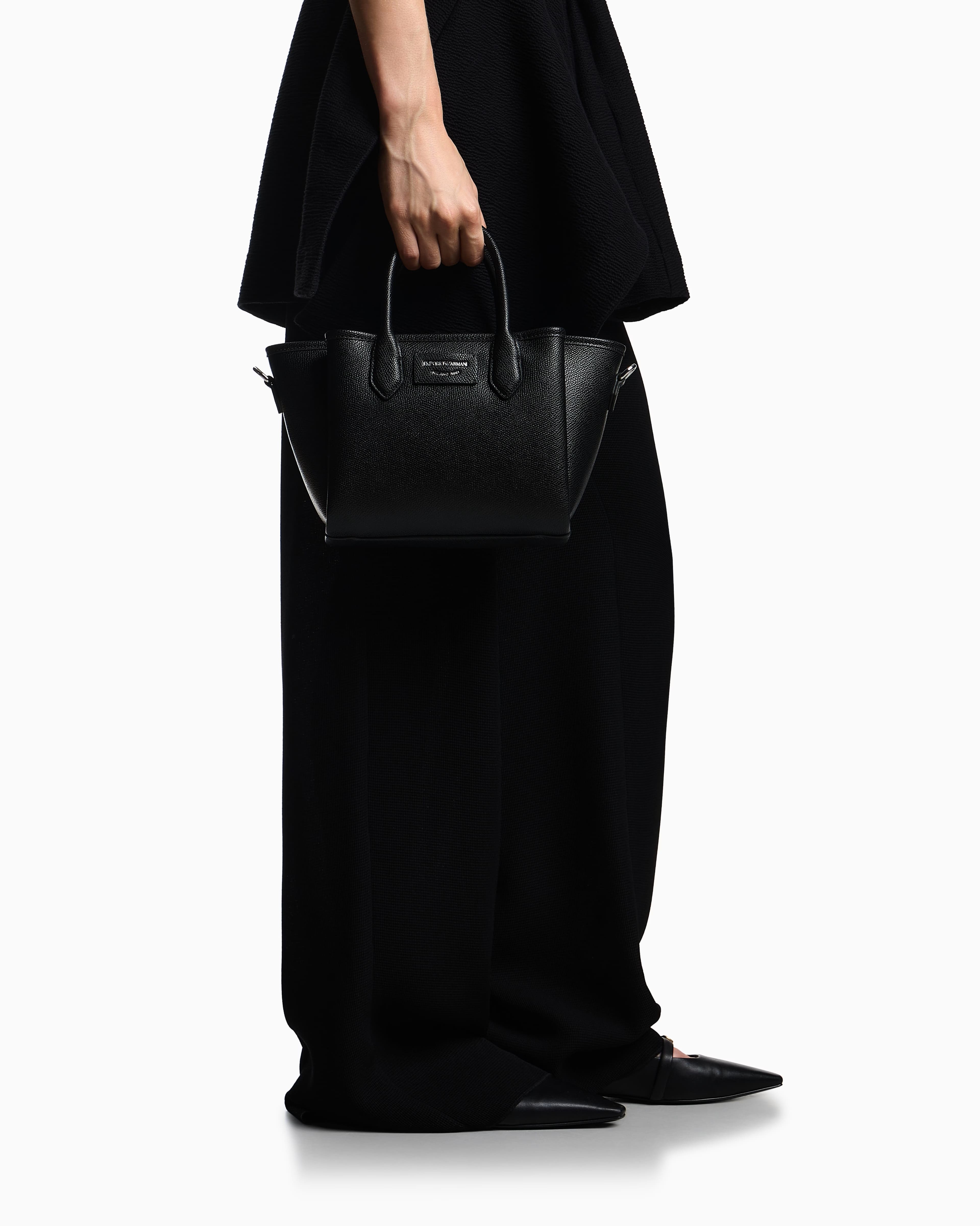 Невелика сумка-шопер чорного кольору з двома короткими ручками та знімним регульованим ременем поєднує лаконічний дизайн і функціональність. Матеріал із текстурою пальмеллато та шовкотрафаретний логотип створюють стриманий, але виразний вигляд. Зручний формат 30×18×11 см робить аксесуар доречним як у подорожах, так і в повсякденному житті. Поєднується з пальтами, жакетами та лаконічними сукнями, доповнюючи як ділові, так і невимушені образи. Універсальний вибір для поціновувачів продуманого мінімалізму.