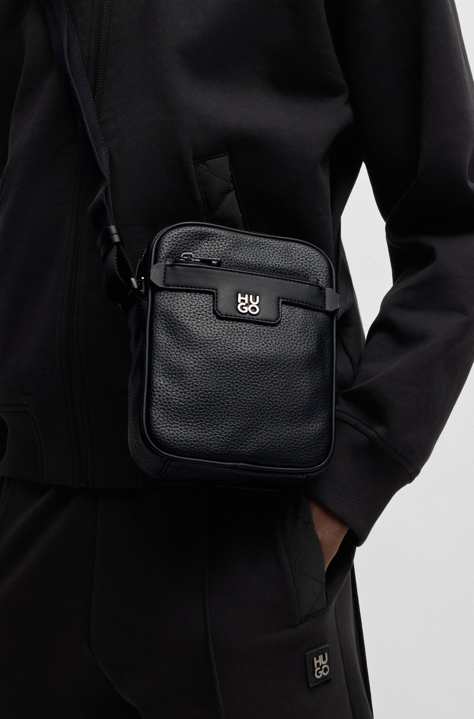 Сумка-месенджер від Hugo з екошкіри. Модель з регульованим ремінцем, на застібці-блискавці та з внутрішньоою кишенею. Зручний аксесуар доповнить будь-який аутфіт та дозволить завжди мати під рукою необхідні речі.