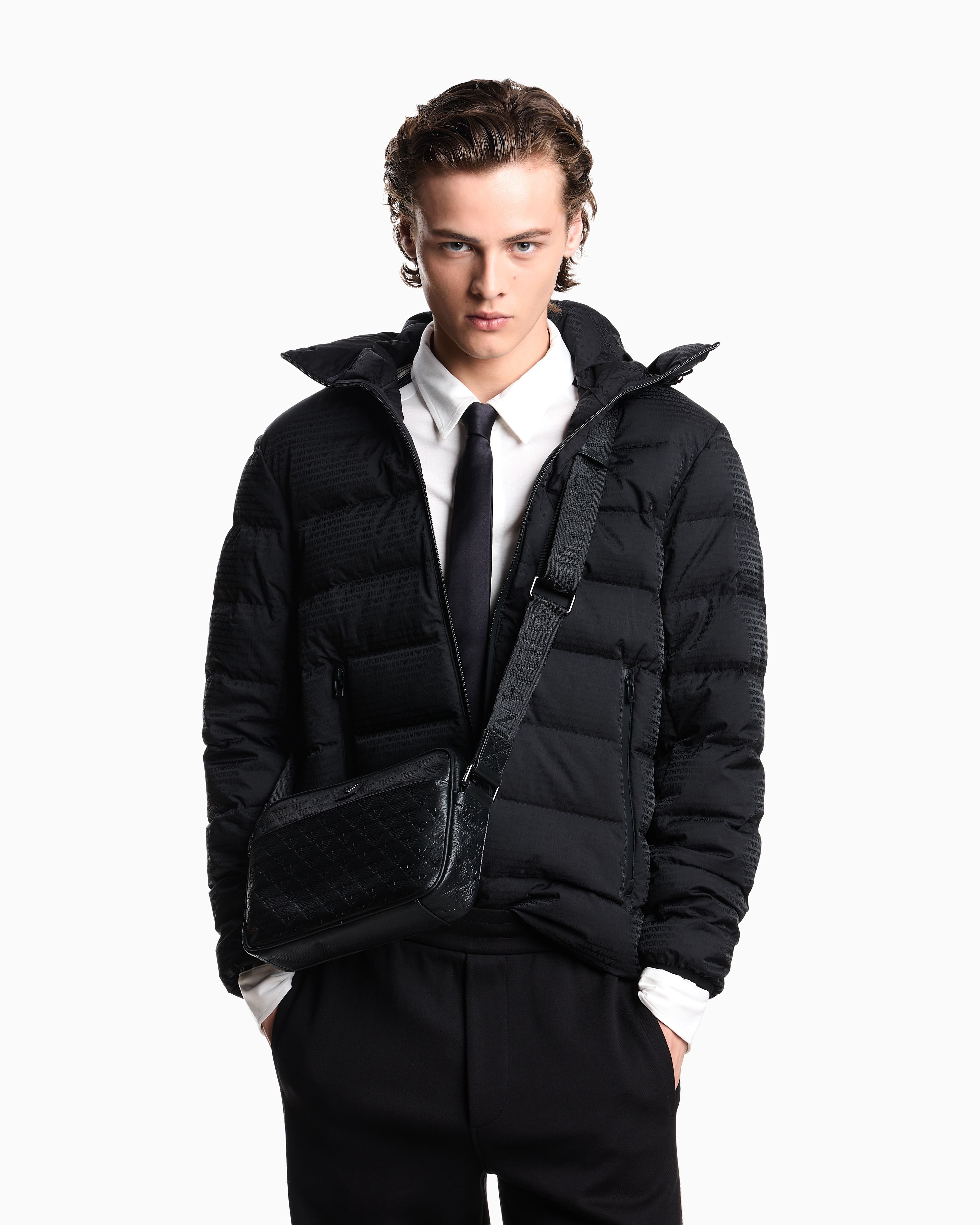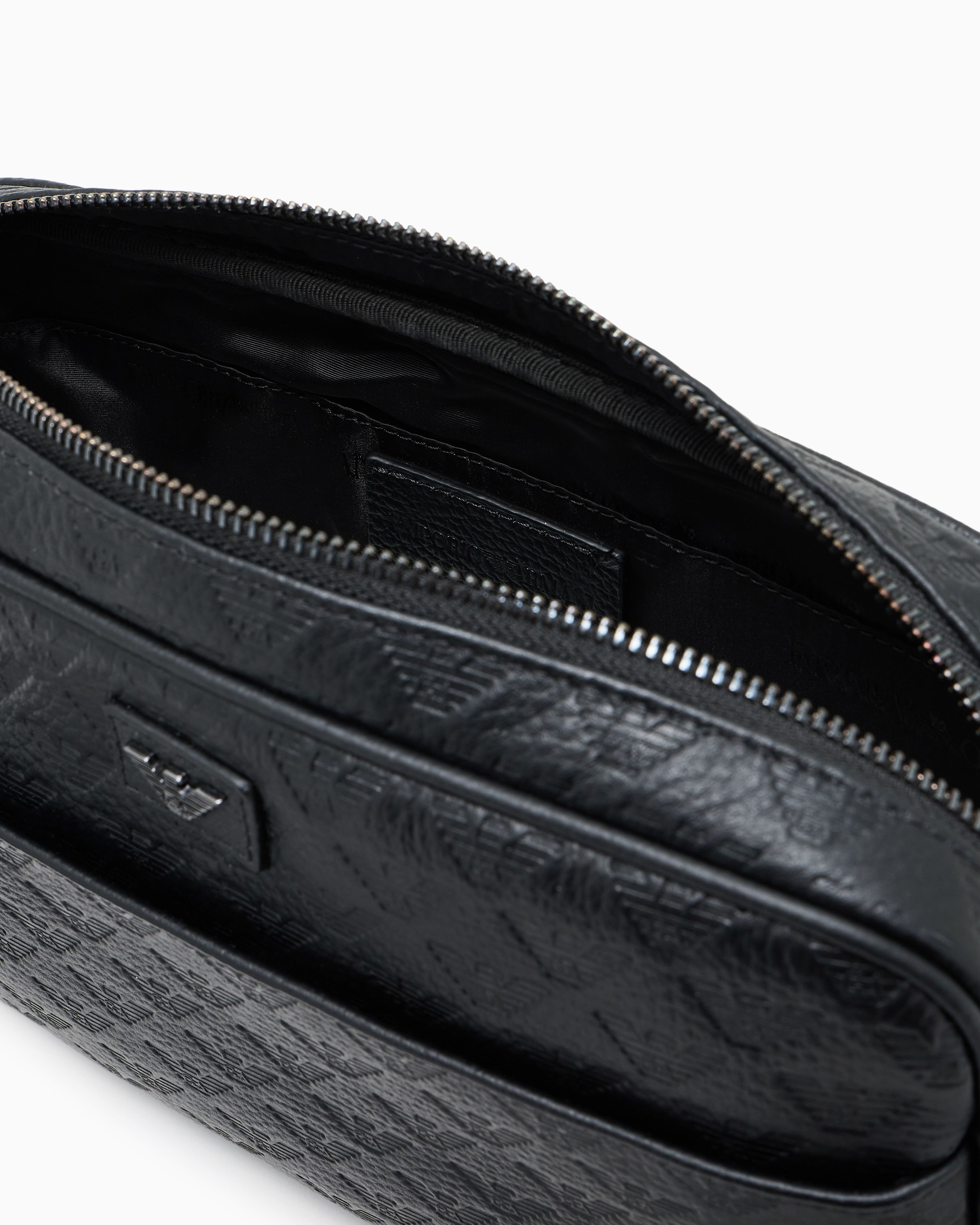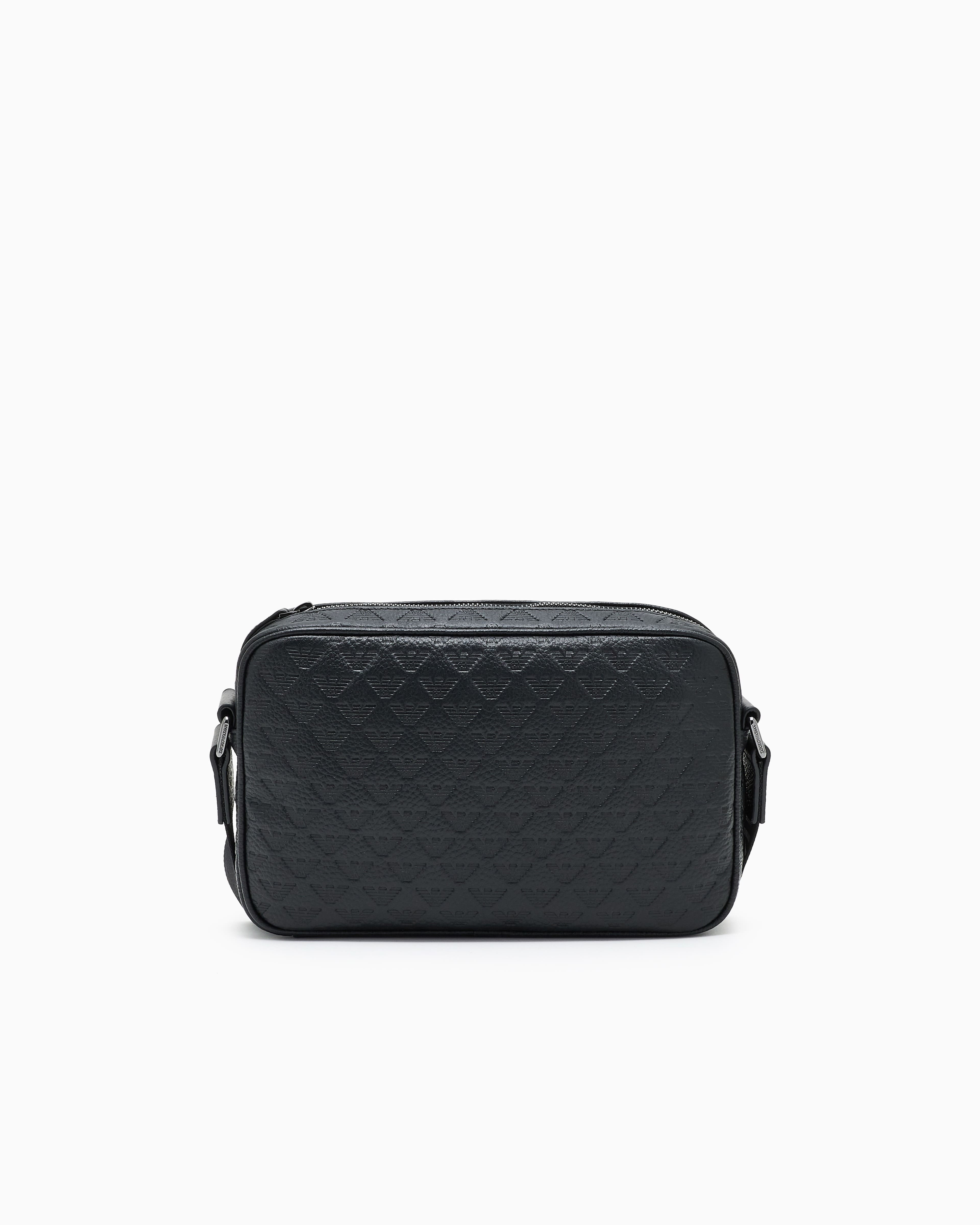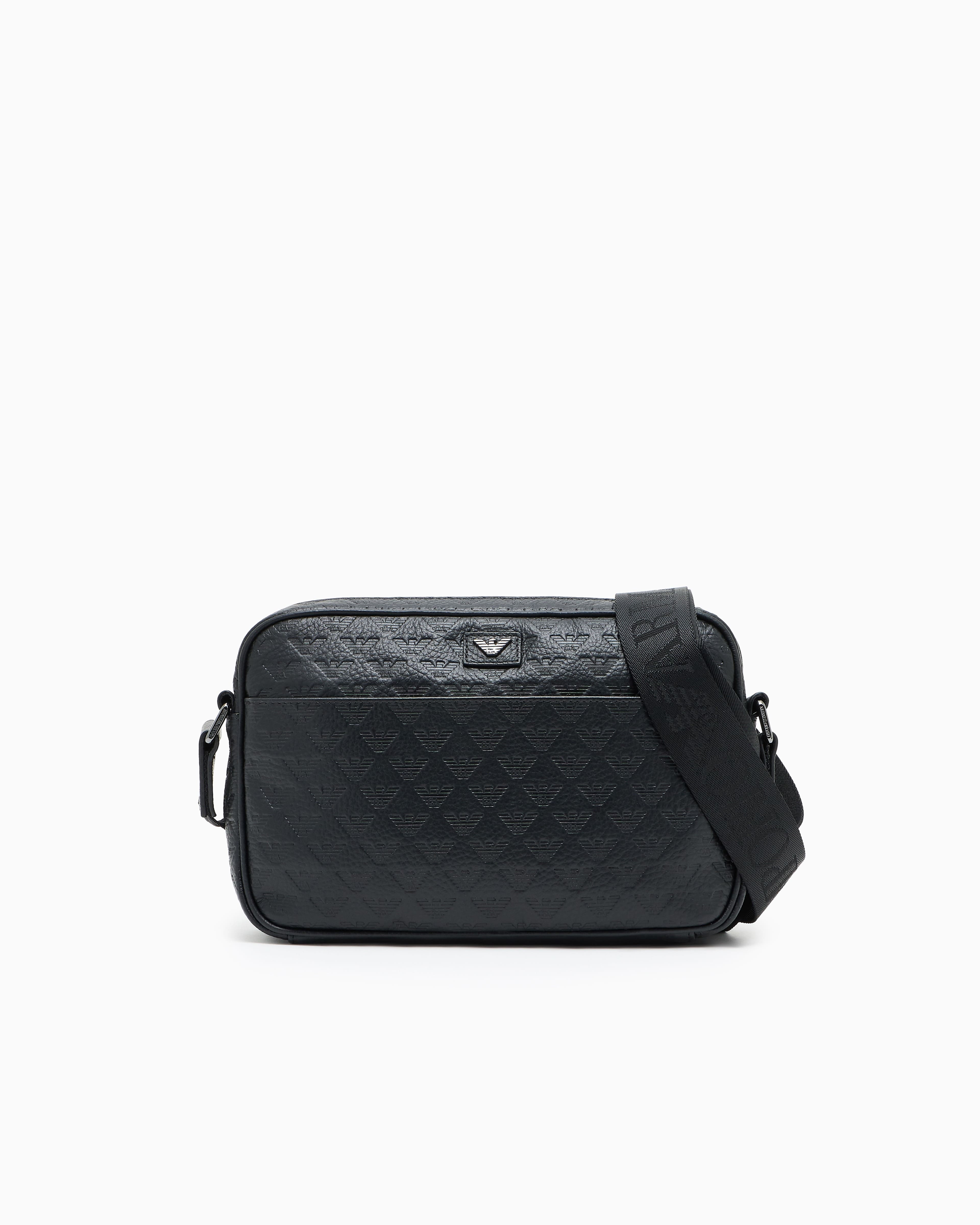 Чорна сумка через плече із зернистої телячої шкіри з тисненням у вигляді орла по всій поверхні. Стриманий силует доповнений зовнішньою кишенею на блискавці та металевим логотипом-орлом на шкіряній вставці. Регульований плечовий ремінь із брендованої стрічки підкреслює динамічний, впевнений характер виробу. Поєднується з темними тотал-луками, спортивними куртками, прямими піджаками та кросівками зі шкіри.