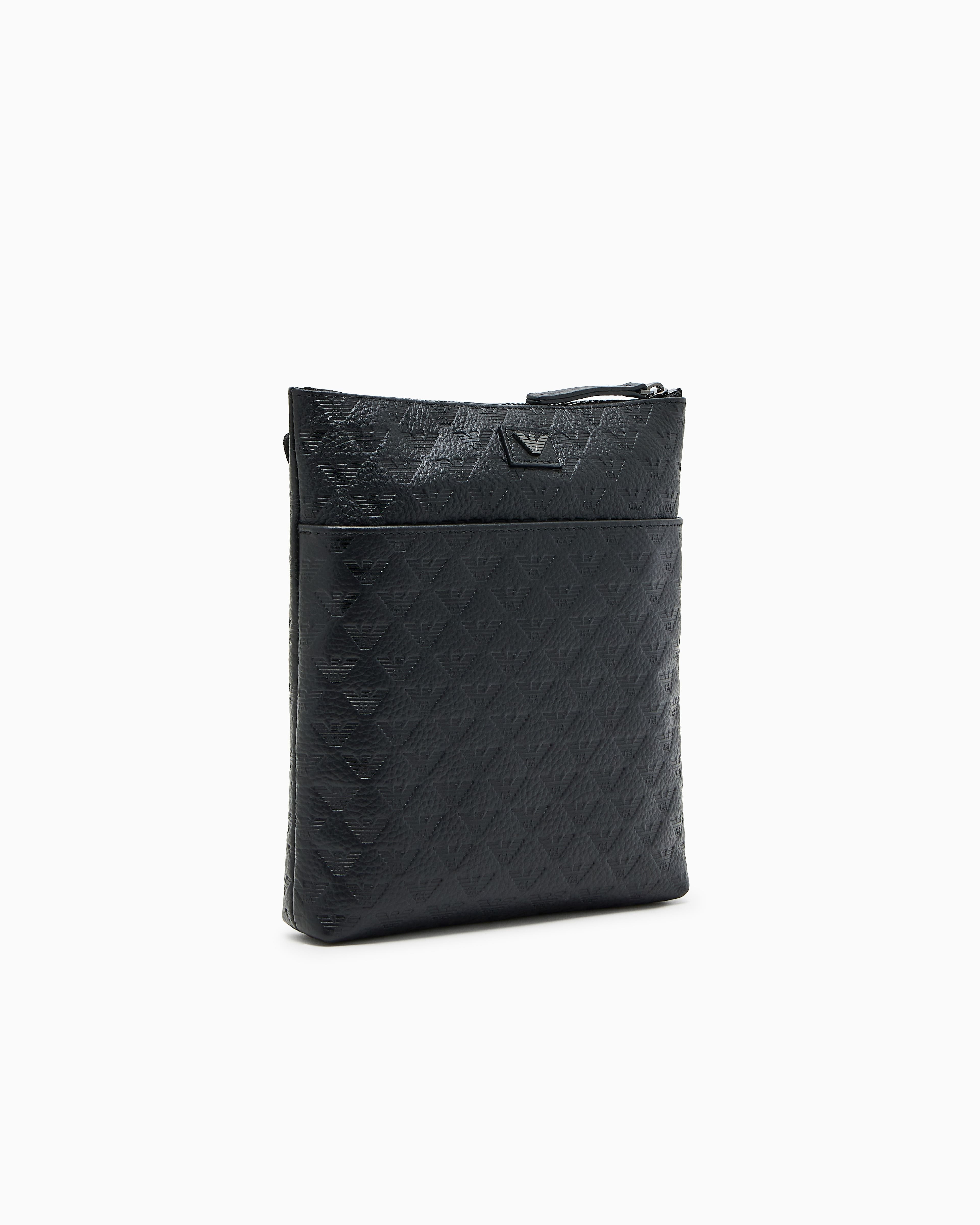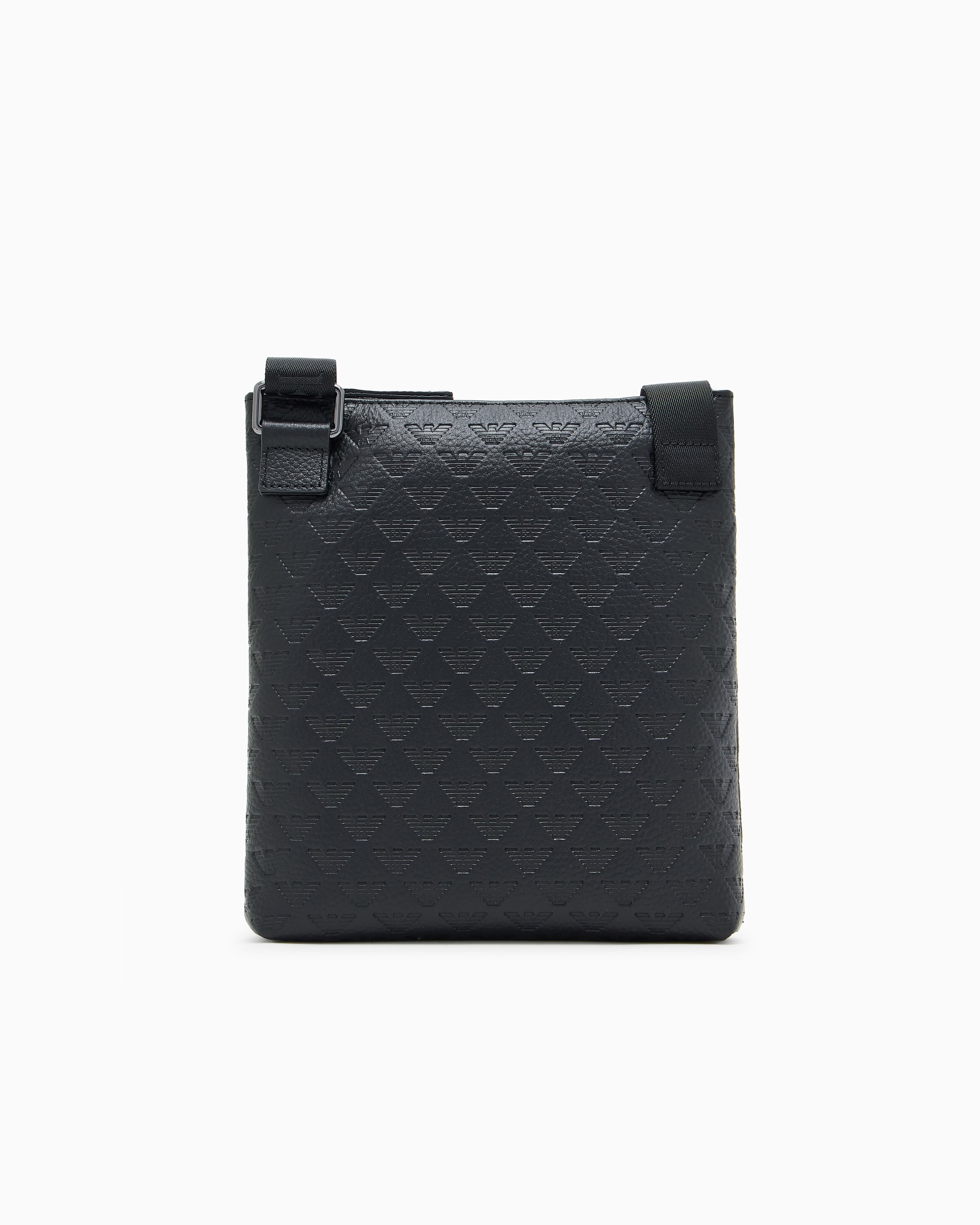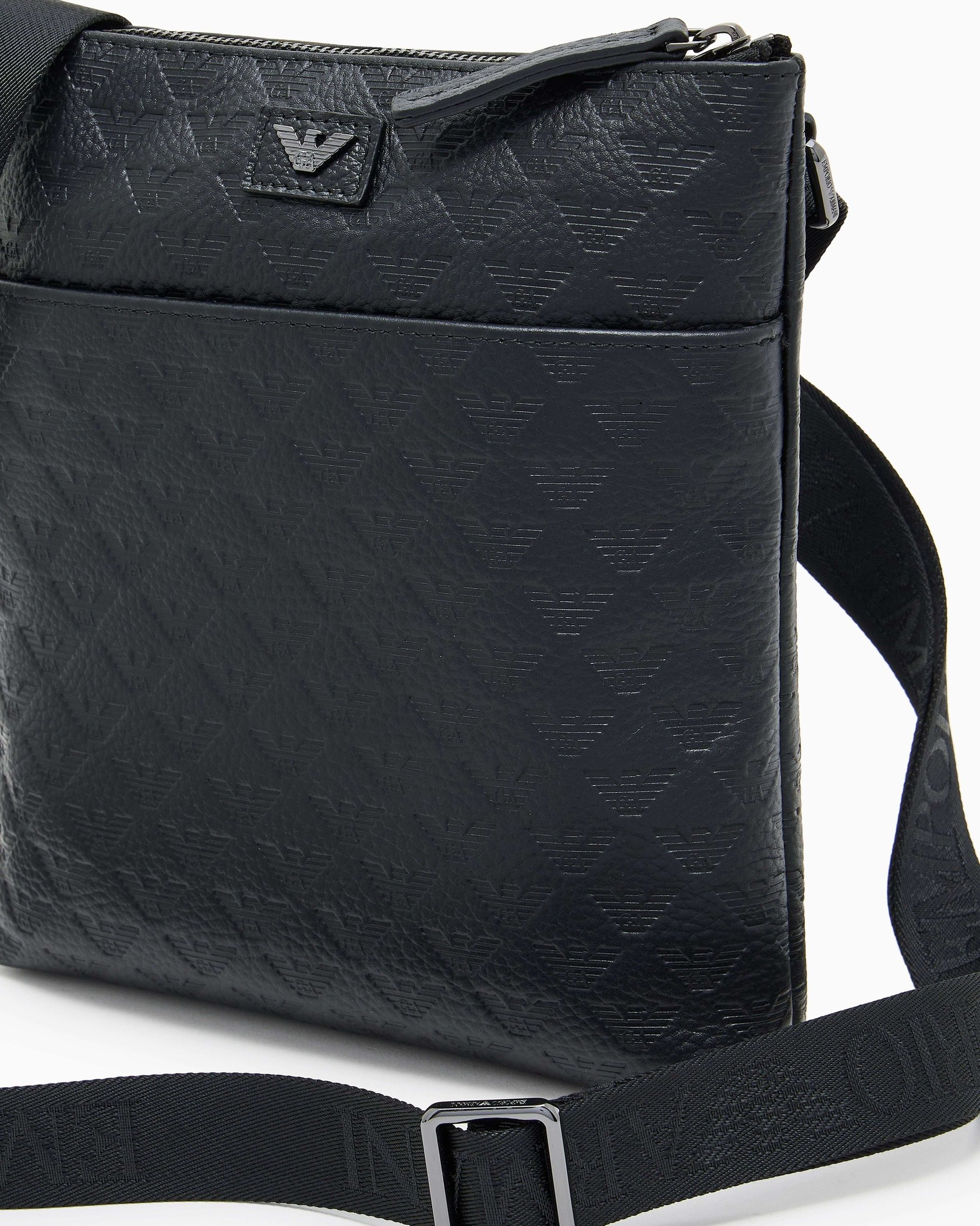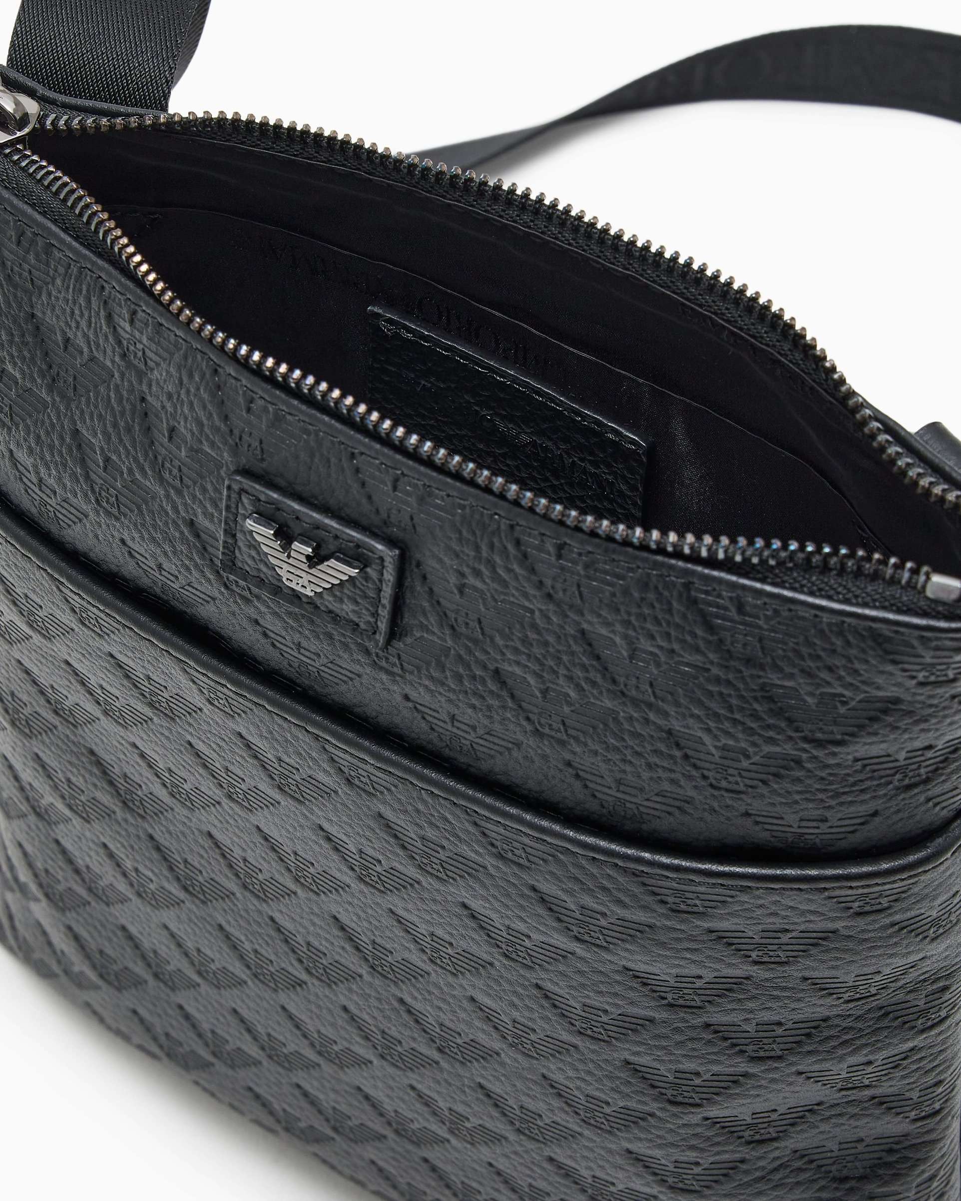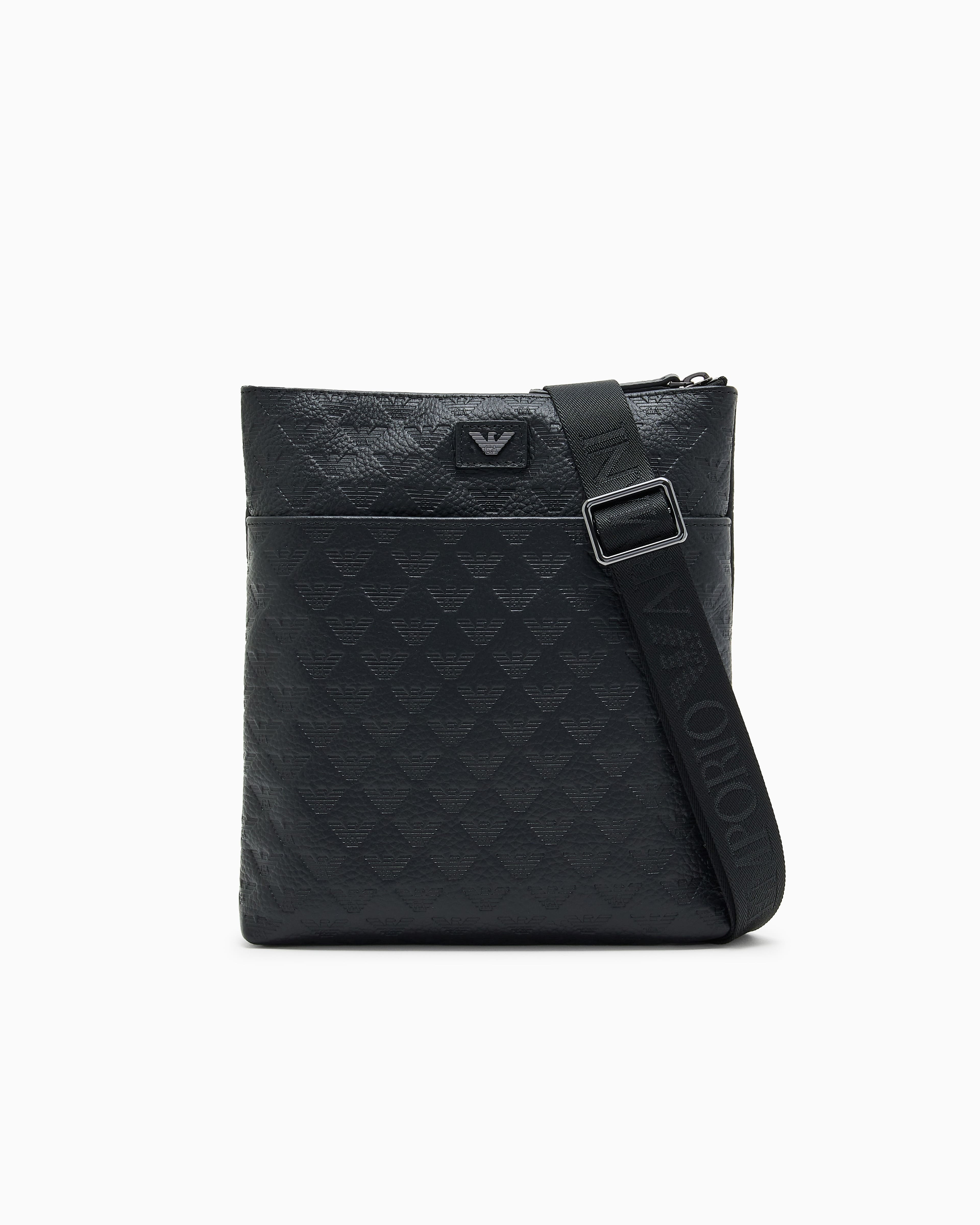 Чорна плоска сумка через плече з зернистої телячої шкіри з тисненням у вигляді орла по всій поверхні. Виразний, ефектний аксесуар із зовнішньою кишенею на блискавці, оздоблений металевим логотипом-орлом на шкіряній вставці. Завершує дизайн регульований плечовий ремінь із брендованої стрічки.