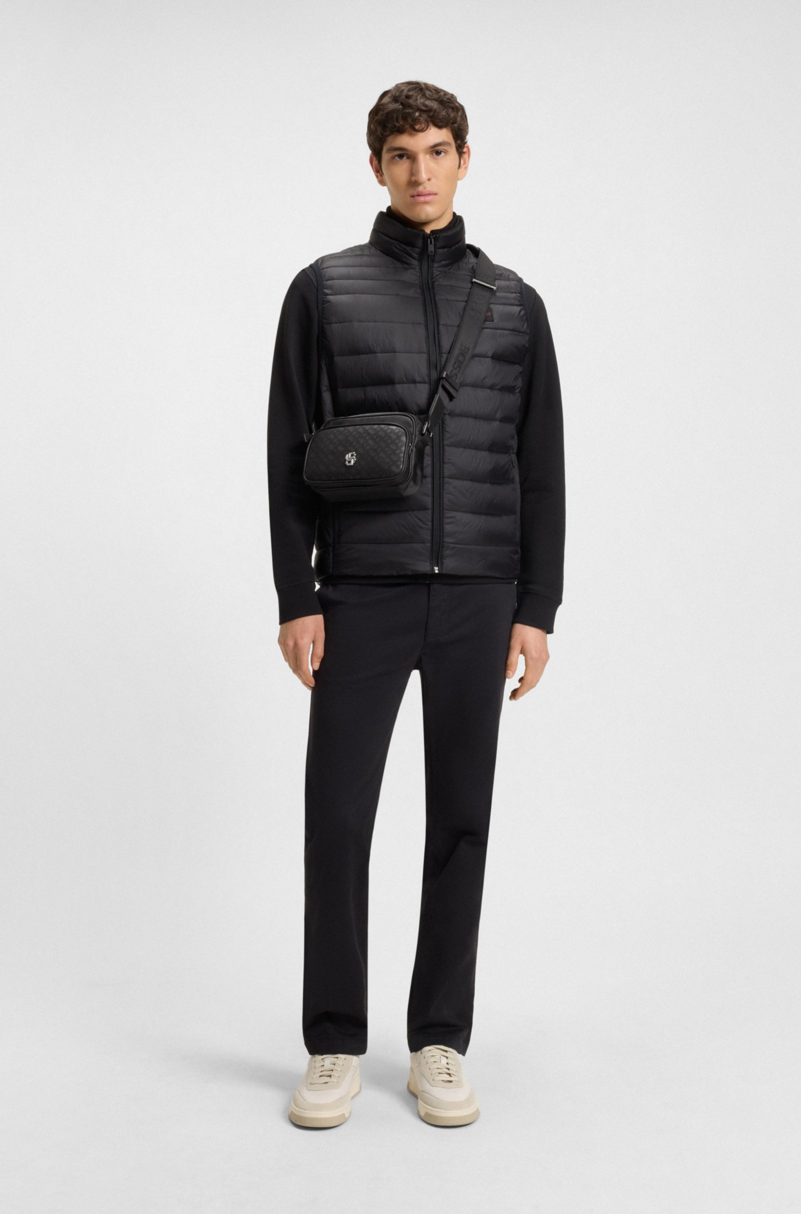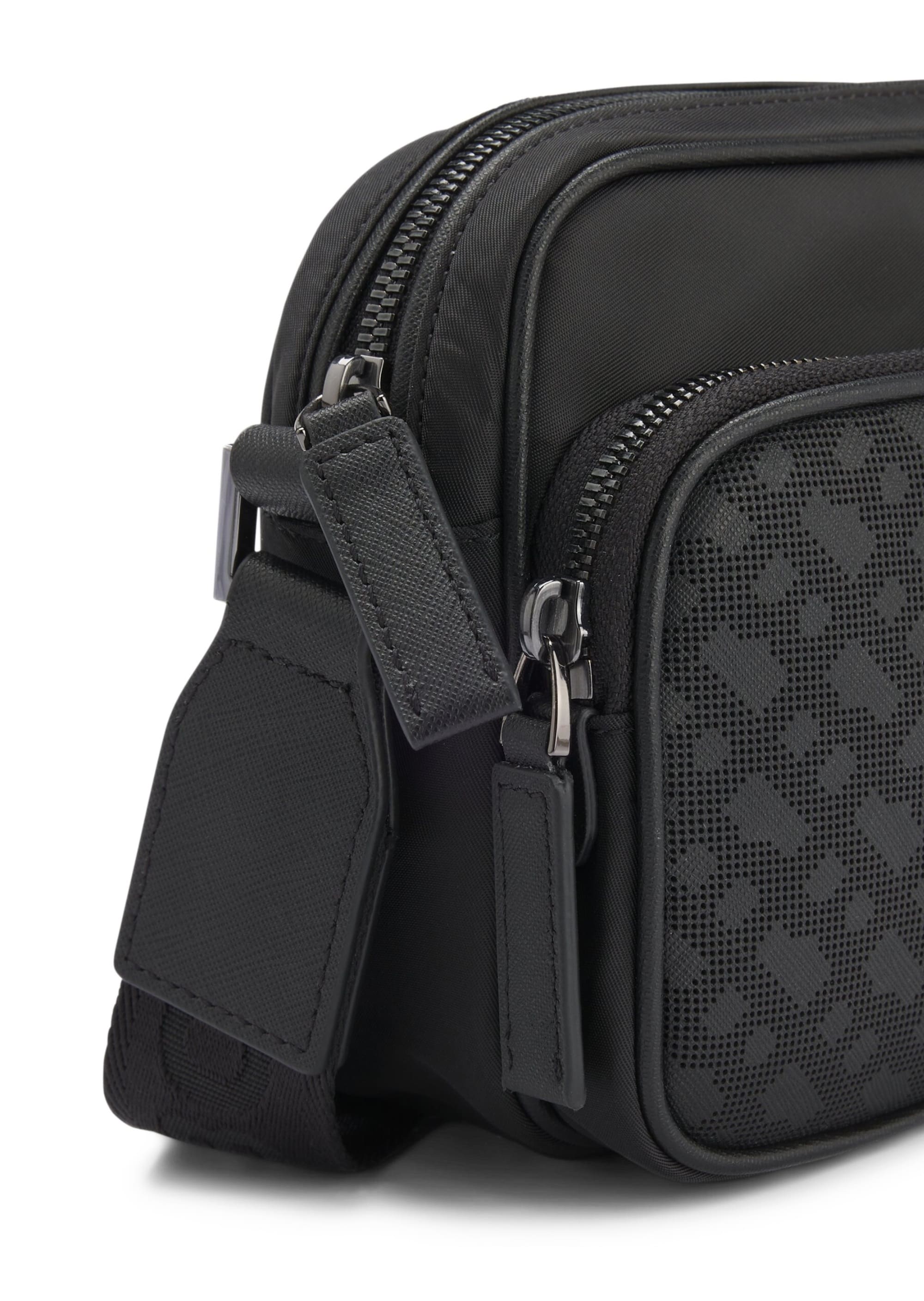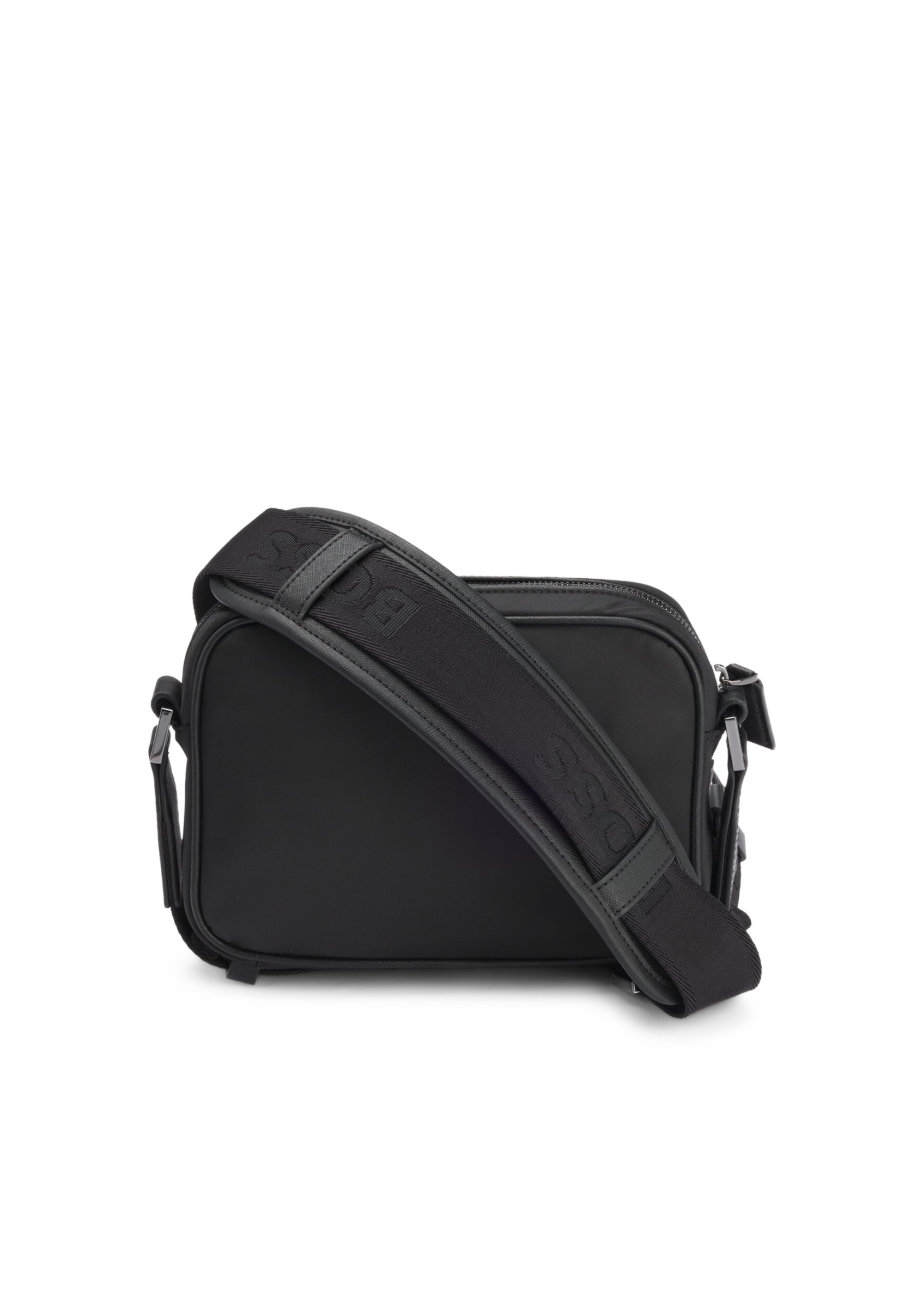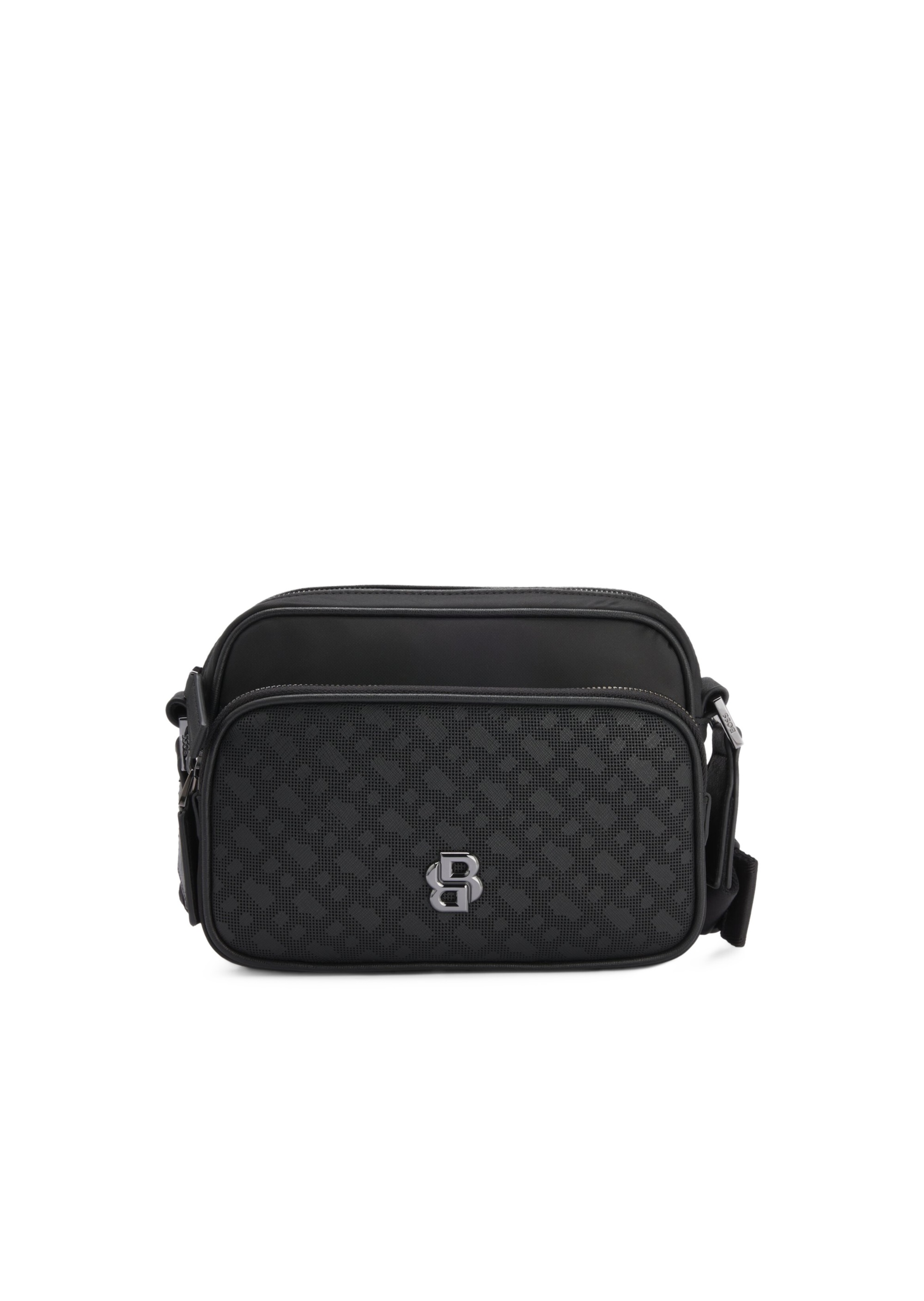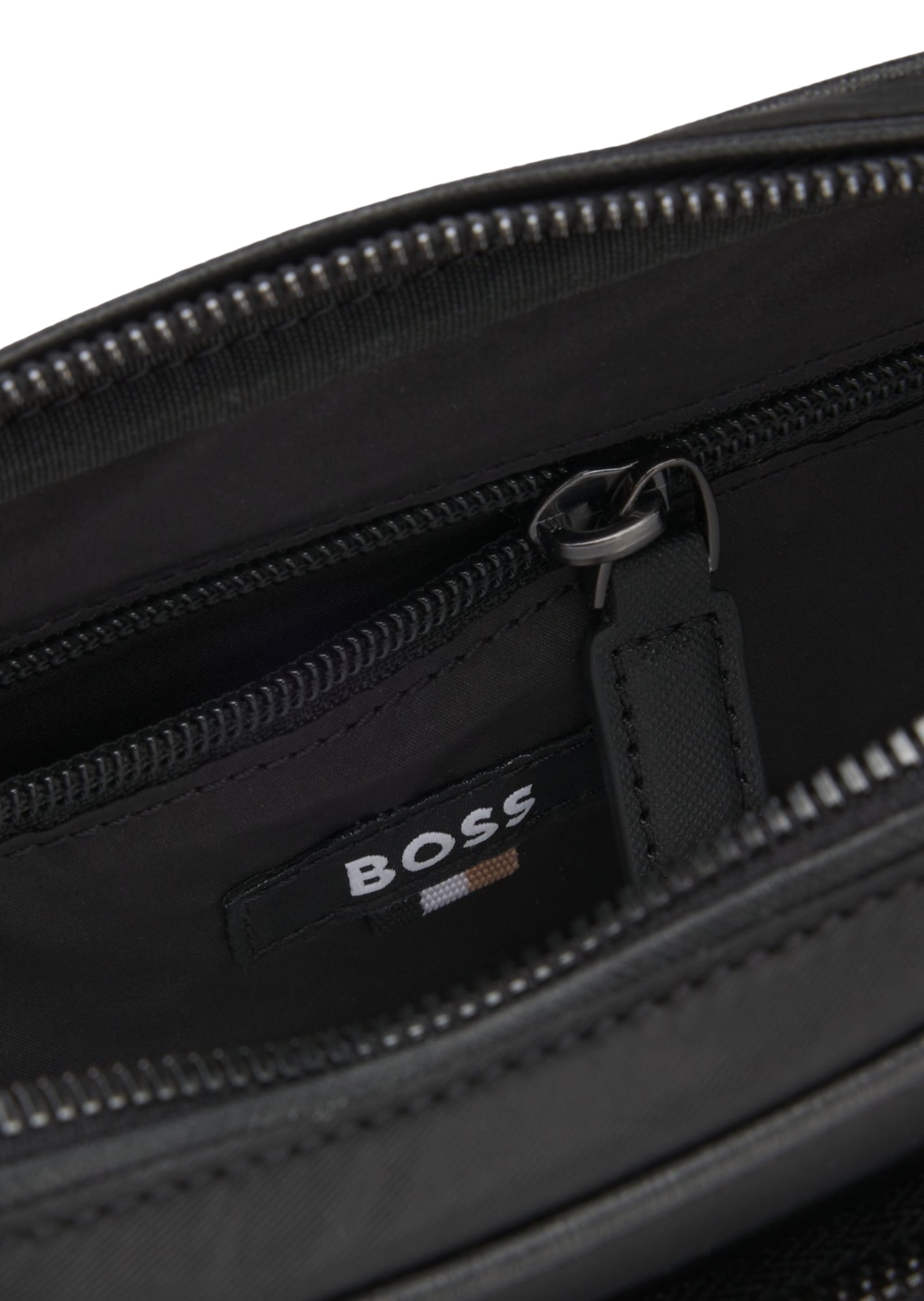 Сумка BOSS у чорному кольорі виконана з твілової тканини з фірмовим монограм‑принтом, доповнена металевою пластиною з логотипом Double B. Компактні габарити (близько 20 × 15 × 4,5 см) і застібка‑блискавка забезпечують збереження речей, а регульований плечовий ремінь дозволяє носити виріб як через плече, так і через корпус. Універсальний аксесуар для повсякденного стилю, у якому стриманість поєднується з виразним фірмовим акцентом.