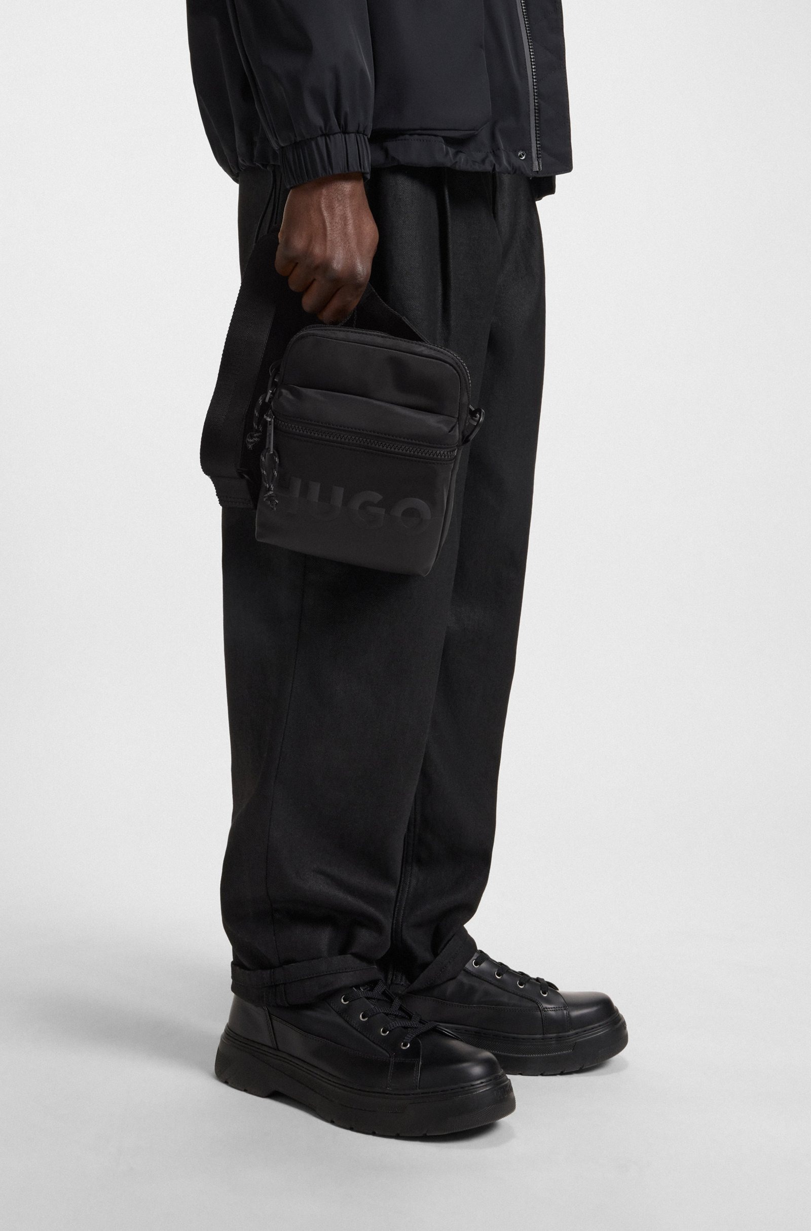 Сумка HUGO чорного кольору виконана з матового твілу, що створює стриманий текстурний ефект і приємну легкість у носінні. Тонкий split‑logo у тон тканини підкреслює фірмову елегантність без надмірного декору. Блискавка‑застібка і фурнітура brushed gunmetal забезпечують надійність і вишуканість деталей. Компактні розміри роблять сумку ідеальною для ключів, гаманця й смартфона. Сумка HUGO стає функціональним акцентом urban-образу, де лаконічність поєднується з преміальним ефектом.