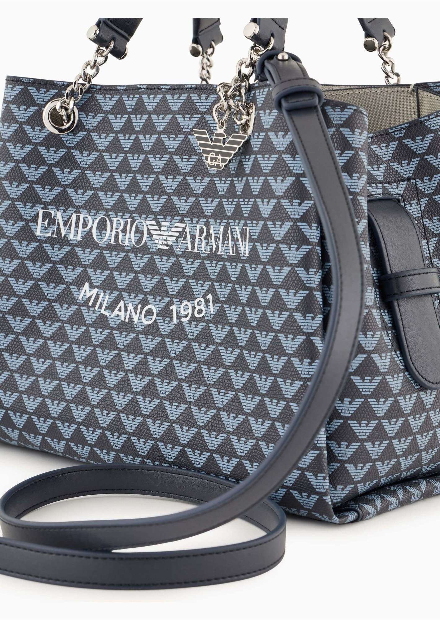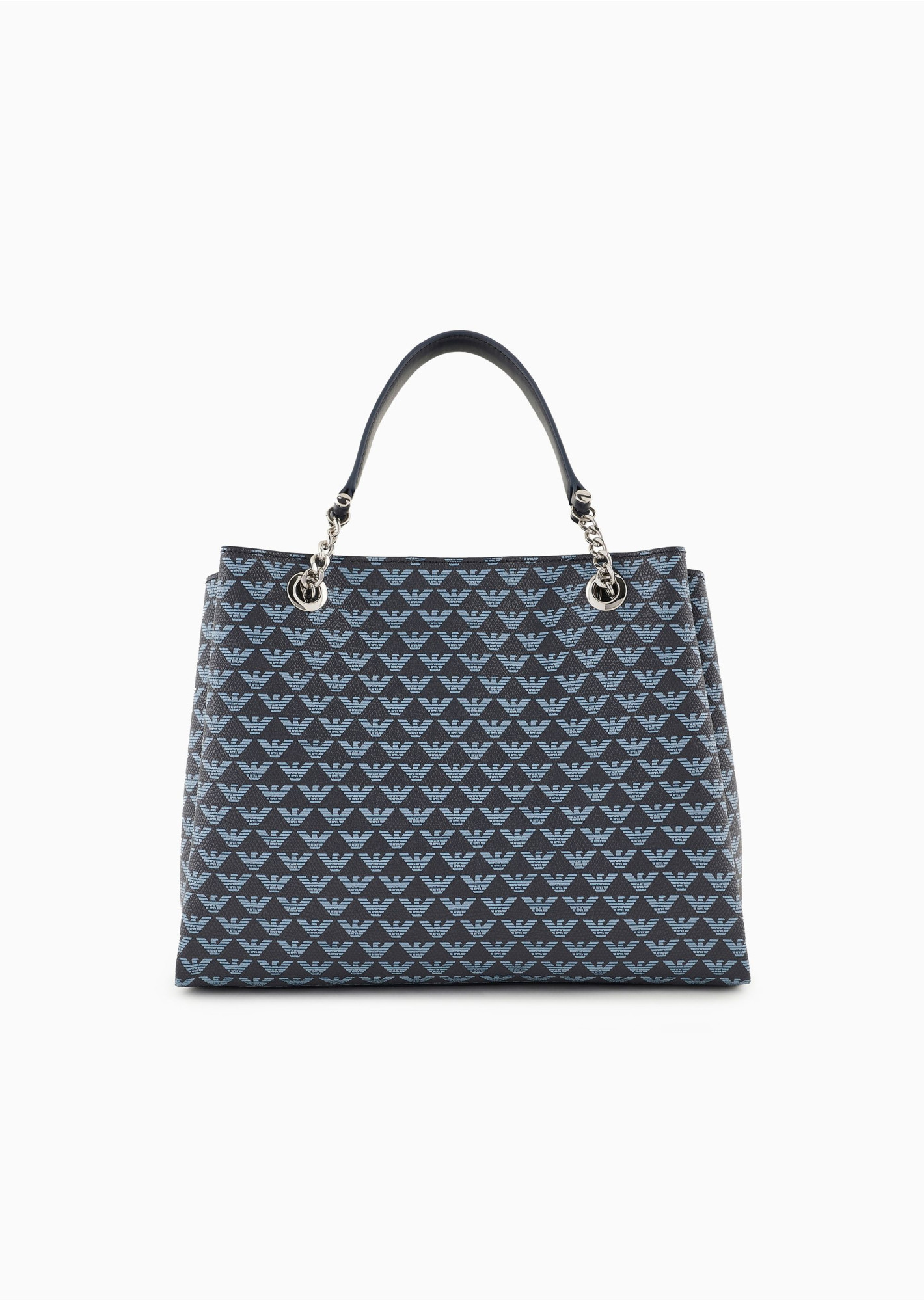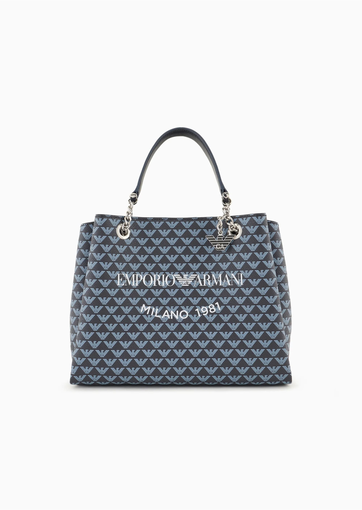Сумка-шопер з подвійною ручкою, практичним регульованим і знімним ременем через плече, підвіскою у вигляді культового орла і нашивкою з логотипом, надрукованим трафаретним друком. Зручний знімний і скоординований внутрішній чохол, який можна прикріпити або зняти з корпусу сумки за вашим бажанням. Повсякденний характер і практичність роблять цю жіночу сумку придатною для повсякденного використання, зберігаючи стиль, який завжди впізнаваний завдяки монограмі з символічним орлом по всій поверхні.