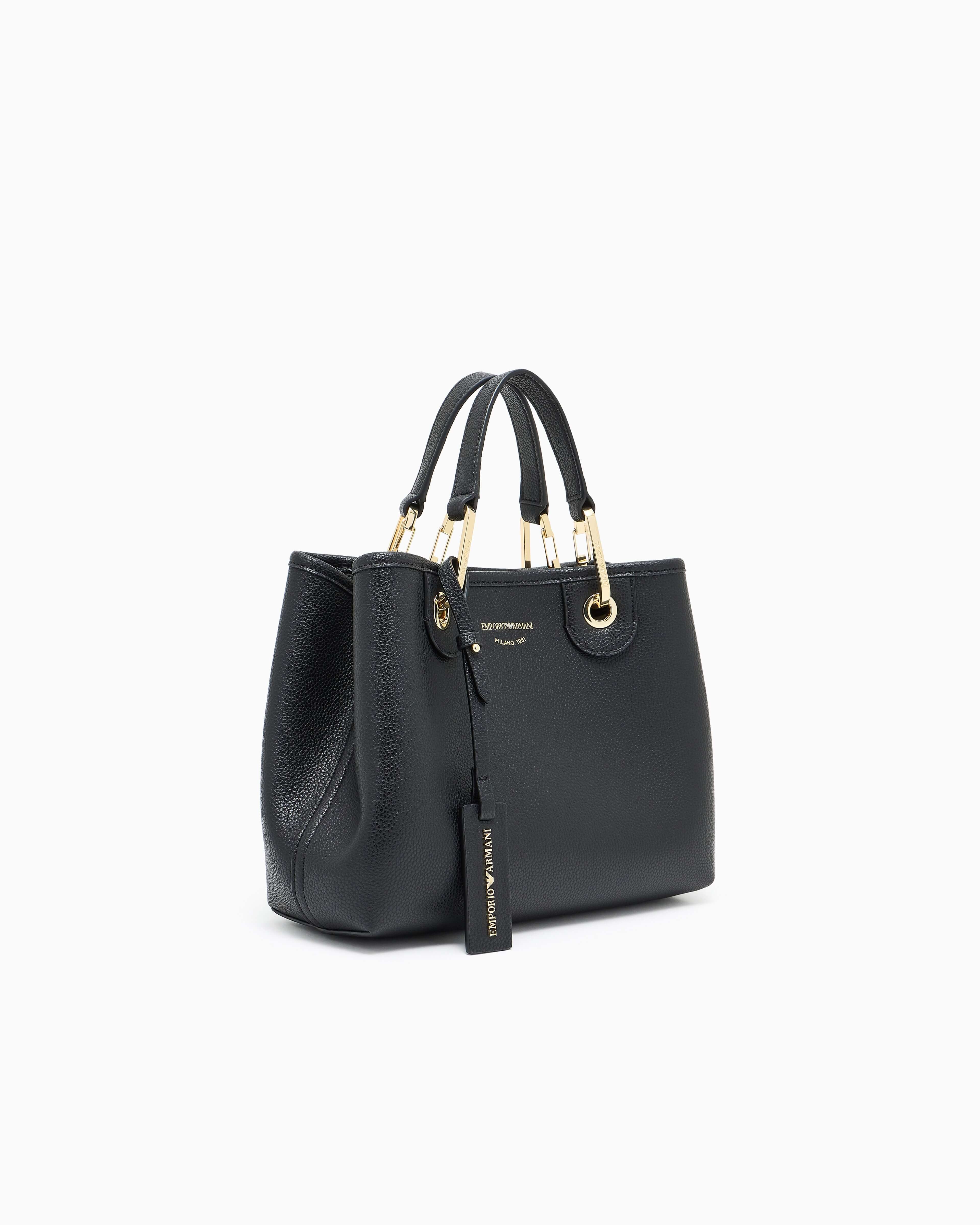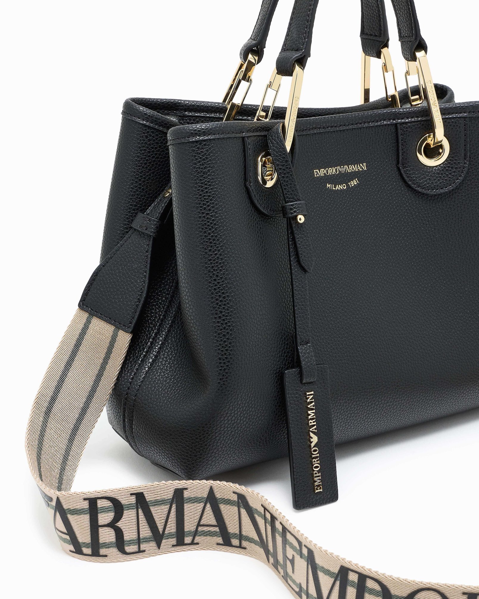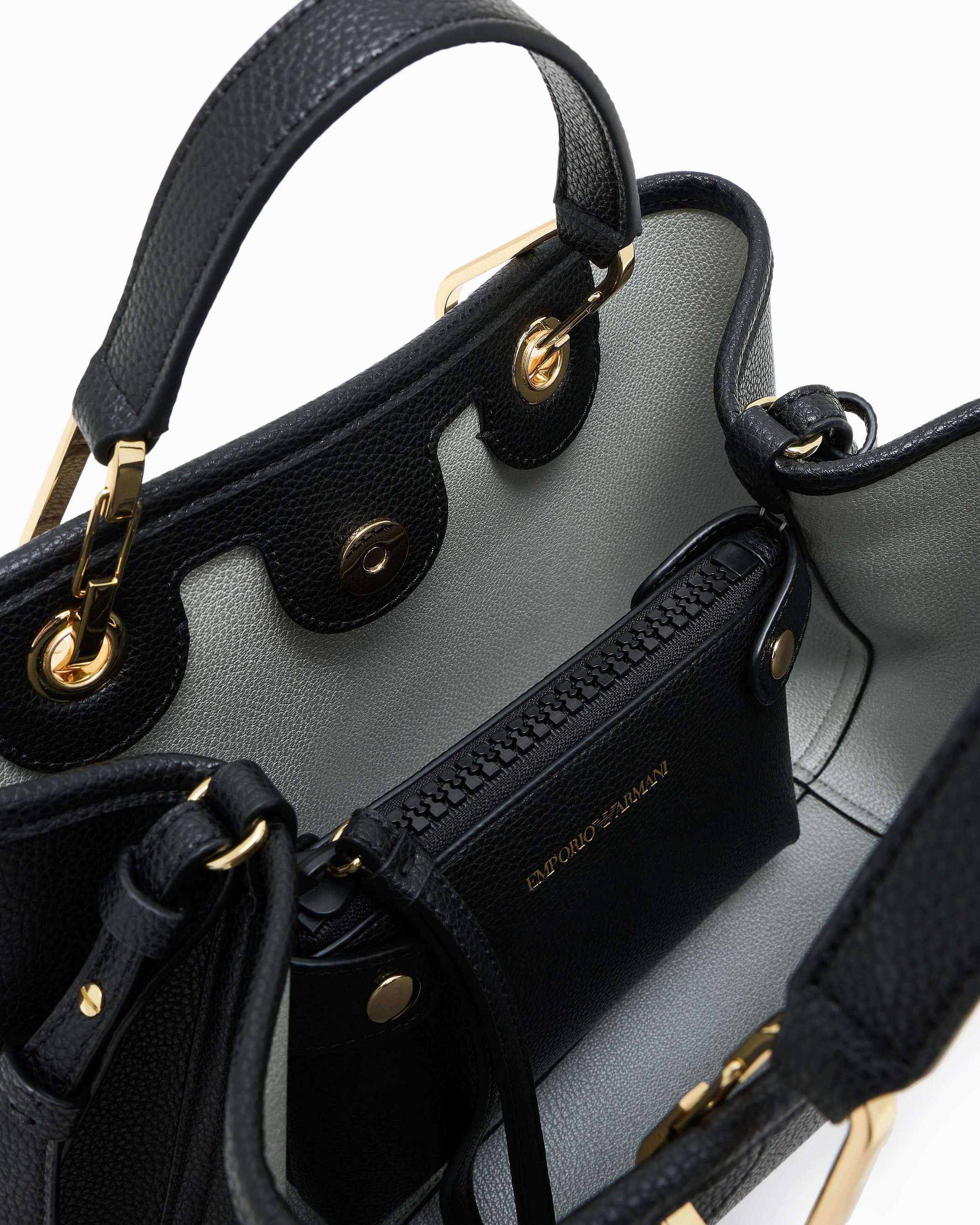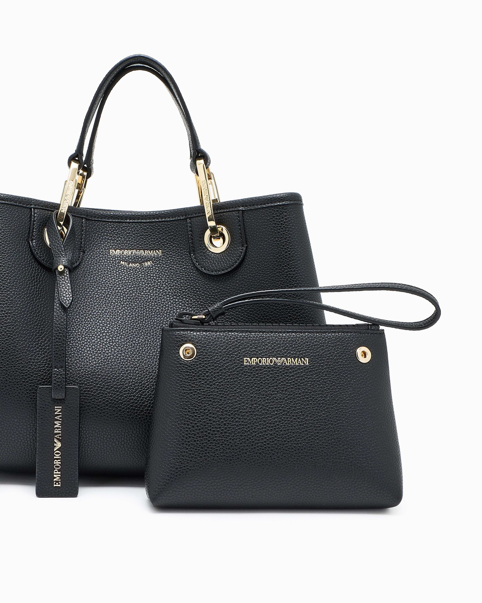 Чорна сумка-шопер Emporio Armani виготовлена з поліуретану на поліестеровій основі, що надає виробу структурованої форми та сучасного вигляду. Магнітна застібка та тиснений логотип доповнюються золотистими карабінами з фірмовою гравіровкою, а знімний ремінець забезпечує комфортне носіння на плечі. У комплекті йде відповідна внутрішня кишеня на блискавці для зручного зберігання дрібниць. Завдяки поєднанню елегантності та функціональності ця сумка Emporio Armani легко вписується у будь-який повсякденний або вечірній образ, доповнюючи стиль вишуканою практичністю.