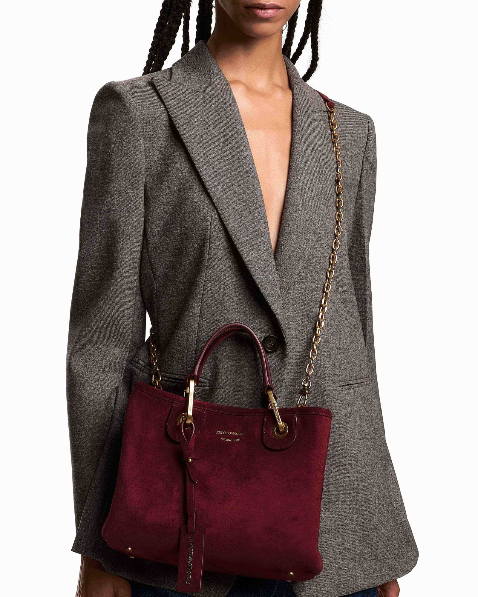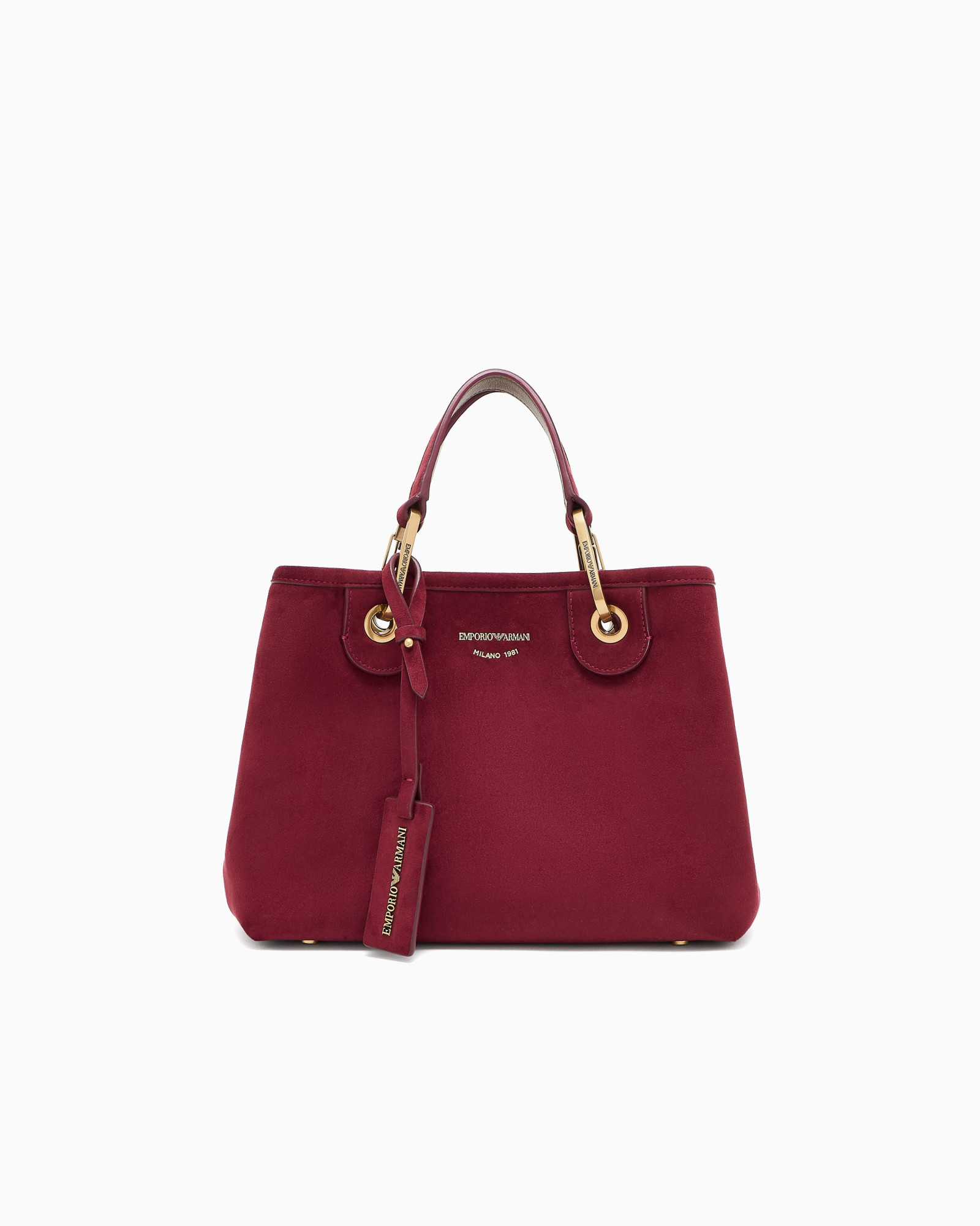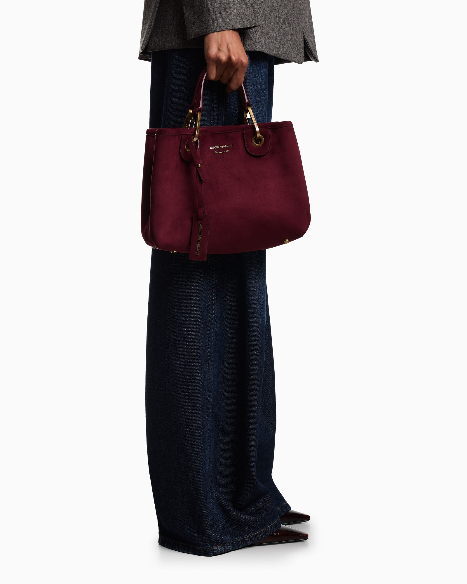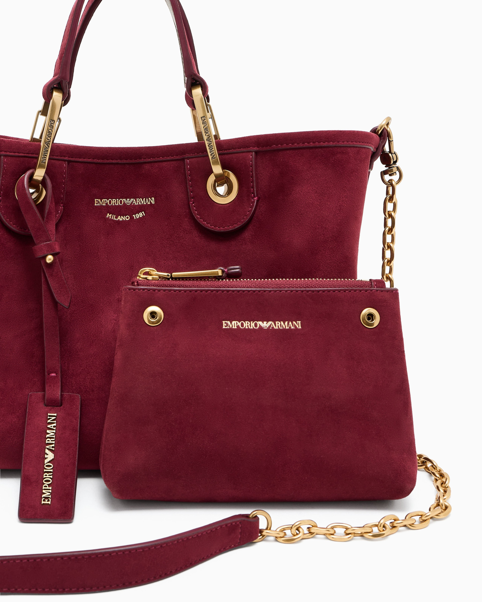 Шопер насиченого червоного кольору з м’якої тканини з ефектом замші, прикрашений декоративною бахромою та магнітною застібкою. Виріб оснащений двома зручними ручками, знімним плечовим ременем із логотипом, а також декоративними застібками з логотипом і бірками з тисненням, що підкреслюють фірмовий стиль. Всередині розташована знімна косметичка на блискавці, яка ідеально поєднується з основним кольором сумки.