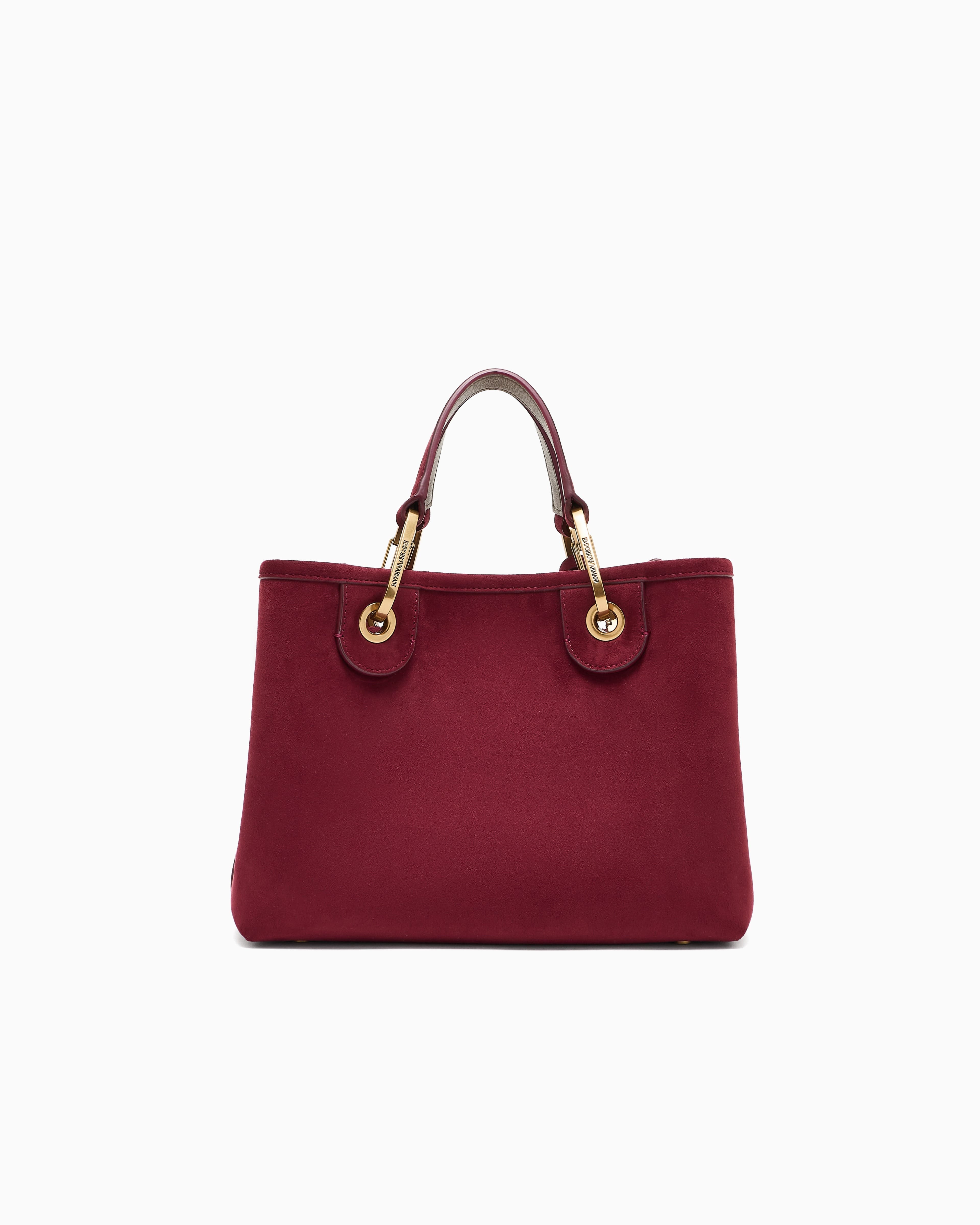 Шопер насиченого червоного кольору з м’якої тканини з ефектом замші, прикрашений декоративною бахромою та магнітною застібкою. Виріб оснащений двома зручними ручками, знімним плечовим ременем із логотипом, а також декоративними застібками з логотипом і бірками з тисненням, що підкреслюють фірмовий стиль. Всередині розташована знімна косметичка на блискавці, яка ідеально поєднується з основним кольором сумки.