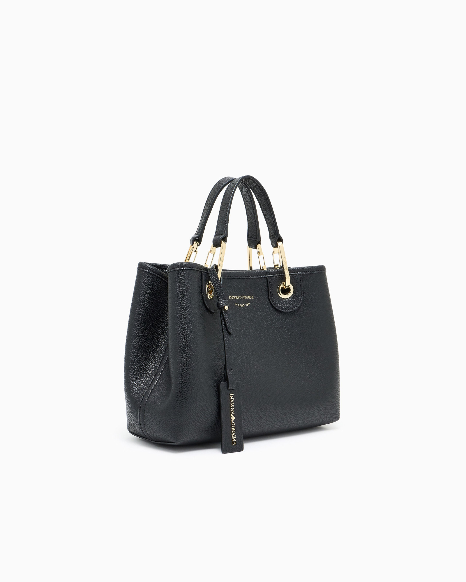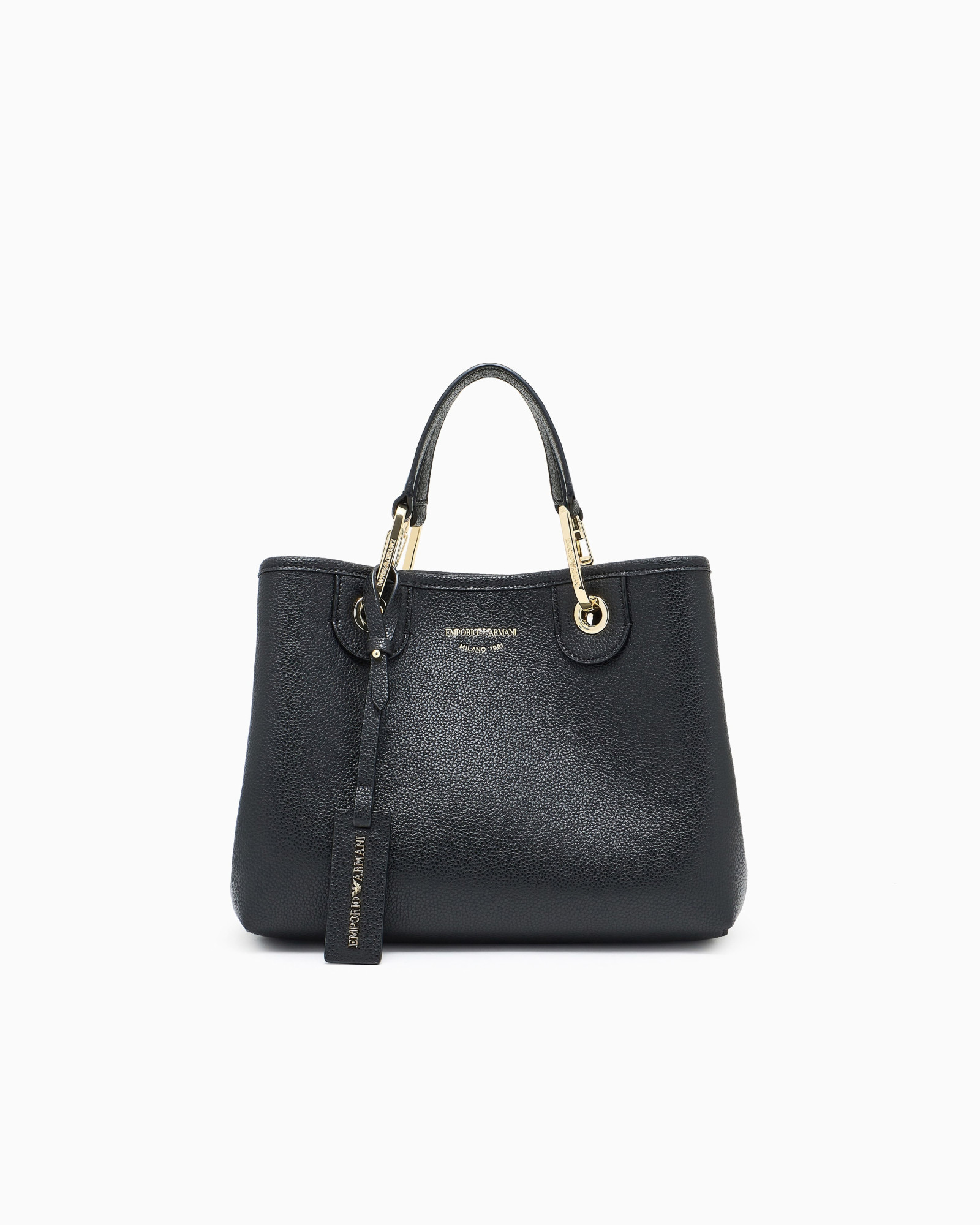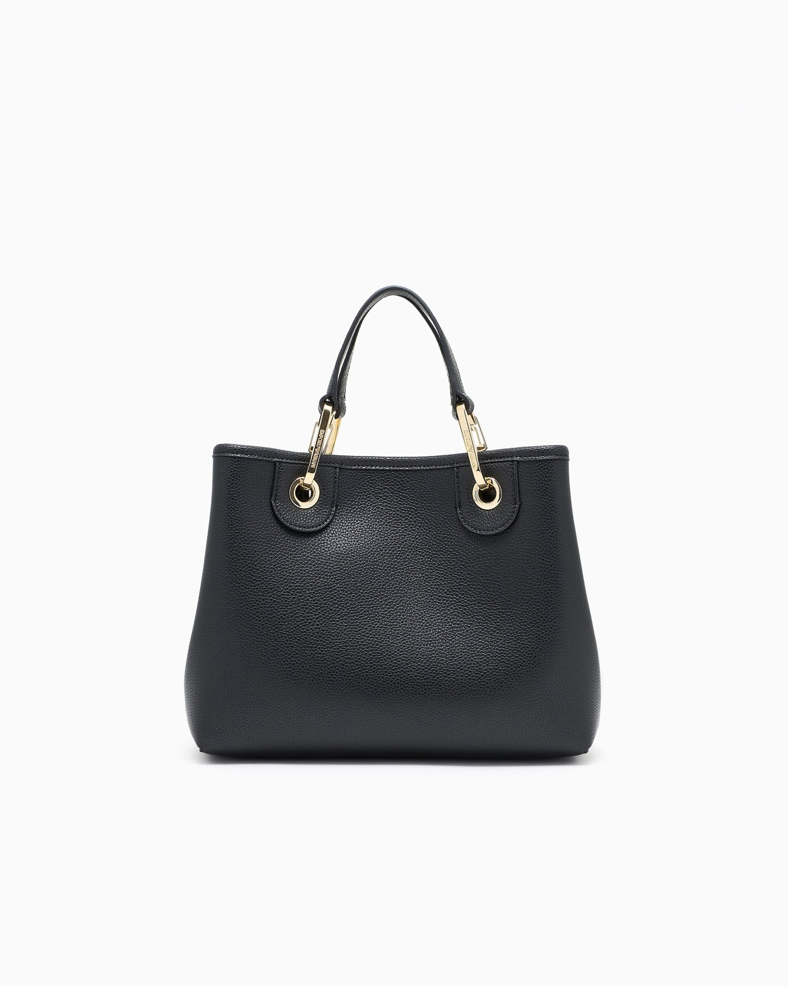 Шопер чорного кольору з оздобленням під оленячий принт і шовкотрафаретним логотипом — лаконічний виріб розміром 26×20×10 см із термополіуретану, доповнений внутрішньою косметичкою на блискавці в тон. Золотисті карабіни й тиснені логотипи на знімних бірках підкреслюють стриману елегантність. Дві ручки та знімний плечовий ремінець з логотипом забезпечують комфорт у щоденному використанні.