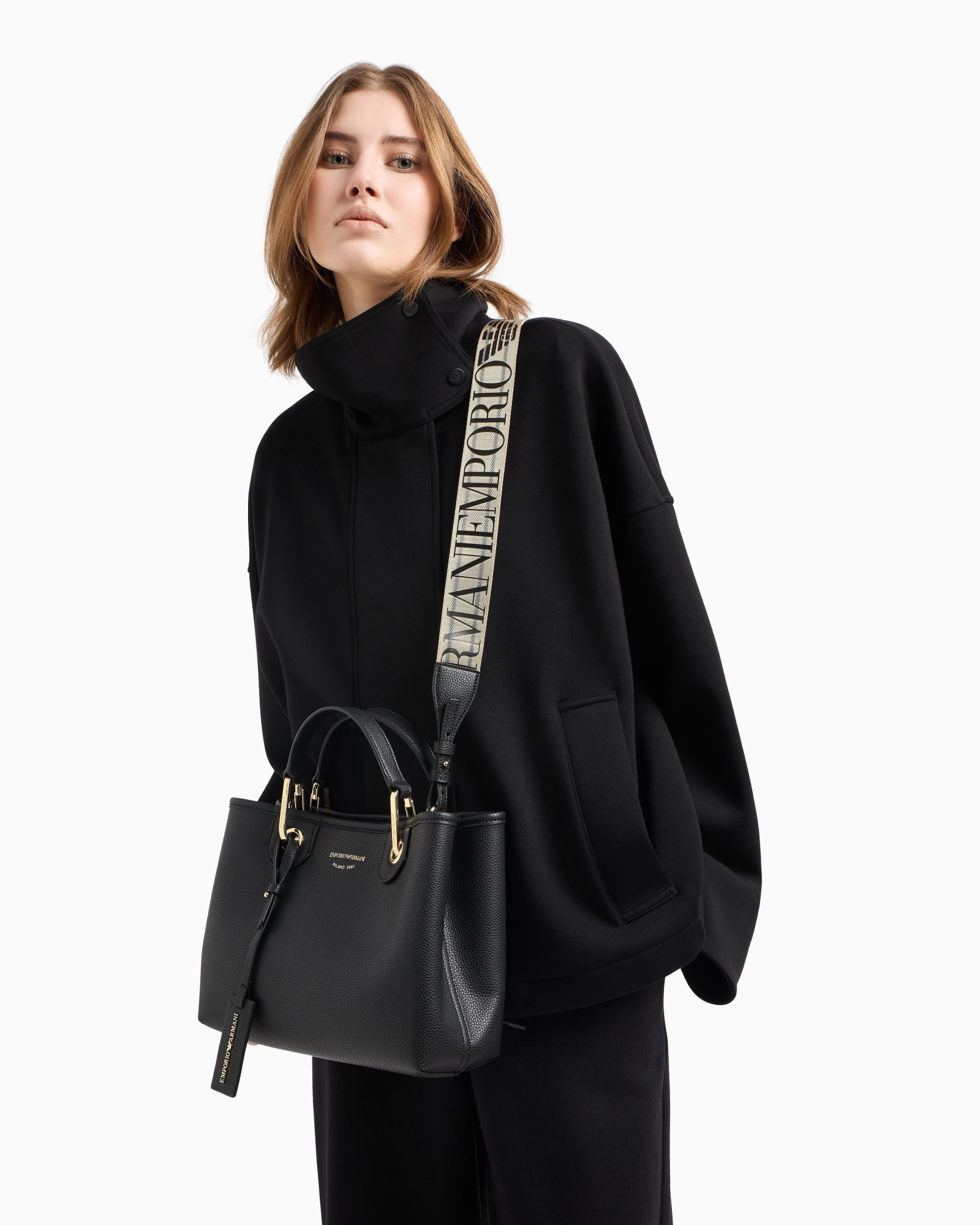 Доречно поєднується з пальтами, прямими штанами, монохромними луками та лаконічним взуттям. Образ завершує аксесуар, у якому поєднано функціональність і актуальний стиль.