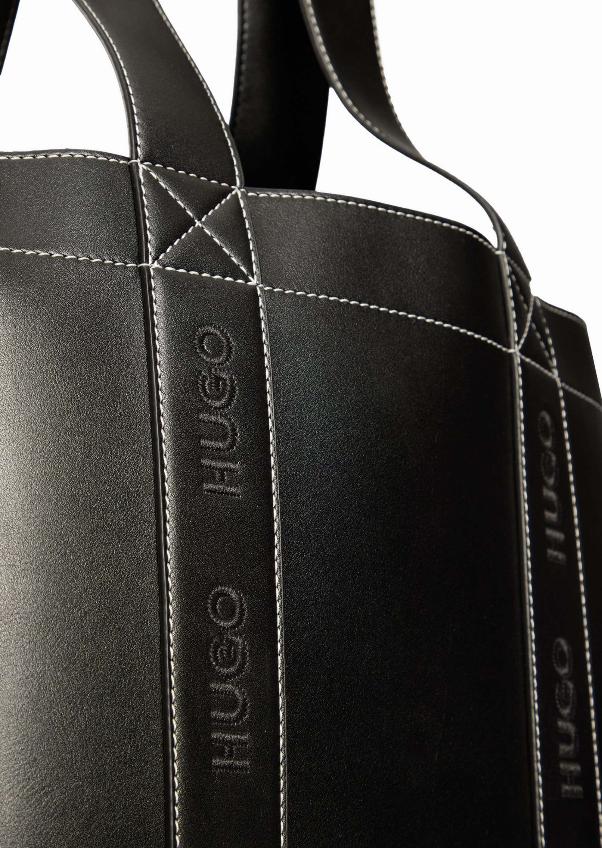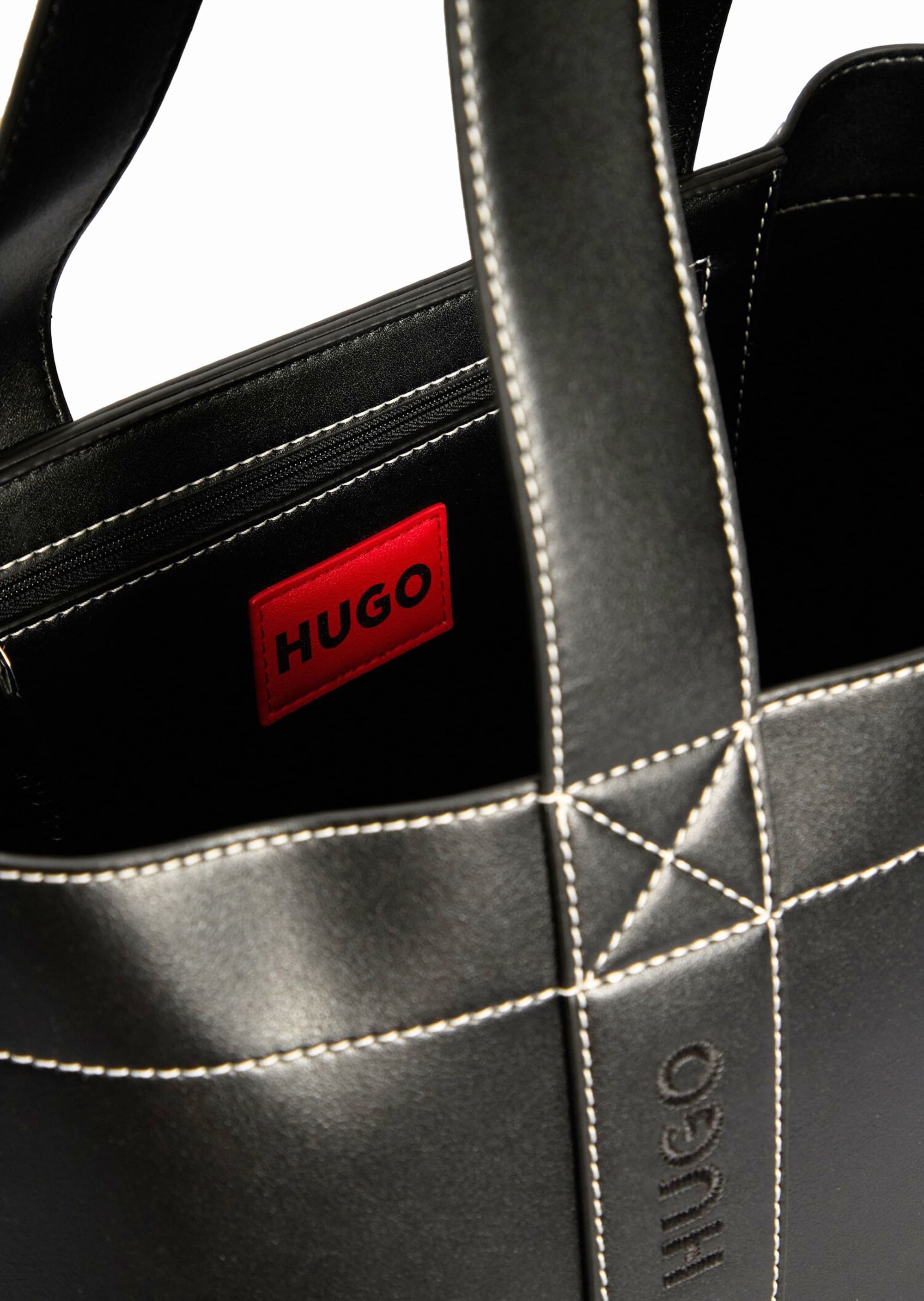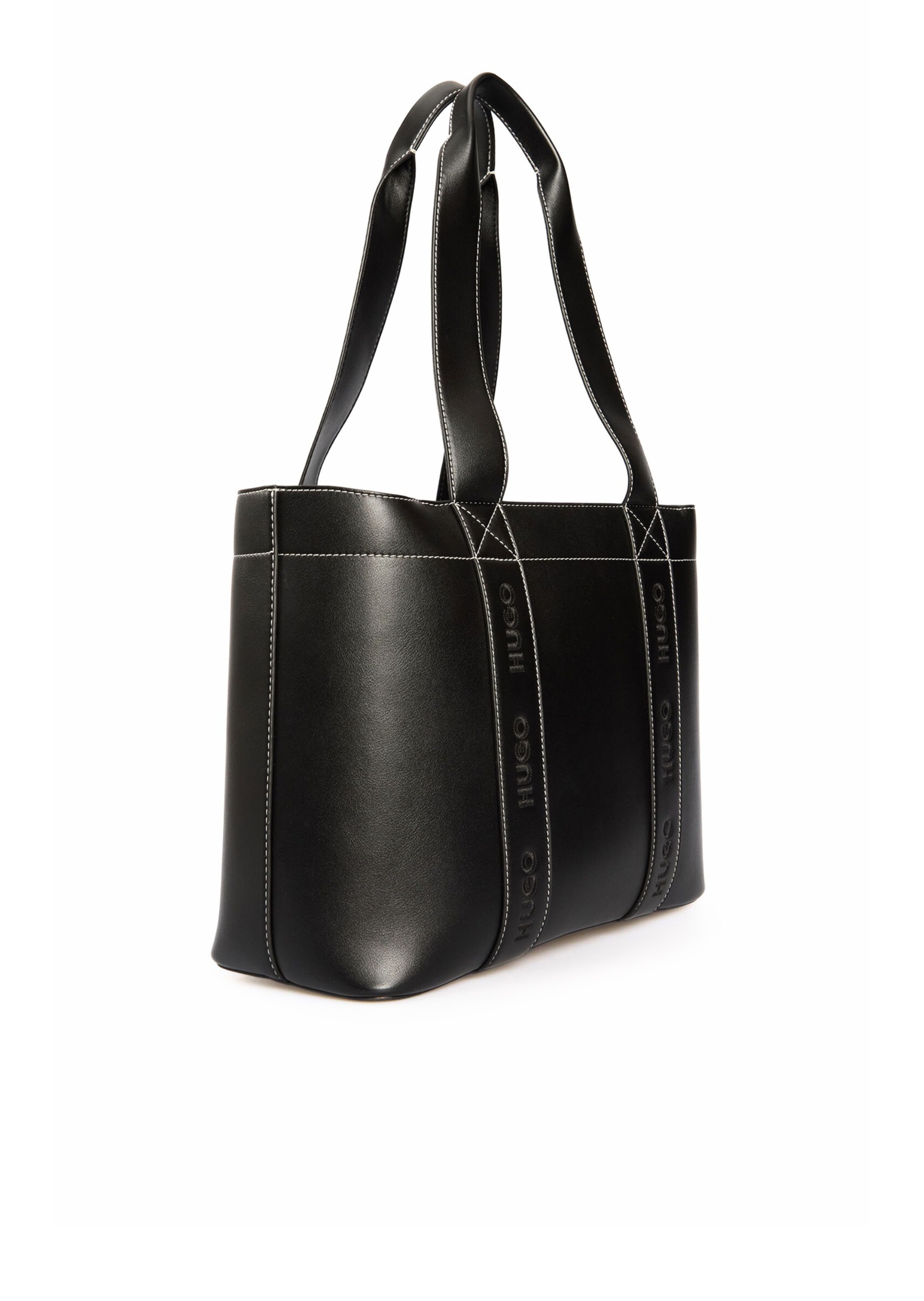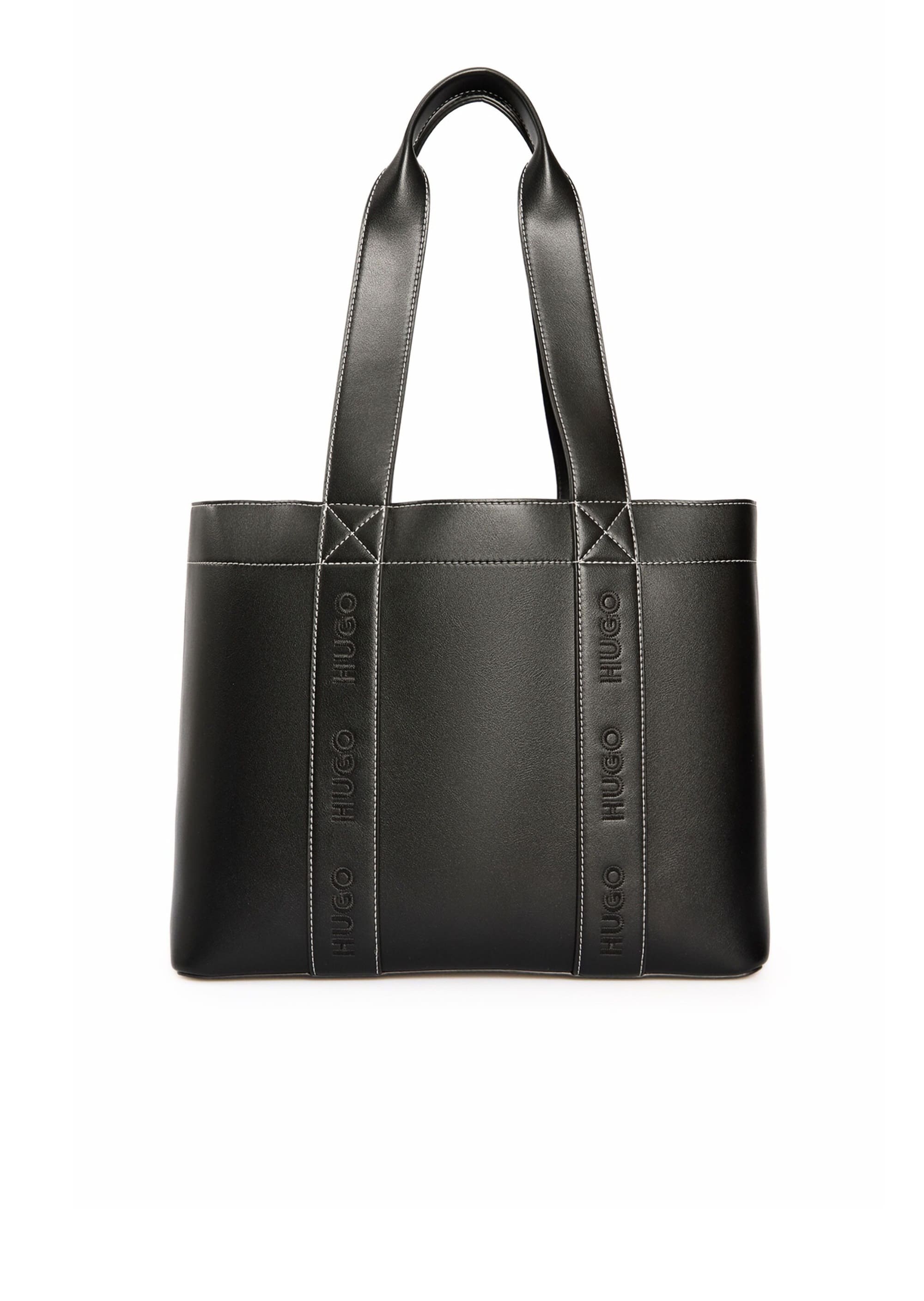 Сумка HUGO чорного кольору виготовлена з екошкіри з благородною матовою фактурою, створюючи універсальну й міцну основу. Тонка вишивка логотипу в тон додає виробу стриману брендовість без зайвого декору. Відкрите верхнє відділення та подвійні ручки забезпечують зручний доступ і щоденне використання. Просторий об’єм доповнюється витонченою сріблястою фурнітурою, яка зберігає чистоту силуету. Сумка HUGO стає стильною та практичною основою для busy day образів, об’єднуючи мінімалістичність із функціональністю.