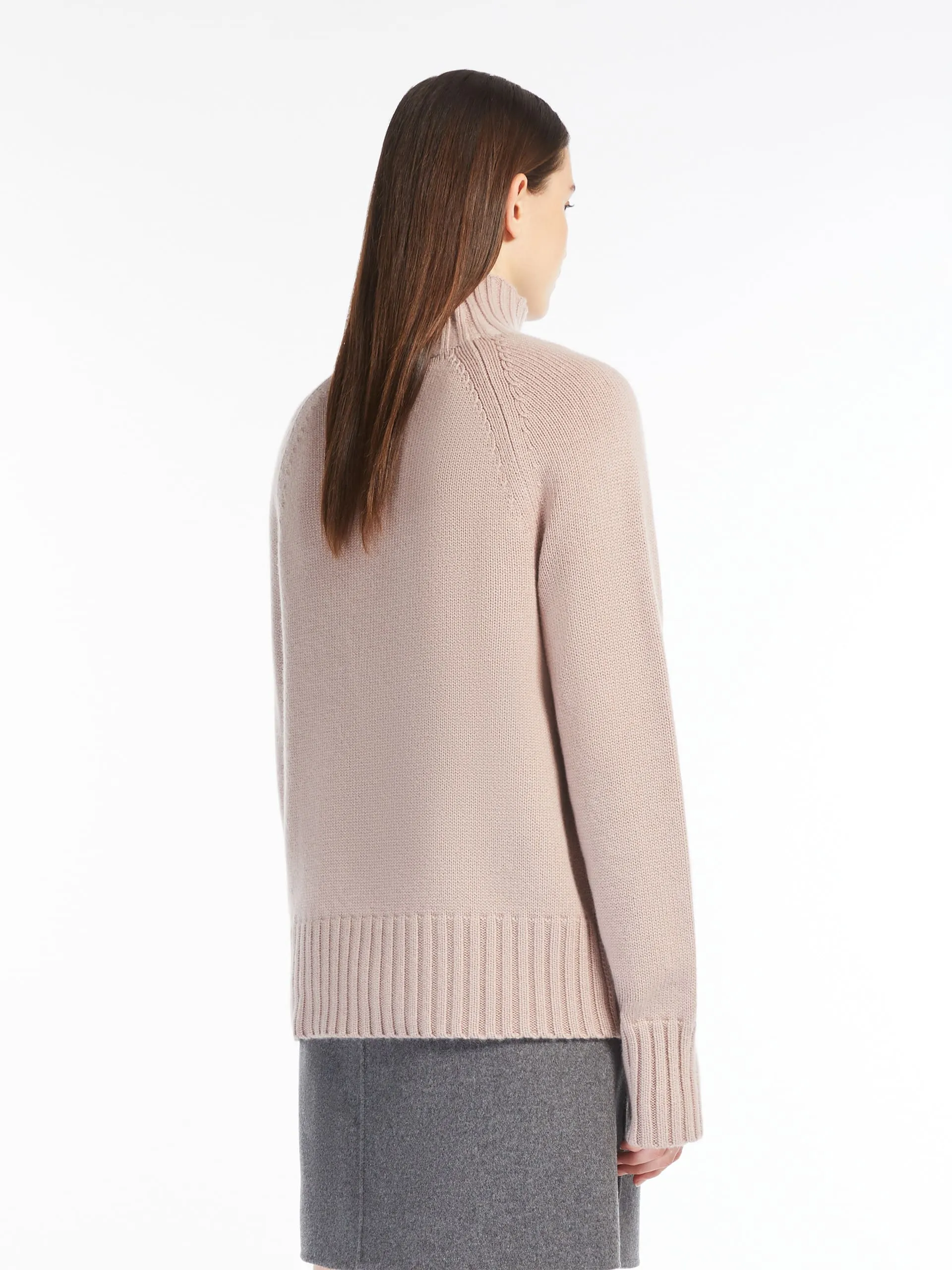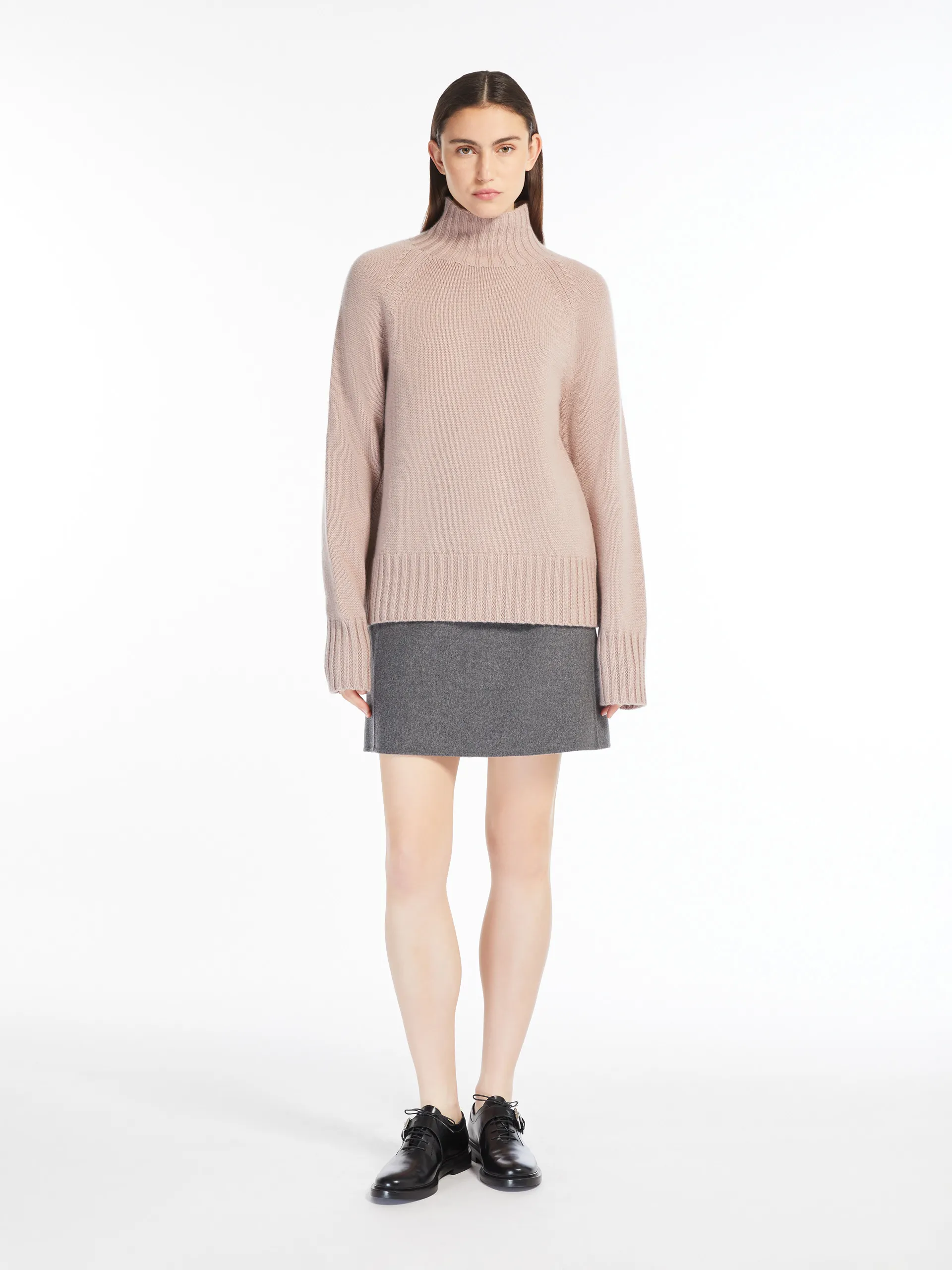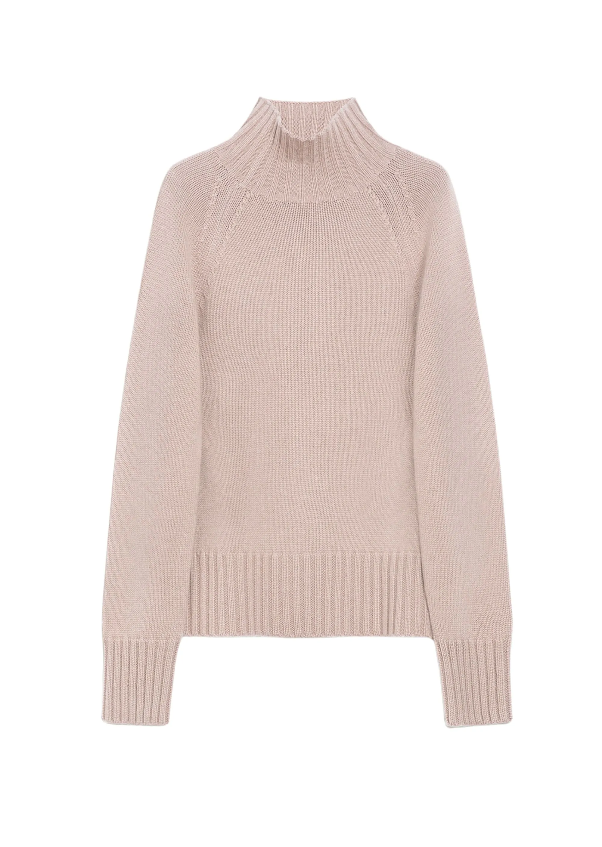 Водолазка з розкішної пряжі з вовни та кашеміру. Мінімалістський дизайн доповнений ребристими краями, коміром та манжетами з контрастною облямівкою, а також довгими рукавами реглан.