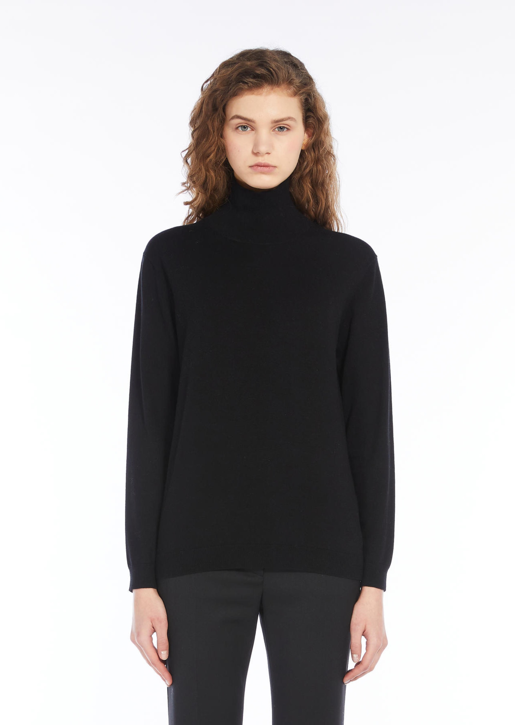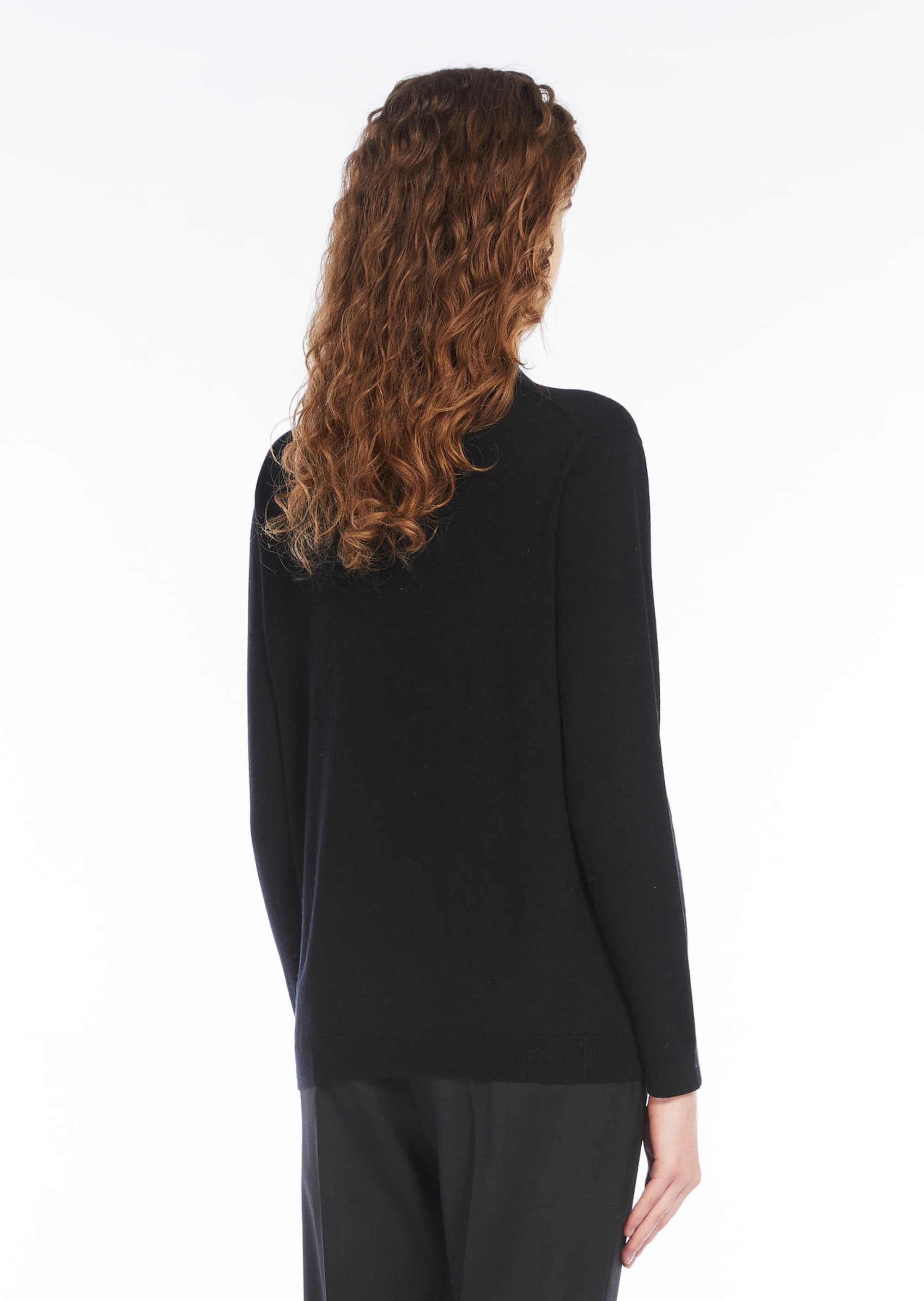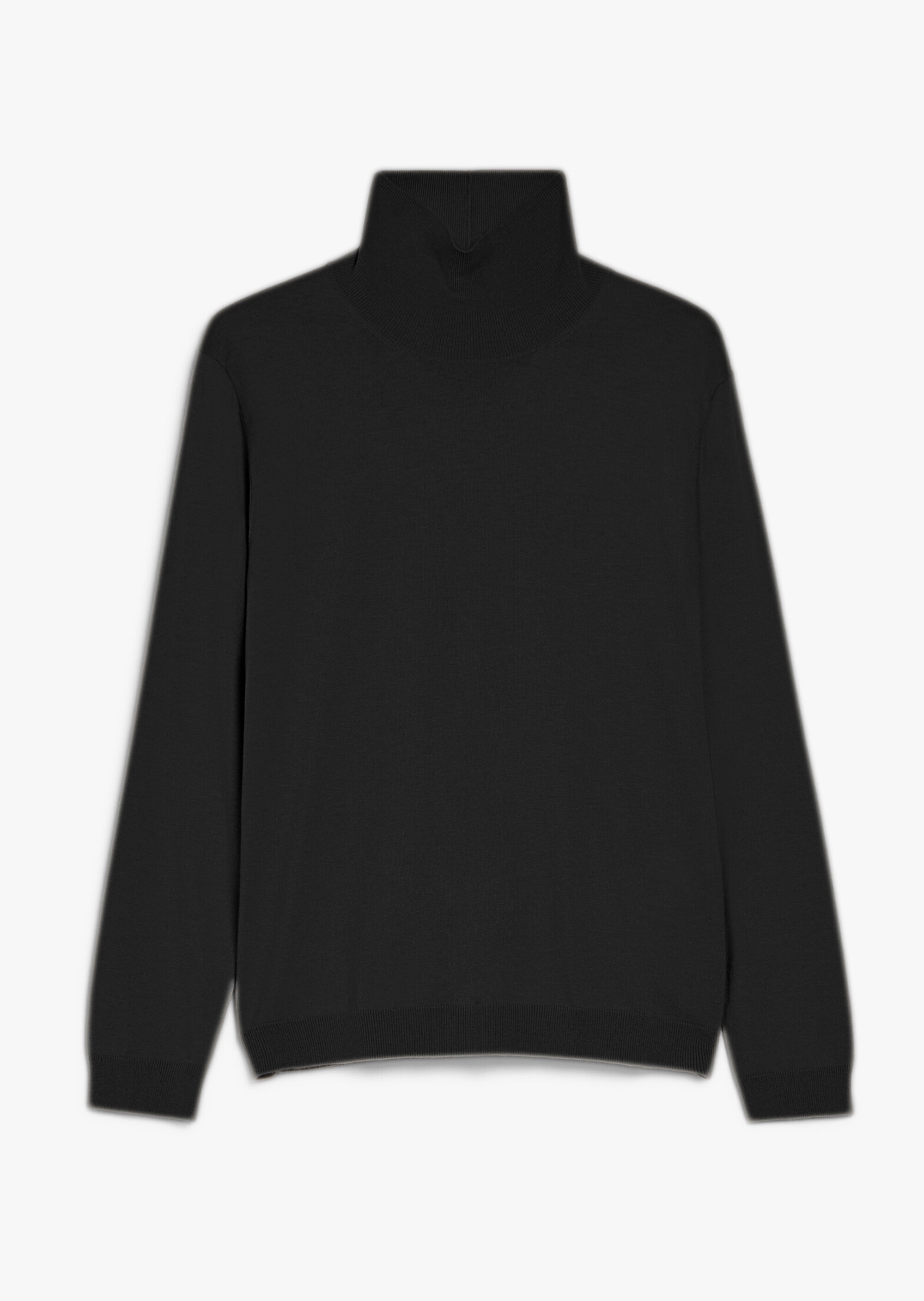 Джемпер з коміром-поло трикотажної вишивки, виконаний з тонкої шовкової та вовняної пряжі. Модель вільного крою, має високий комір, довгі втачні рукави та обробку гумкою.