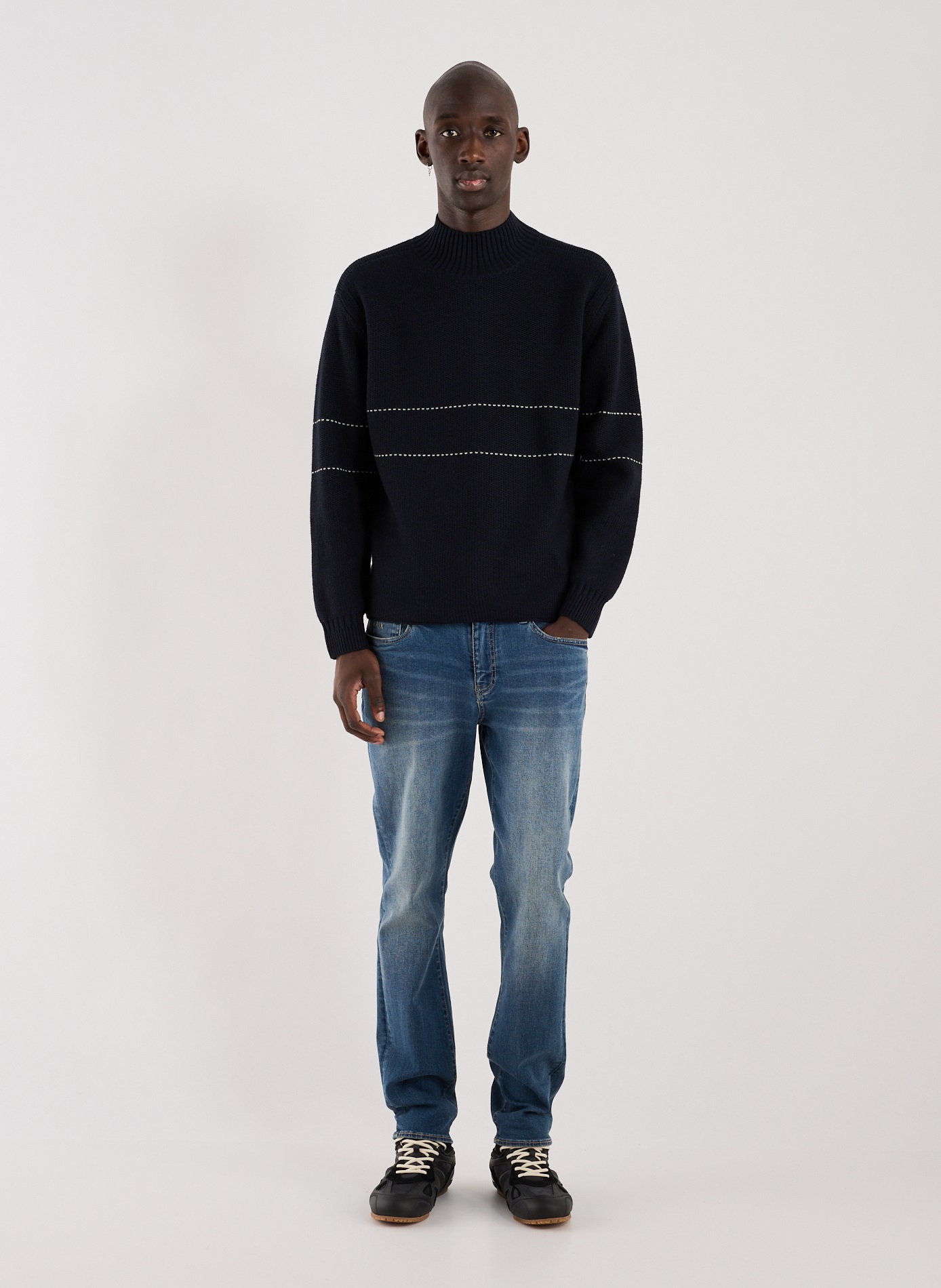 Стильний светр Emporio Armani, модель із змішаної вовни, що ідеально підходить для осінньо-зимового сезону, відрізняється сітчастим ефектом, класичним кроєм і високим коміром. Светр виконаний у класичному темно-синьому кольорі та прикрашений двома горизонтальними смужками спереду та на рукавах.