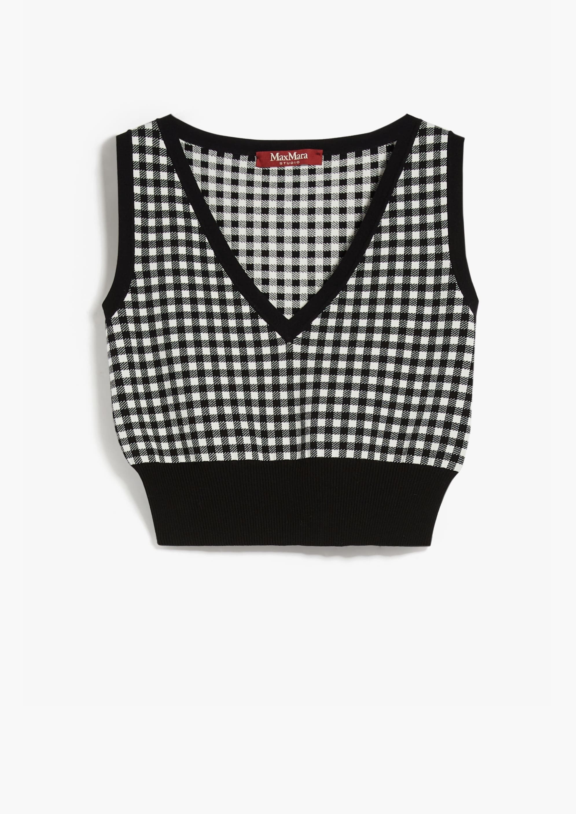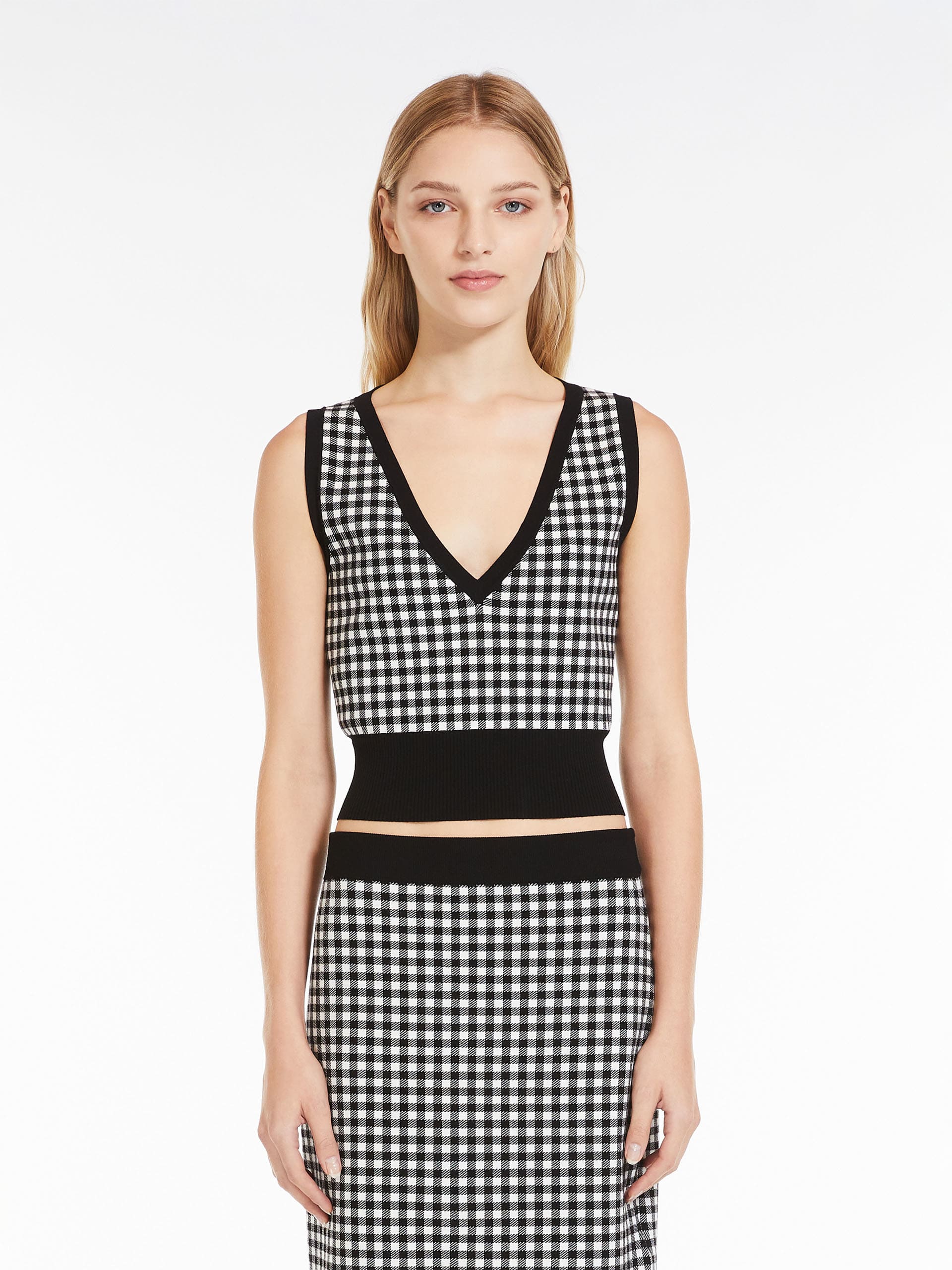 Топ без рукавів з еластичної віскози з тонким двоколірним жаккардовим трикотажем. Цей виріб має V-подібний виріз і трикотажні елементи в рубчик.