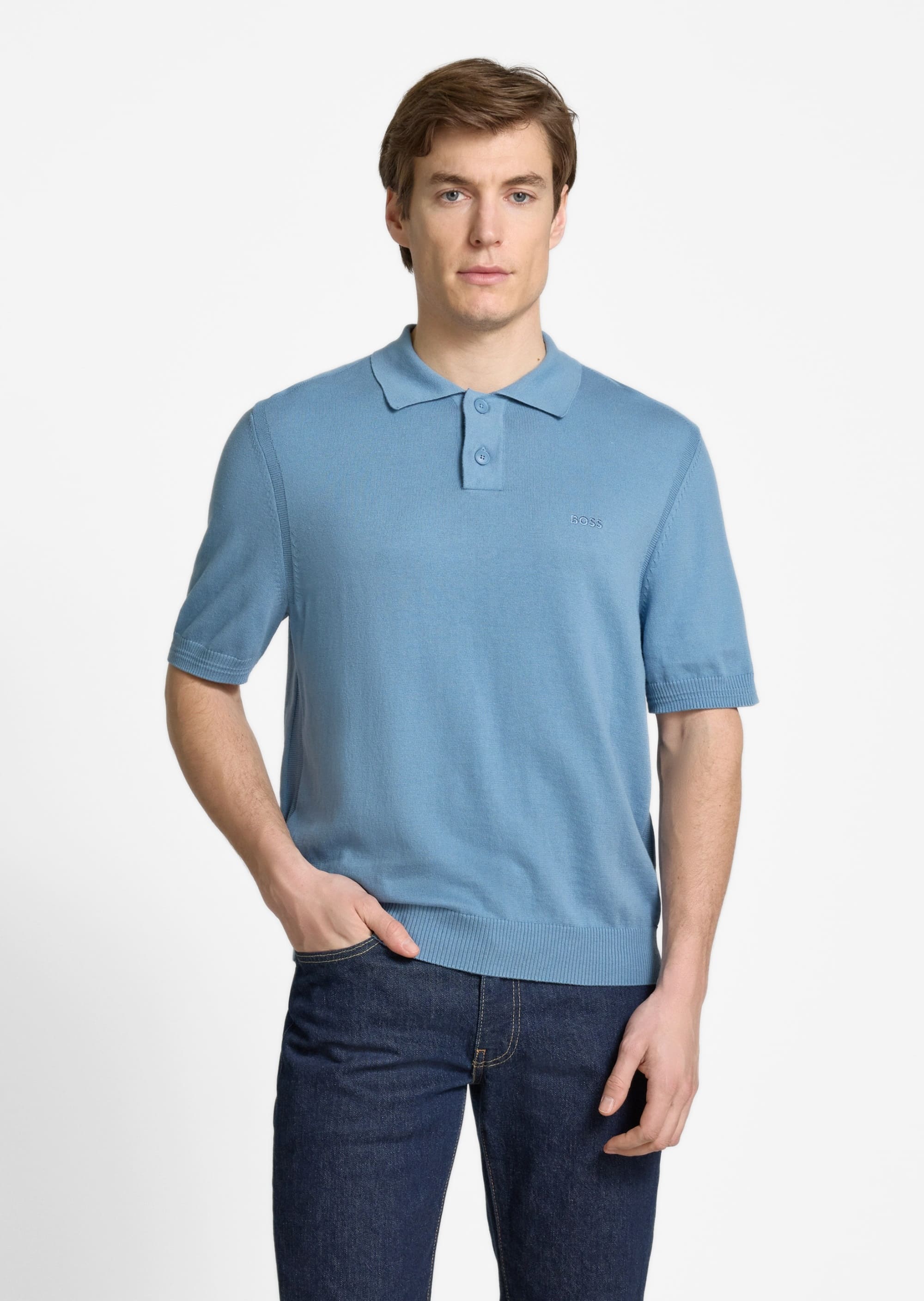 Поло синього кольору виготовлено з м’якого трикотажу з високим вмістом бавовни. Прямий крій із класичним коміром і планкою на два ґудзики доповнений короткими рукавами з еластичною обробкою. Мінімалістичний дизайн підкреслено вишитим логотипом на грудях. Поєднується з джинсами, шортами, брюками у невимушених образах. Універсальна річ повсякденного гардероба з акцентом на зручність і стриманий стиль.