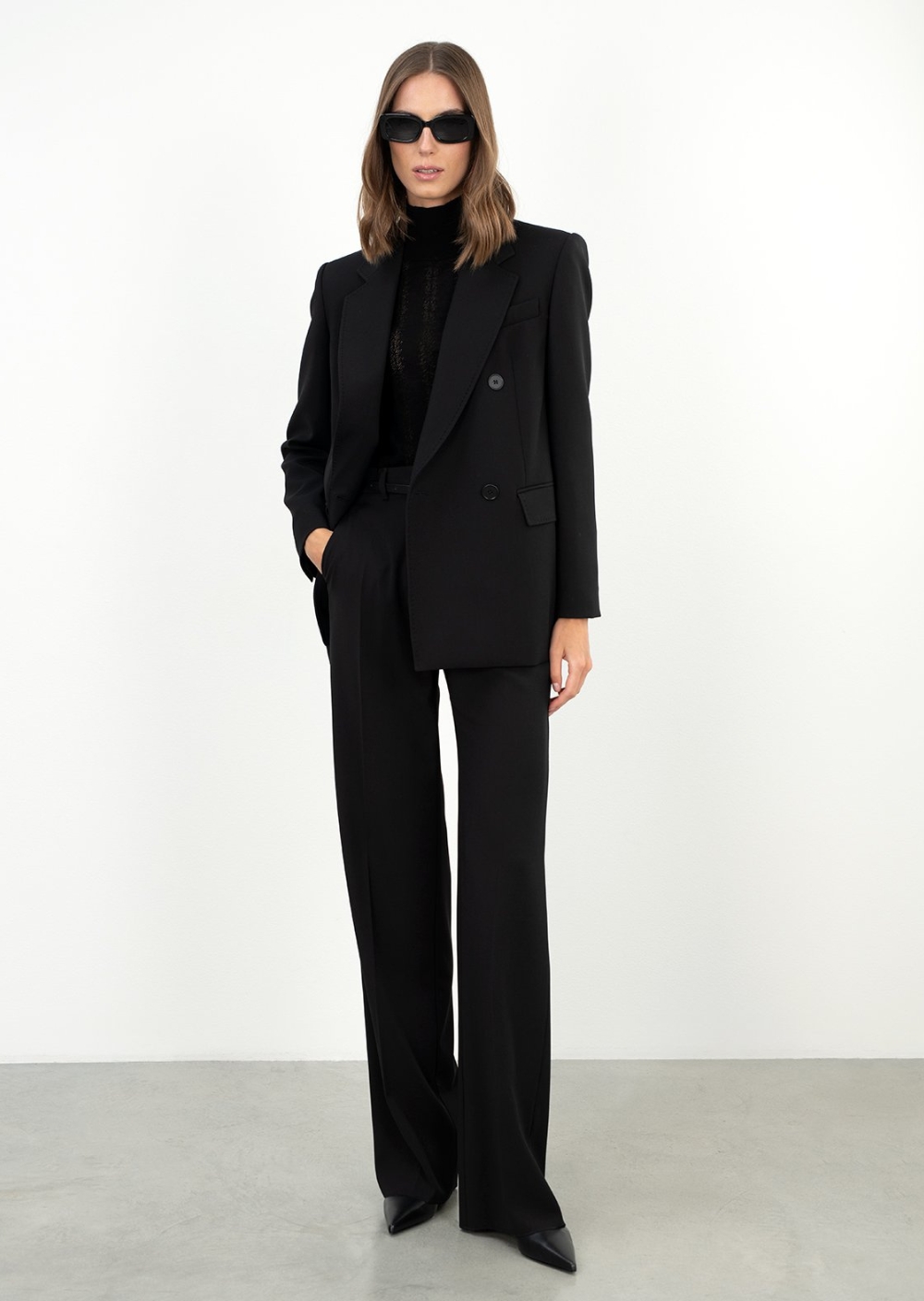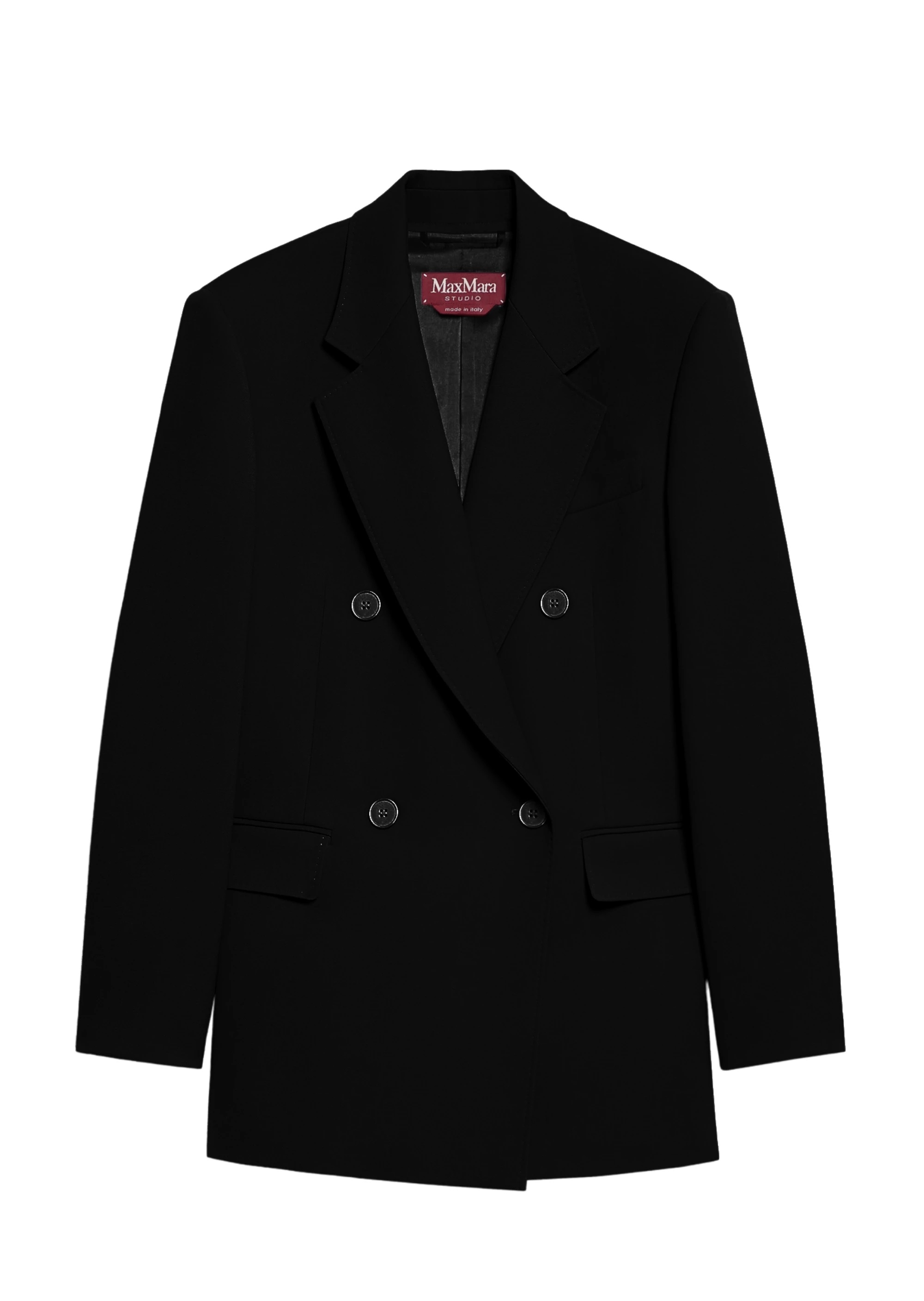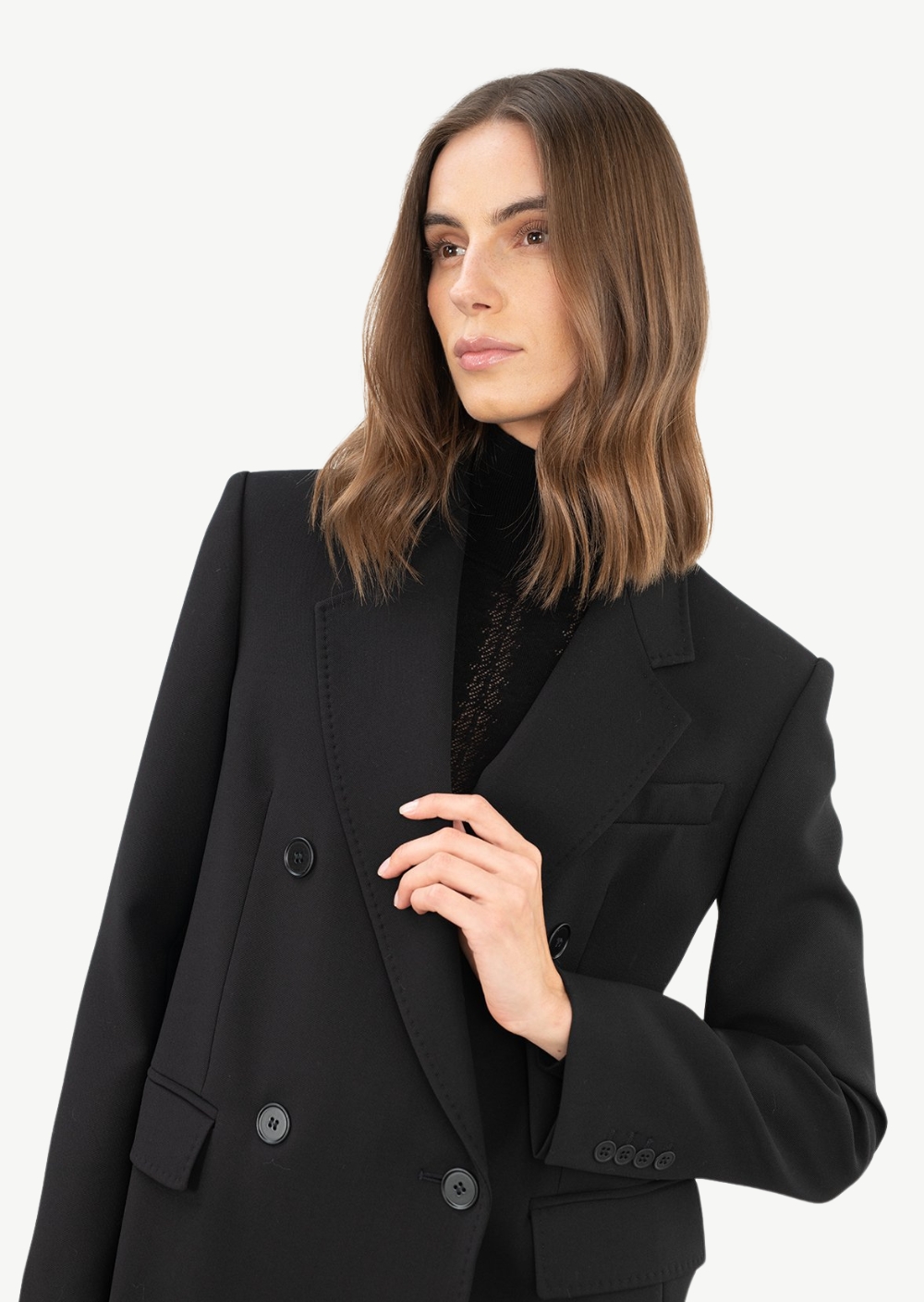 Двобортний блейзер оверсайз із високоякісного вовняного креп-сатину. Зручна модель з подовженими лацканами, довгими рукавами втачними і кишенями з накладними клапанами спереду. Підкладка, нагрудна кишенька та шліця по центру ззаду. Застібка на гудзики.