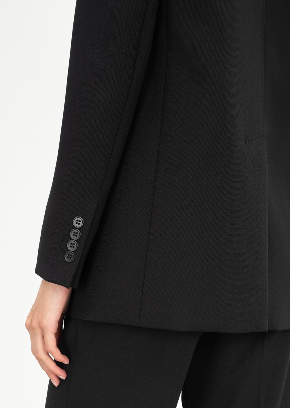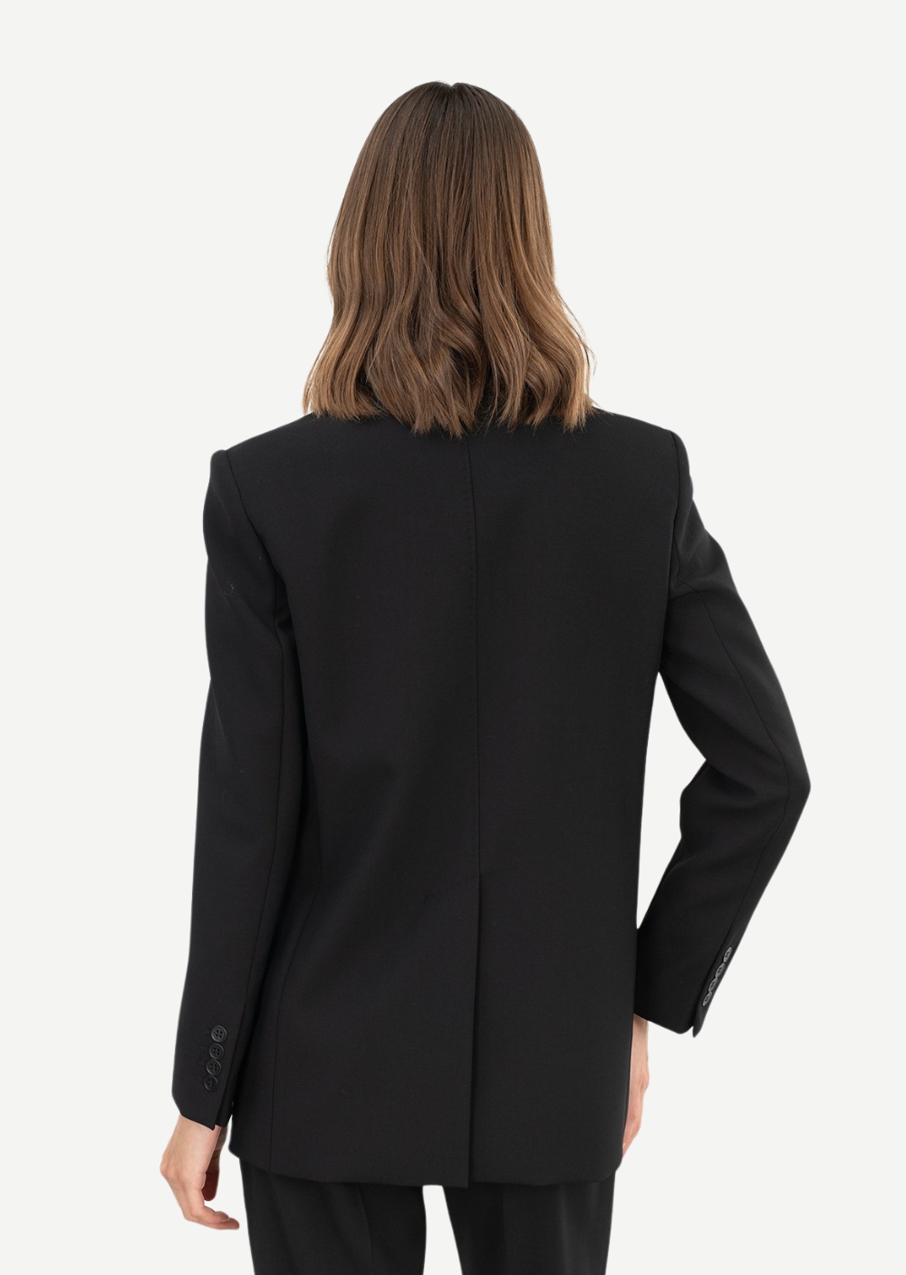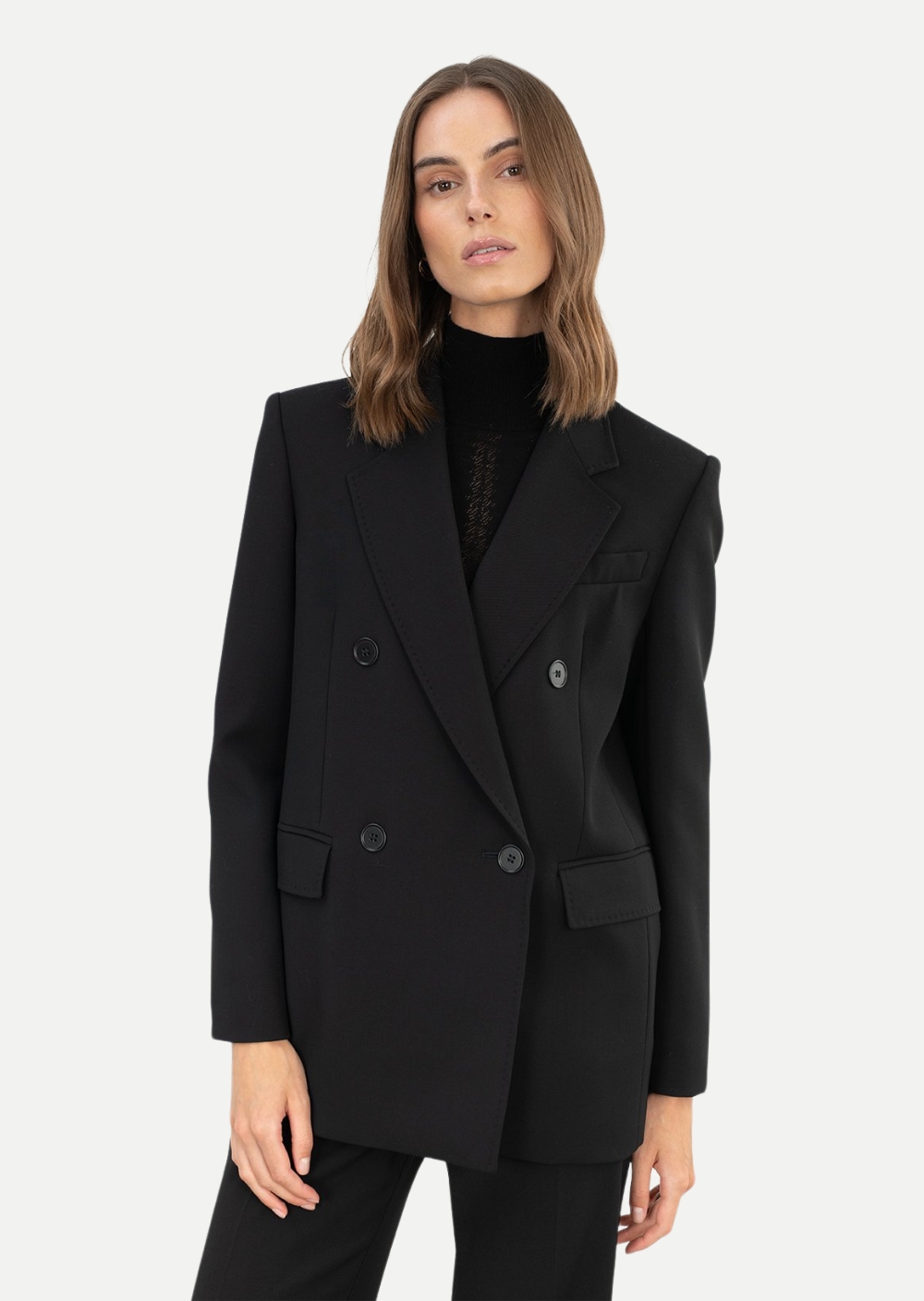 Двобортний блейзер оверсайз із високоякісного вовняного креп-сатину. Зручна модель з подовженими лацканами, довгими рукавами втачними і кишенями з накладними клапанами спереду. Підкладка, нагрудна кишенька та шліця по центру ззаду. Застібка на гудзики.