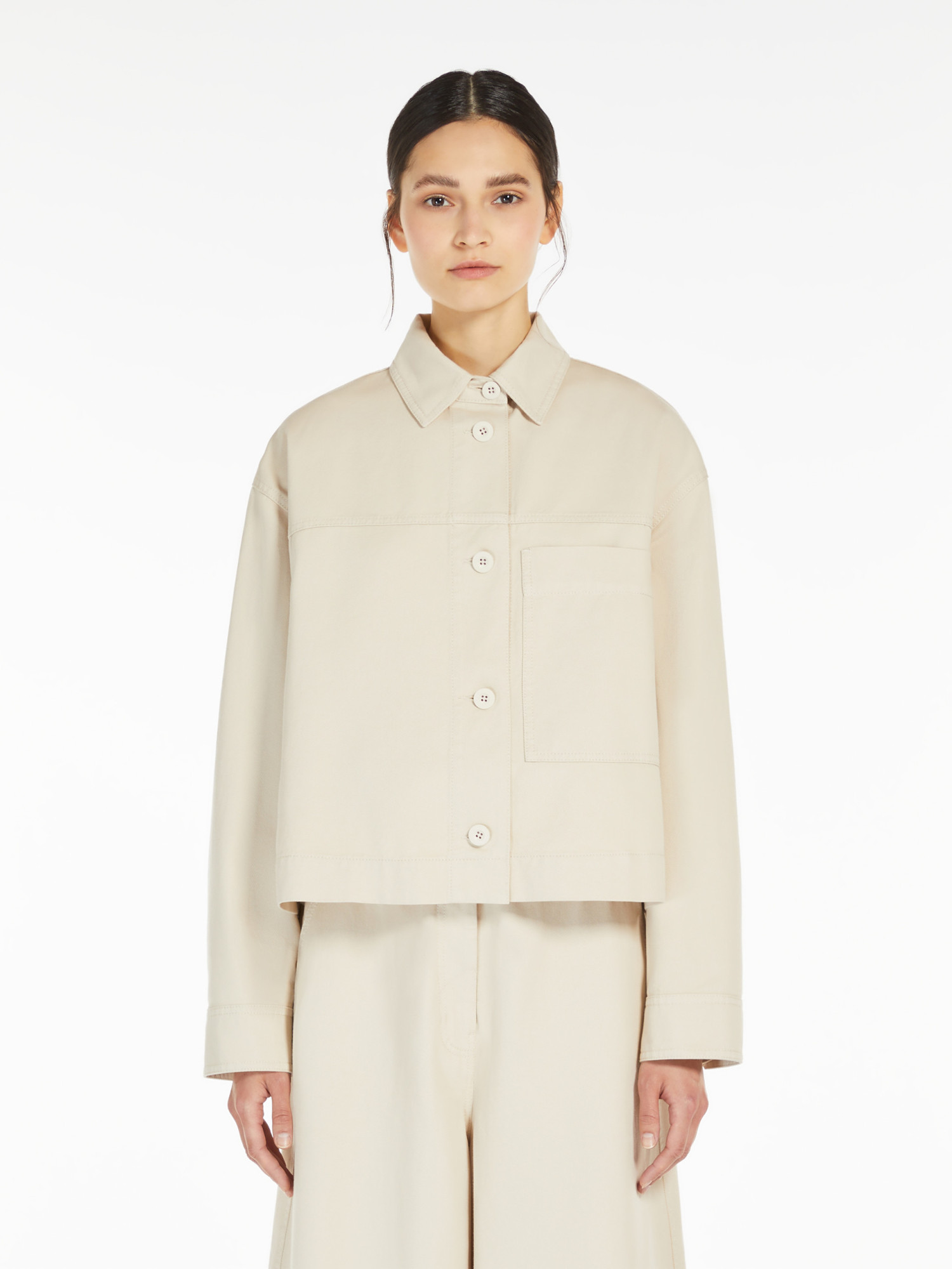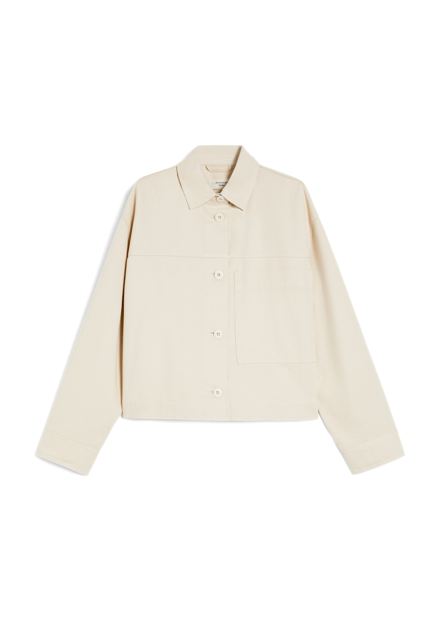 Куртка виготовлена із бавовни. Модель комфортного крою зі спущеними плечима, коміром-стійкою, накладною нагрудною кишенею, довгими рукавами з краями, що застібаються на ґудзики, і відстроченою виточкою спереду і ззаду.