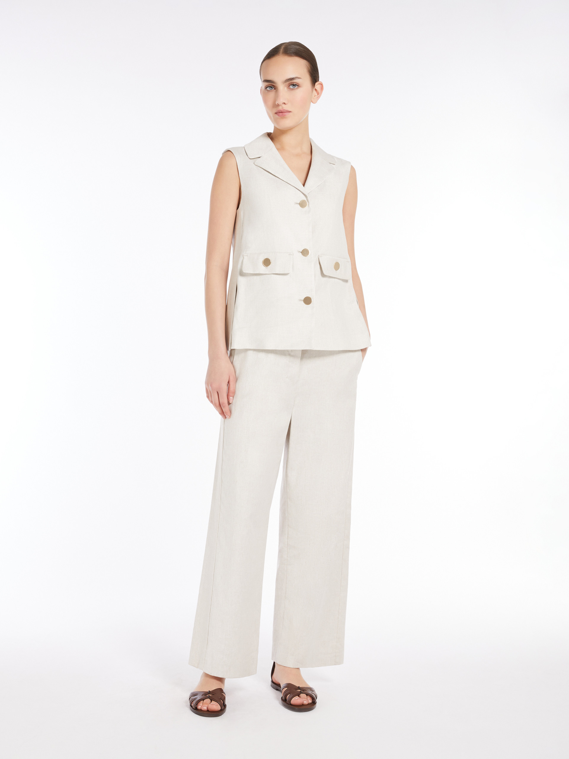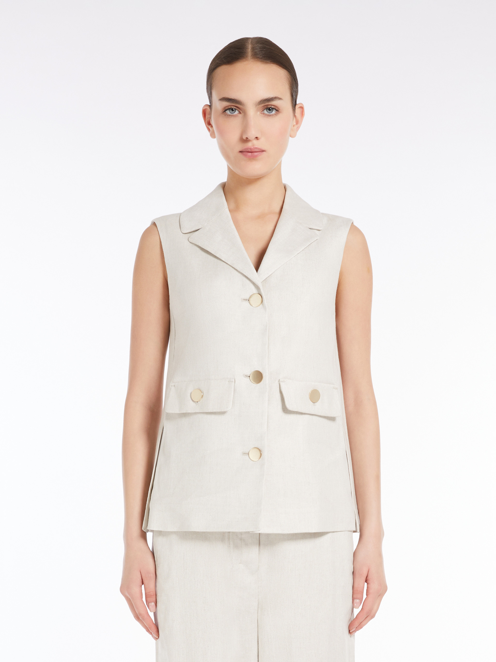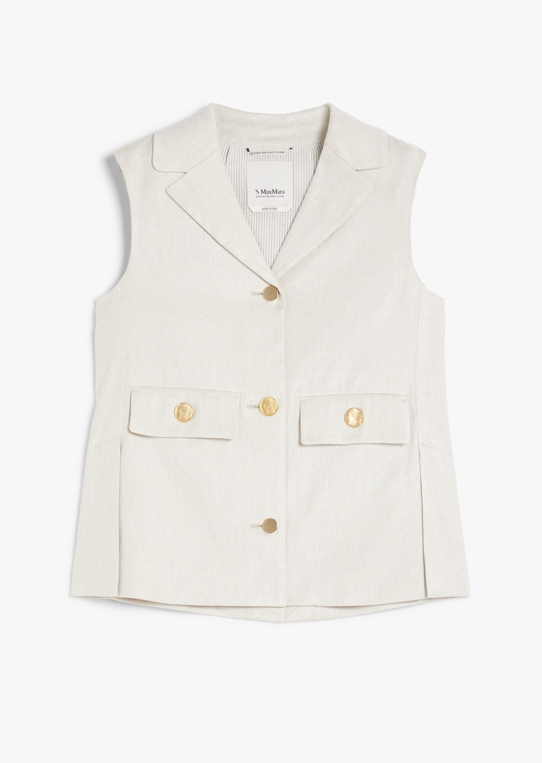 Жилет Max Mara S — елегантна інтерпретація класичного силуету, створена для літнього гардероба. Модель виготовлена зі суміші віскози і льону та модалу з додаванням еластану, що забезпечує легкість, мякість і комфорт у носінні. Натуральний бежевий колiр надає універсальності та витонченості образу. Деталі включають лацкани, застібку на ґудзики, накладні кишені та бокові розрізи, що підкреслюють функціональність виробу. Цей жилет легко поєднується з брюками, спідницями або сукнями, дозволяючи створювати різноманітні стильні комбінації. Жилет Max Mara S — ідеальний вибір для тих, хто цінує поєднання комфорту, якості та витонченого стилю.