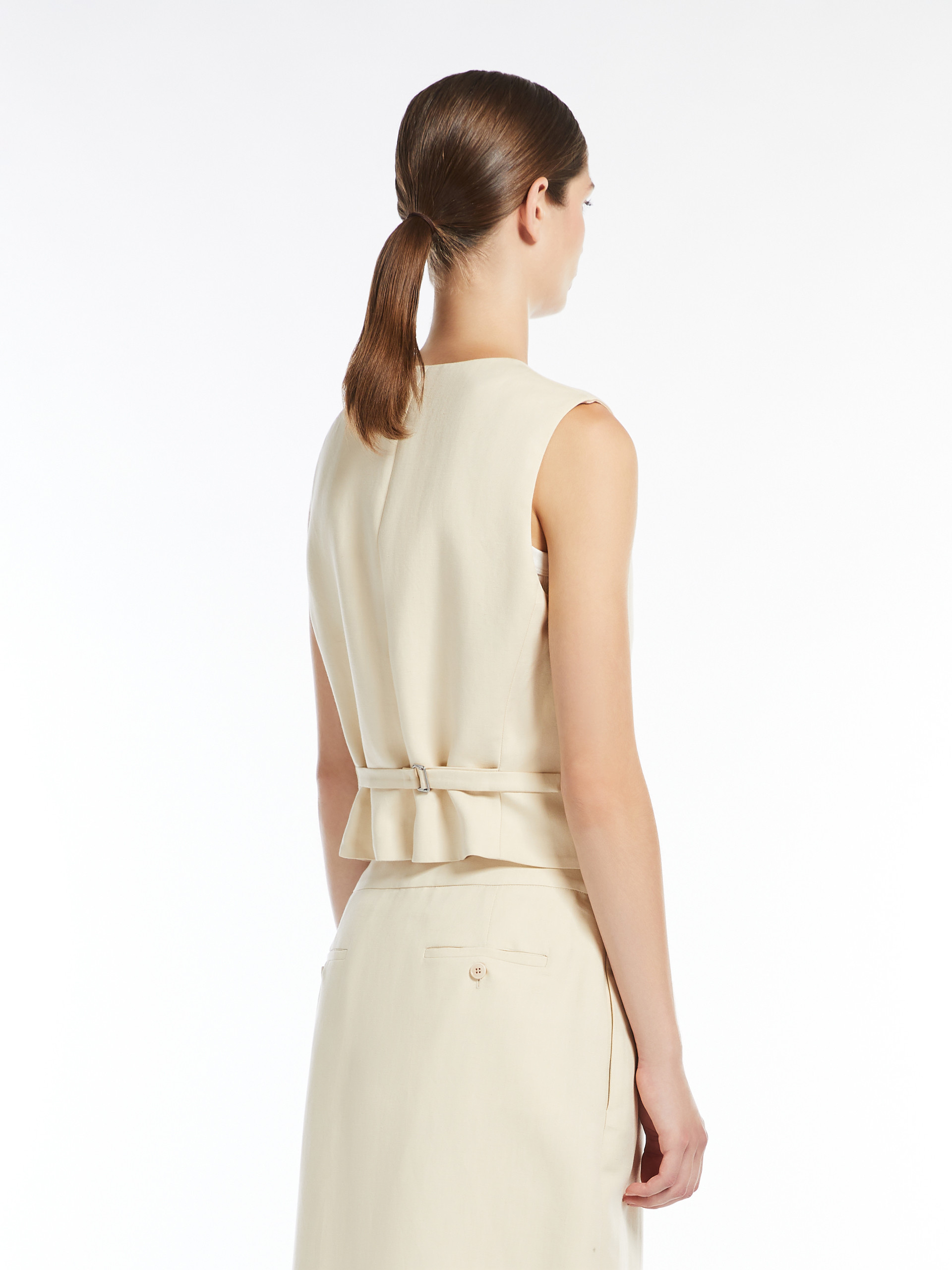 Жилет Max Mara Weekend виготовлений із сумішового віскози льону, що забезпечує комфорт і легкість. Модель без рукавів із застібкою на ґудзики формує елегантний і водночас стриманий образ. Бежевий колір робить виріб універсальним для поєднання з різними елементами гардероба. Жилет ідеально підходить для створення стильних і стриманих ансамблів як на кожен день, так і для більш офіційних випадків.